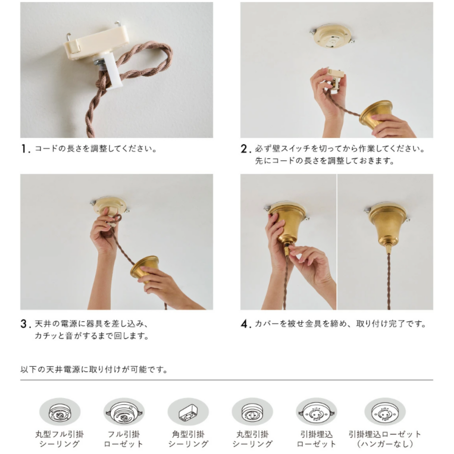 10センチから90センチまでコード調整可能です。調整したコードは真鍮の天井カバーに隠すことが可能です。