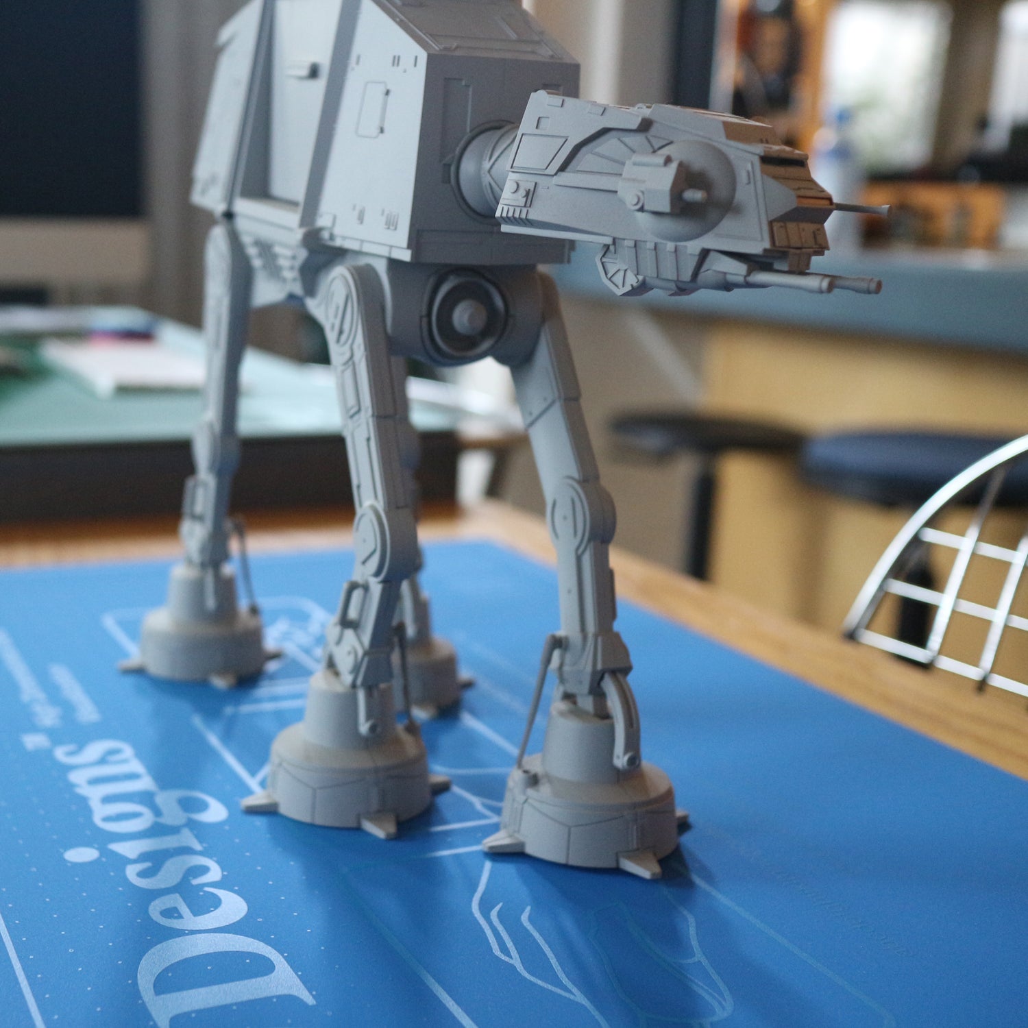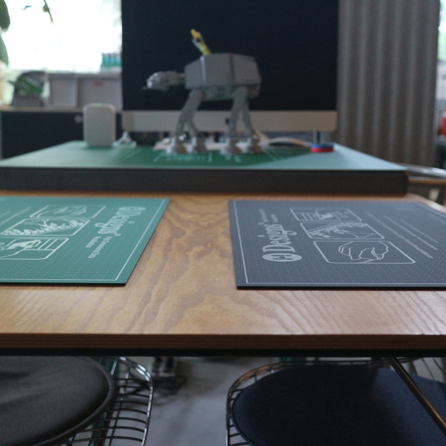 ハイロックデザインオフィス用に開発した特大のデスクマット。デザインという職業柄、日常的に机の上で作業や工作を行っていて、その度にカッターマットを出したりしまったりするのは面倒くさいと思い、だったら机ごとマットにしてしまえというのが発想の起点。もともとは86cm x 86cmという超特大サイズで、限定発売で即完売となりましたがその一方でもう少し小さいものが欲しいという声をたくさん頂き商品化したのがこのハーフサイズ(正確には30%)の特大デスクマット。製作はMIWAX。