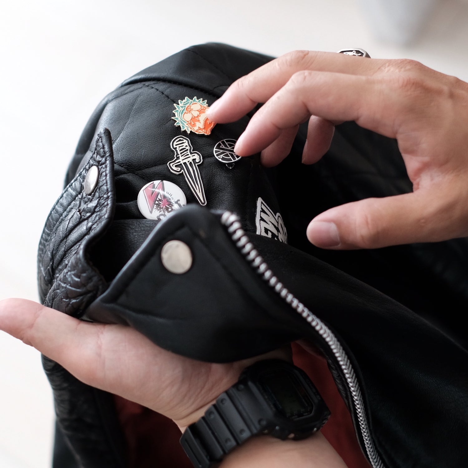 この前ロンドンに行った時に、ビンバッジを売っているお店でおすすめされて買った、ビンバッジをしっかりと固定できるキャッチ。ピンバッジが好きで、革ジャンなどに付けるのですが、スケボーやライブに行く時とか、取れて失くなってしまうことが多かったんです。これはネジ式でめちゃめちゃキャッチ力が強くて、絶対に外れないので、これを使ってからは失くさなくなりました。