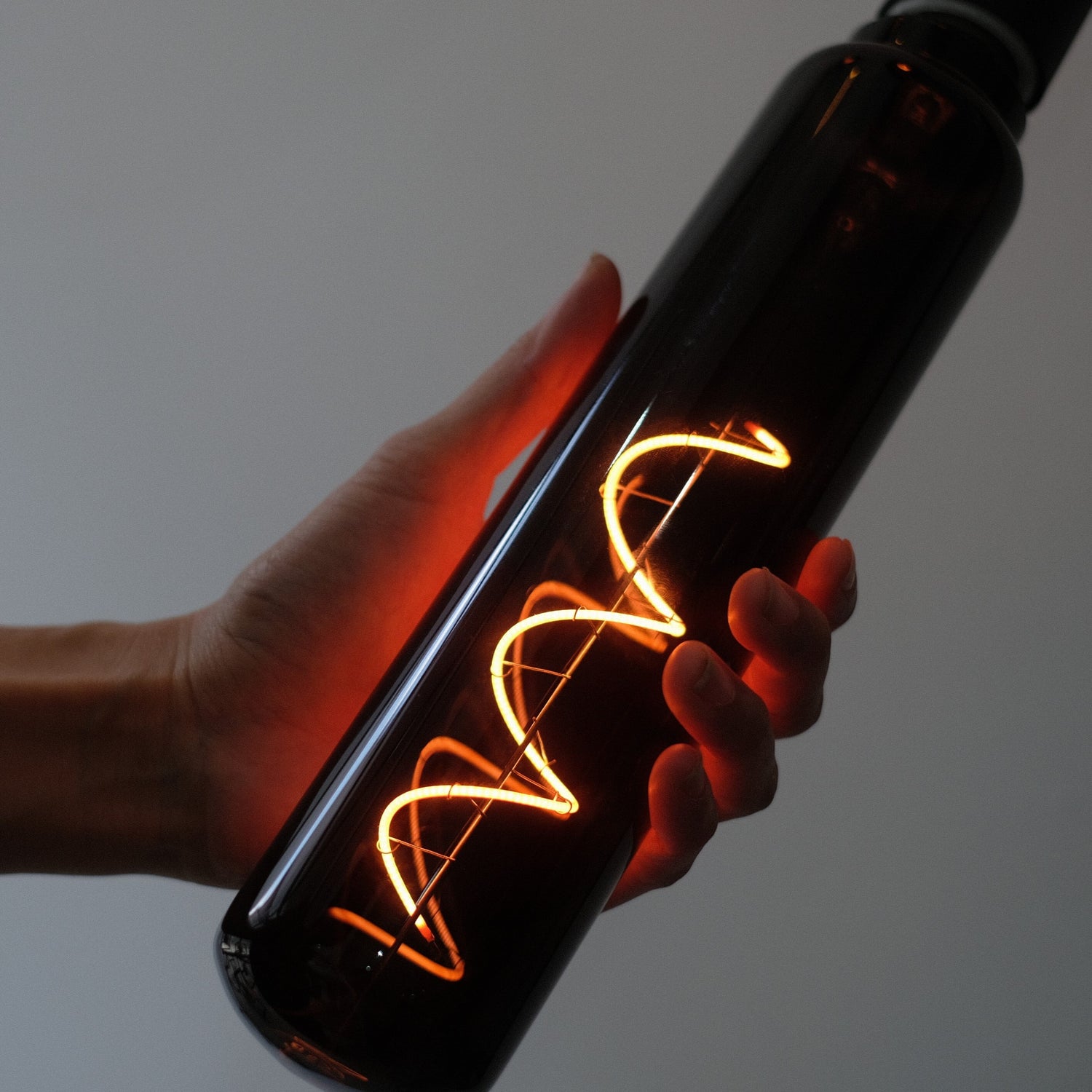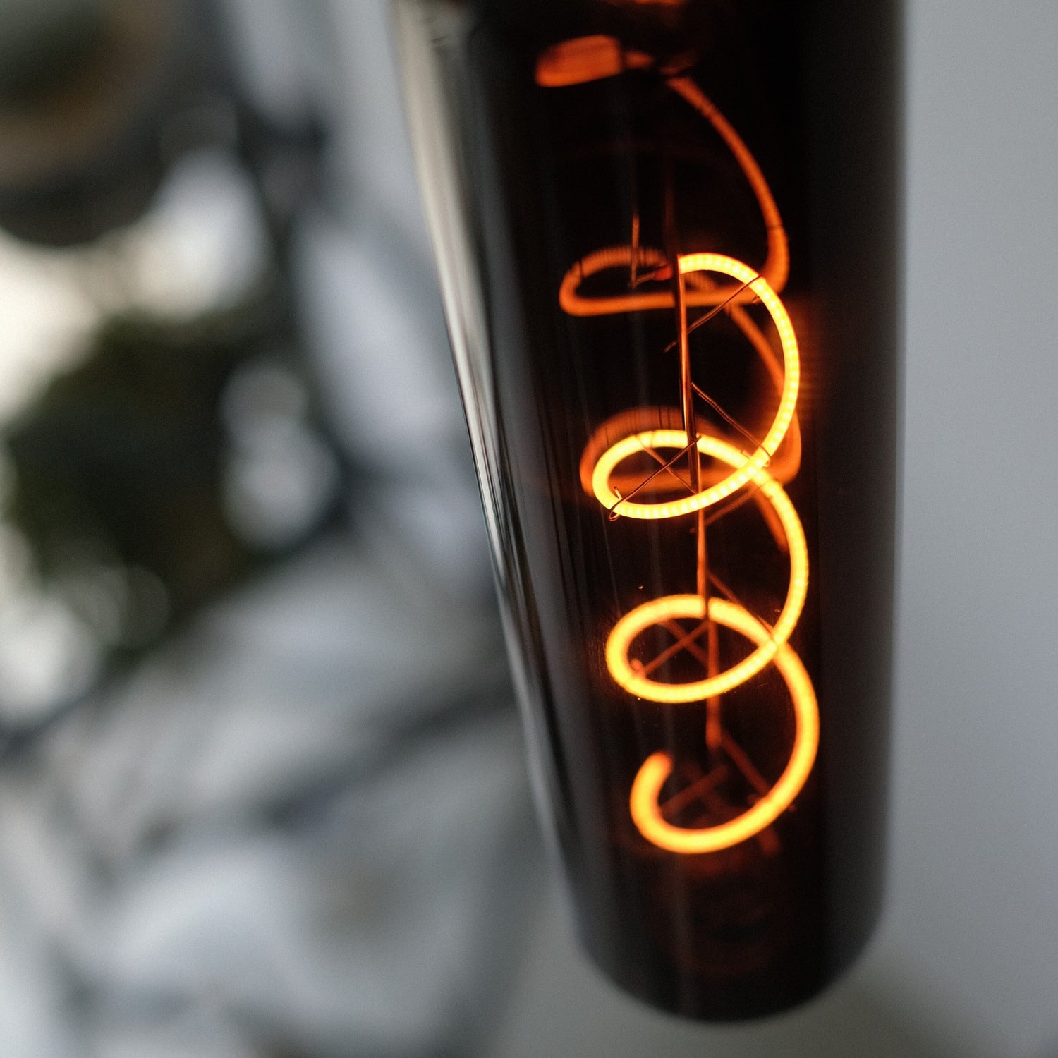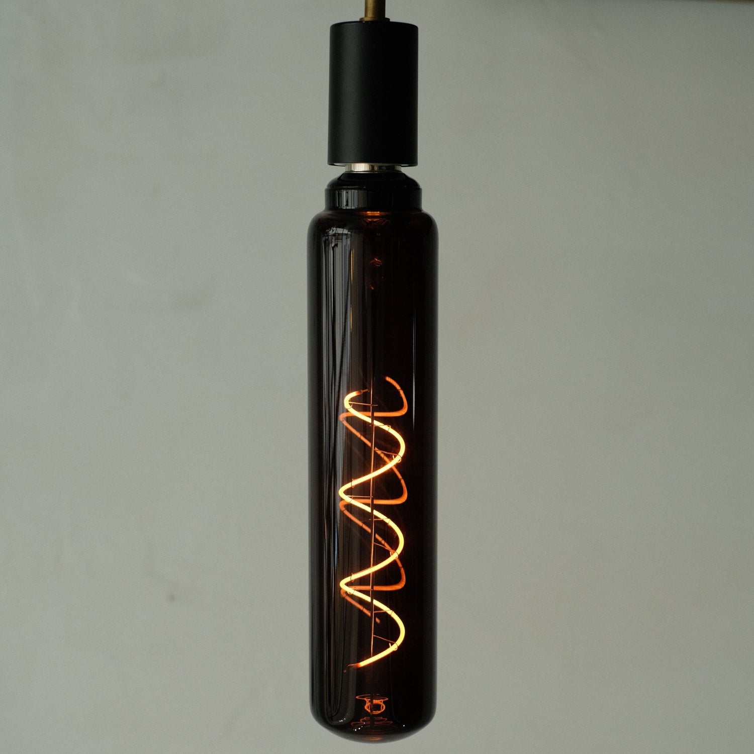 暗闇に浮かび上がるネオンサインのような螺旋状のフィラメントLEDが目を引くNoir電球。ガラスを黒くスモーク加工した電球はインテリアに強い存在感を放ち、クールで洗練された印象を与えます。空間に独自のスタイルと雰囲気をもたらすアート作品のような電球。インダストリアルスタイルやモダンスタイルのインテリアにおすすめです。
