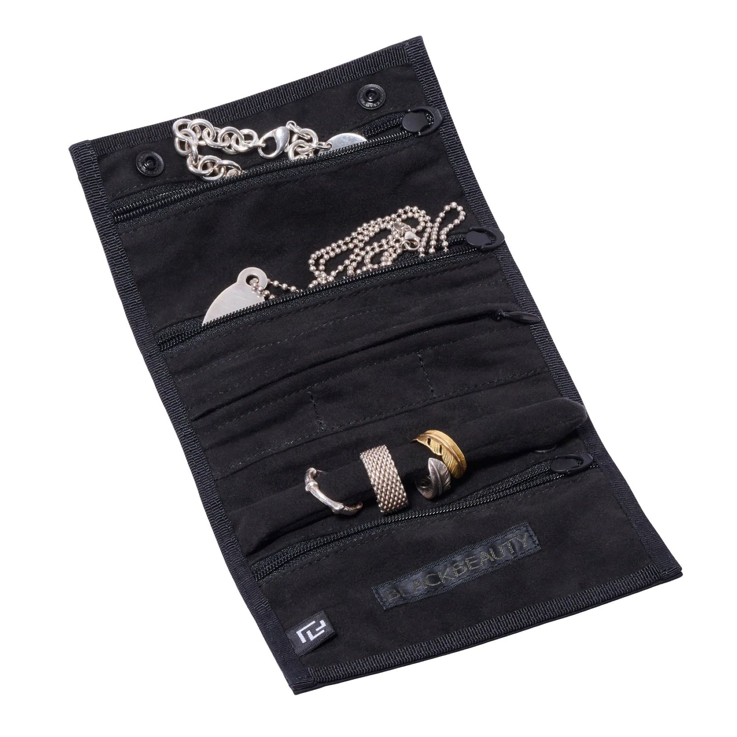 ブレスレット、ネックレス、リングなどのアクセサリーの収納に適した手帳型ケース。内装生地全体にアクセサリーとの相性が良いスウェードさながらのきめ細やかで滑らかな肌触りが特徴エコスウェードを使用。棒状のリングホルダーは片側ホック開閉式でリングをまとめて収納可能。ピアスからブレスレットまで対応可能な大きさの異なる4つのジッパーポケットには、アクセサリーへの干渉を防ぐフラットなファスナープルを採用しました。自宅での保管用としても旅先への持ち運び用ケースとしても活躍します。