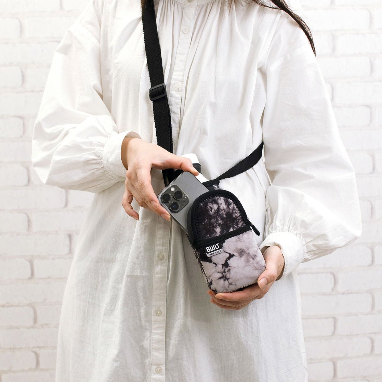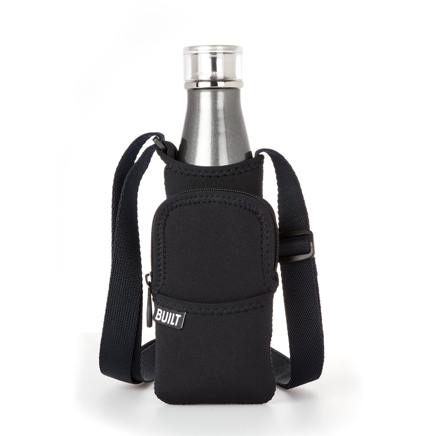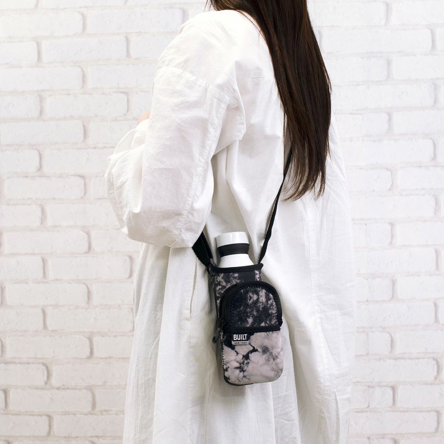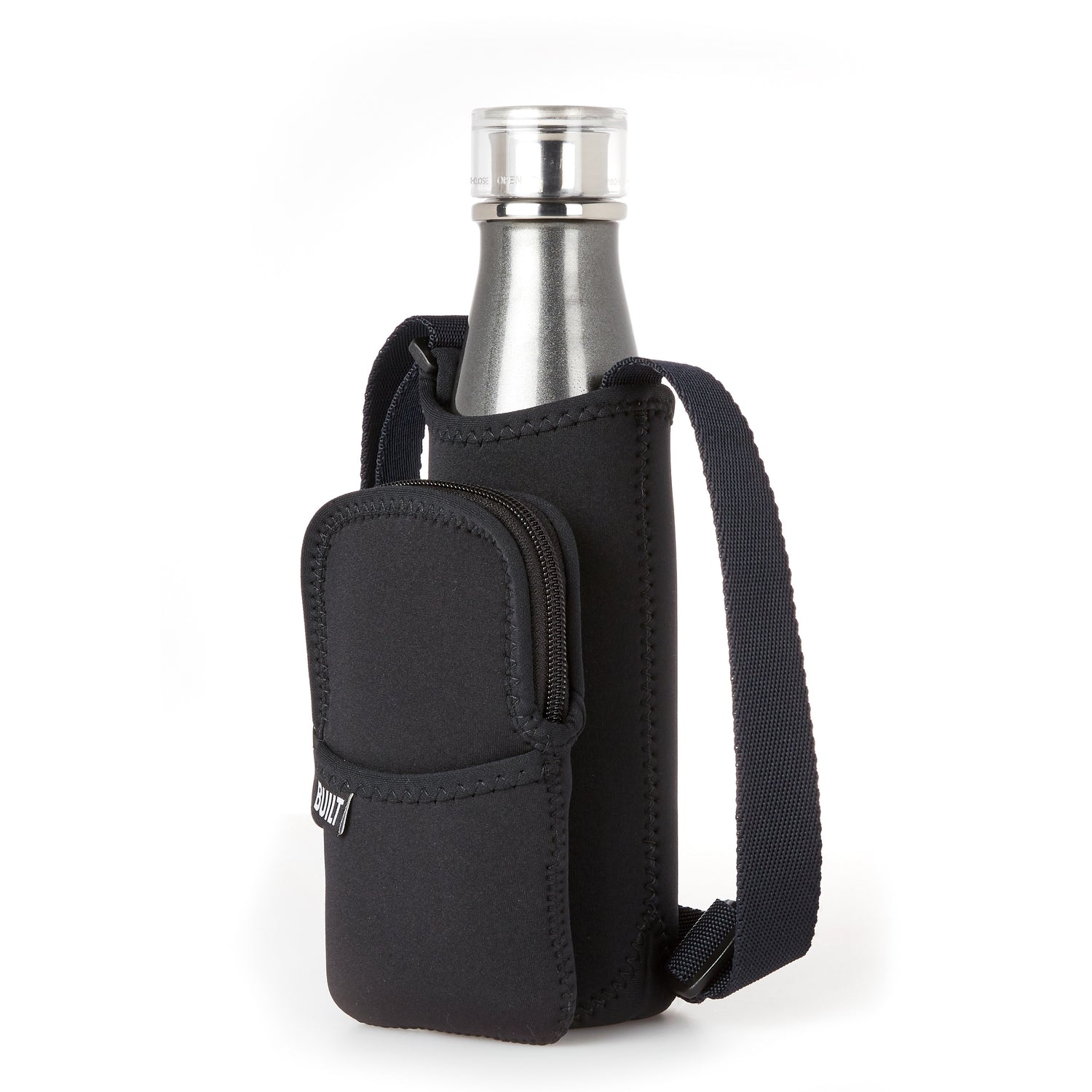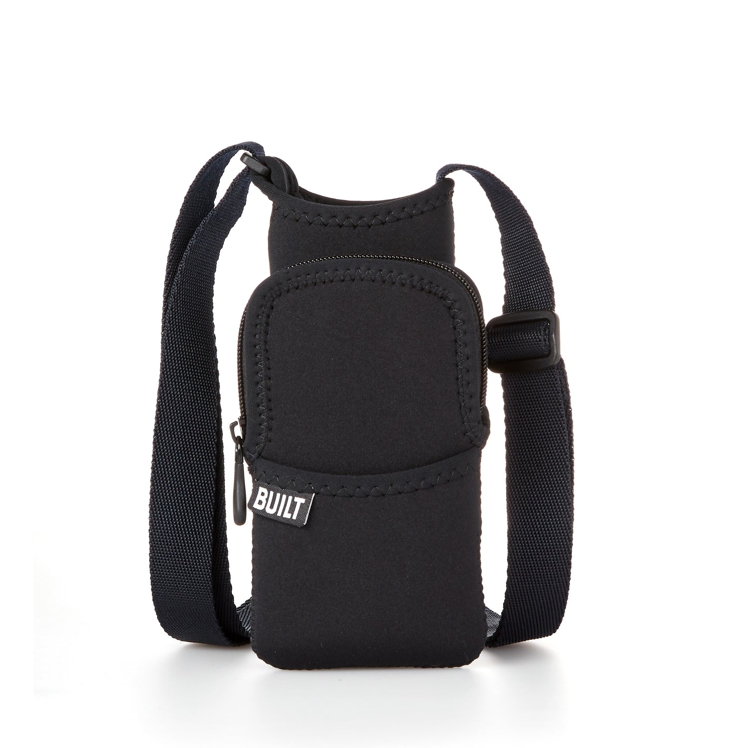 ウェットスーツなどに使用されているクロロプレンゴム素材で作られたショルダー付ボトルホルダー。クロロプレンゴム素材は耐久性・耐水性に優れ、汚れても洗濯機で丸洗いができるため、安心してお使いいただけます。程よいストレッチが効いているため、様々なサイズのボトルにフィットします。(500~600mlのペットボトルも入れられます。)鍵などの小物を入れるのに便利なジップ付ポケットとスマホなどをしまえるフロントポケットがついており、 ちょっとしたお出かけにピッタリ! ショルダーストラップは長さが調整可能でお子様でもお使いいただけます。