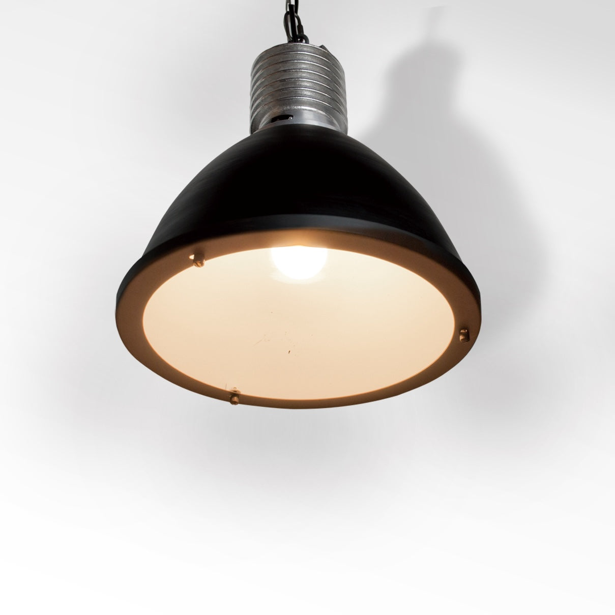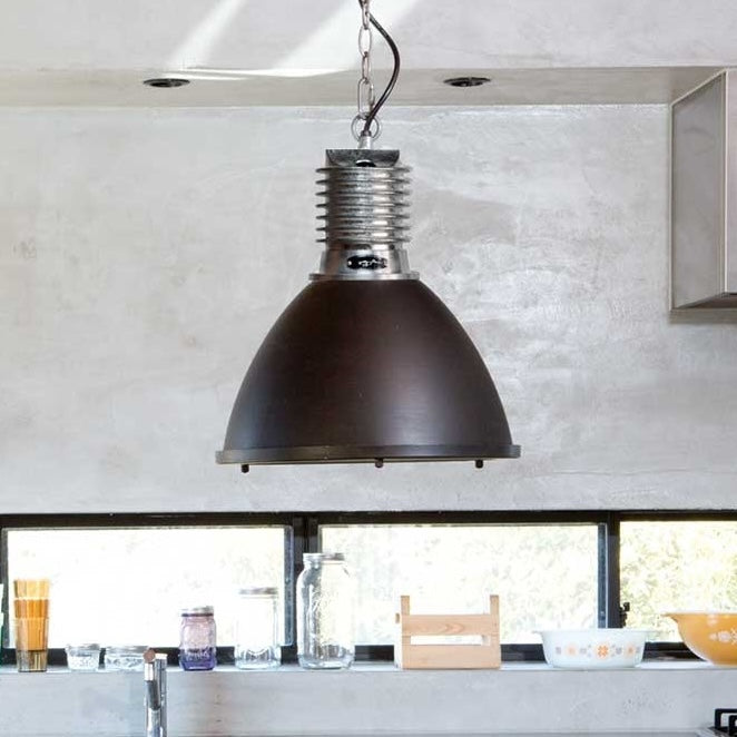 大きいシェードが魅力的な1灯ペンダントタイプの照明です。まるでバイクのエンジンに使われているようなアルミのバルブが特徴的。ハードな見た目ながら2.8kgと軽めなので取り付けも簡単です。ご家庭で使用する際にちょうど良いように設計しています。塗装にもこだわり、ヴィンテージ感を演出。特殊なヘアライン塗装を施しており、マットな風合いとなっております。メンズライクな工業的デザインではありますが、どんな雰囲気のお部屋でも馴染みます。
