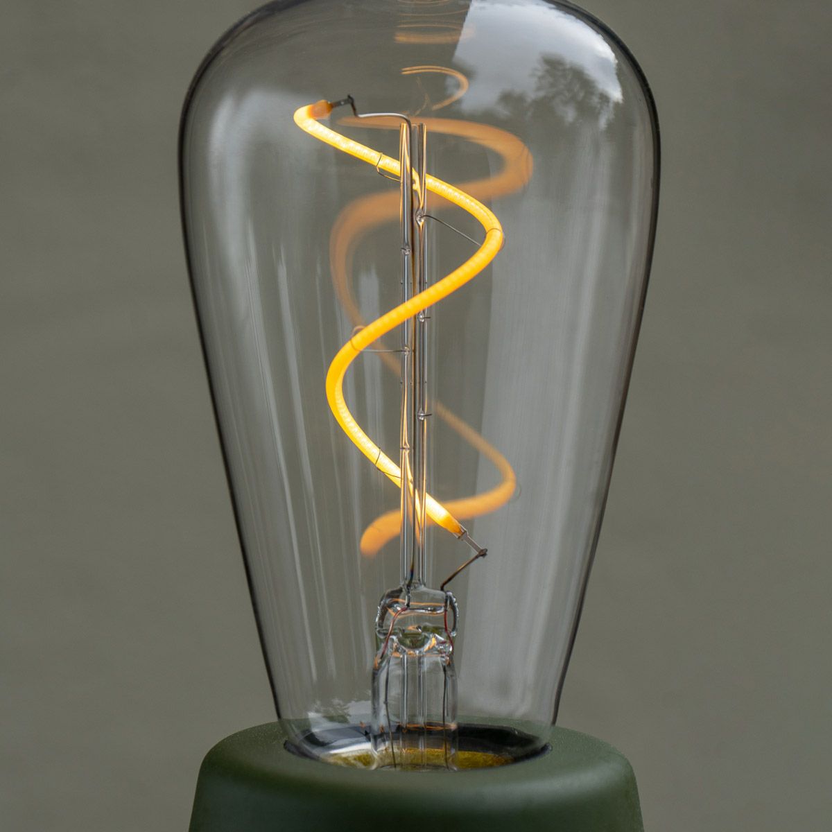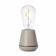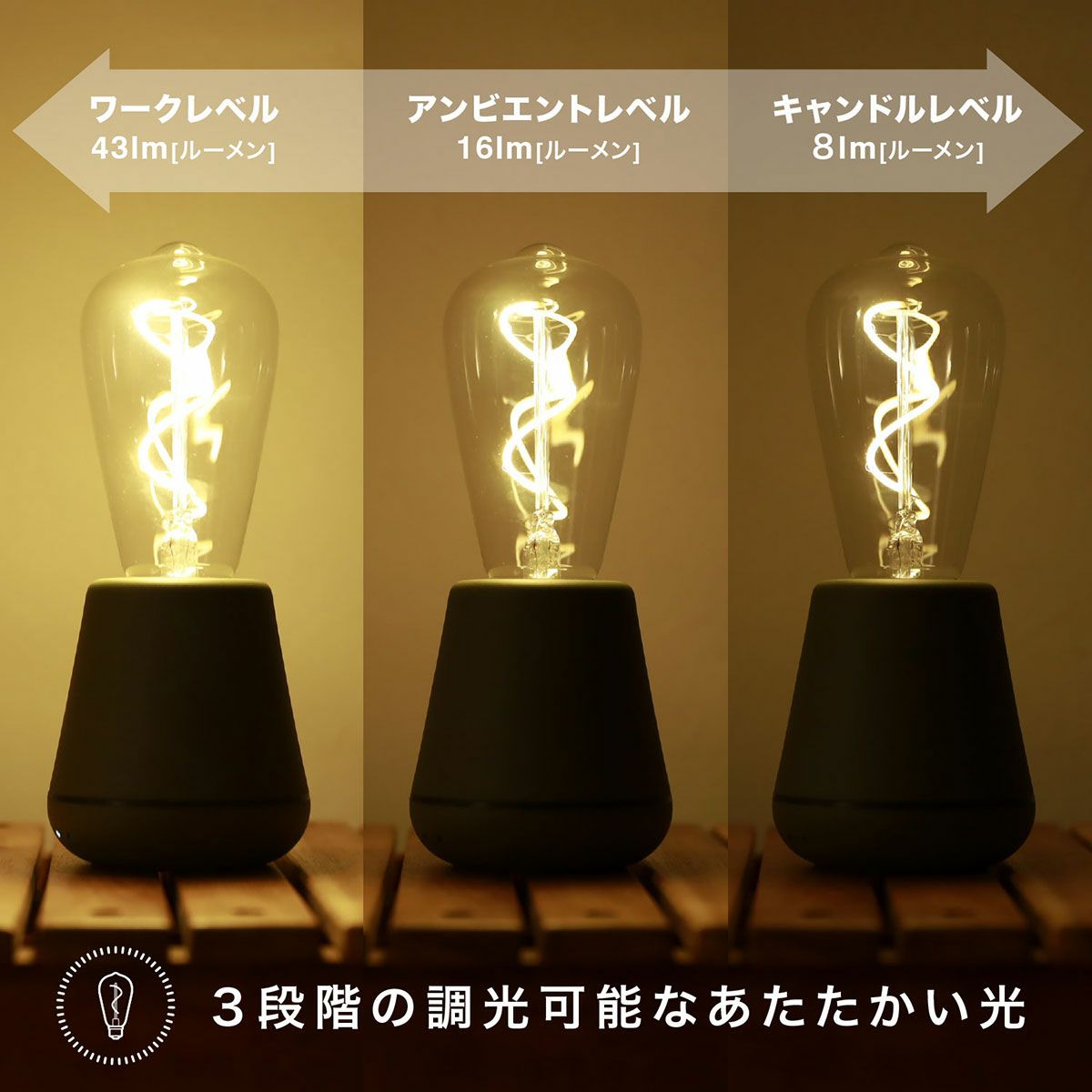 ・充電式電池内蔵のコードレスランプです。光源は5V、1W、光源色2200K(暖色)のLEDフィラメント電球です。フル充電後、最大明度で約40時間、最小明度で140時間ほど使用できます。