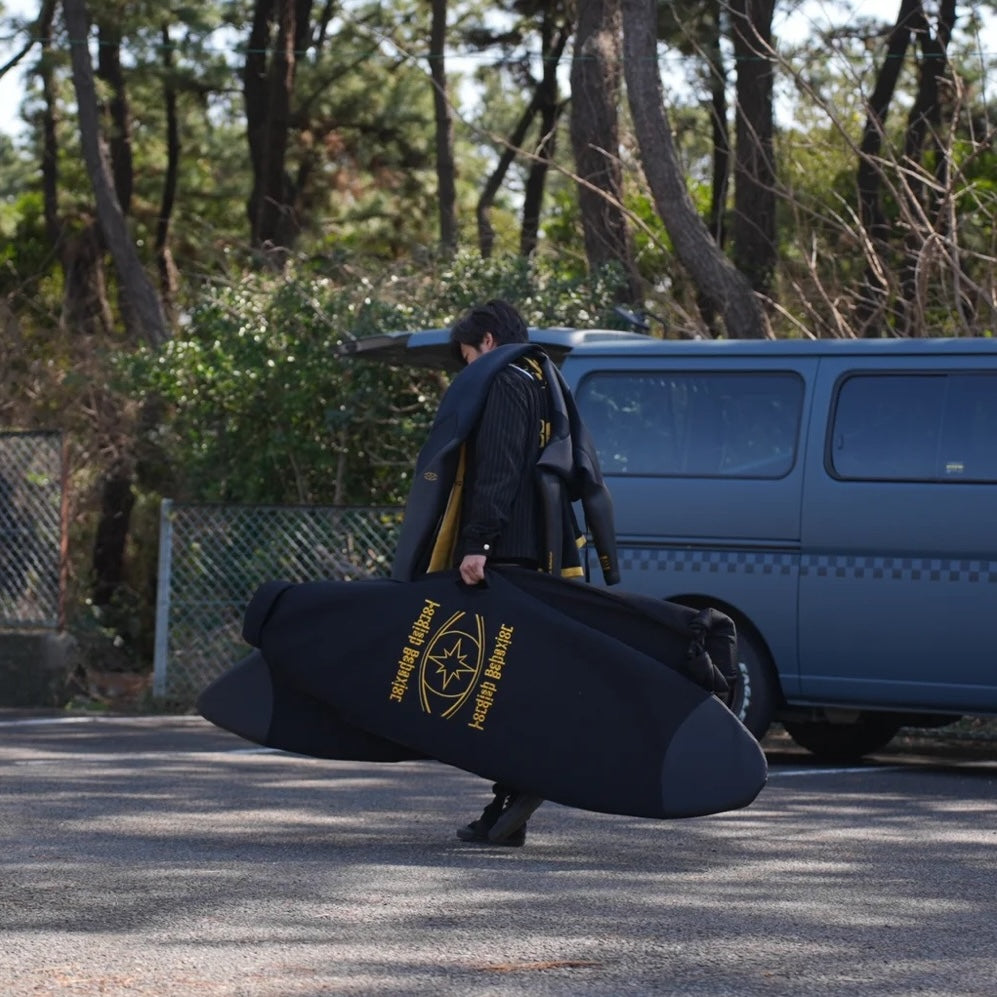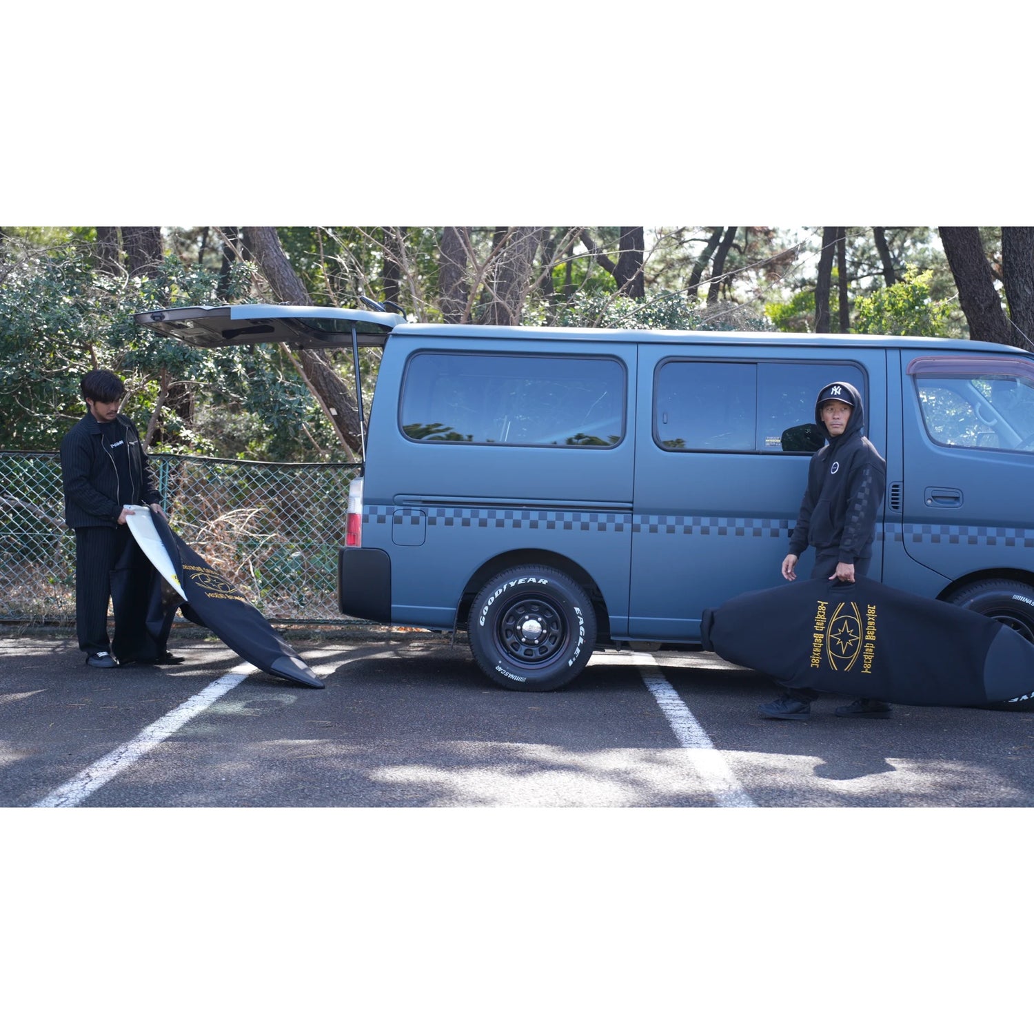 チャックをサイドに採用し、ファスナーの長さを半分くらいまで伸ばしました。これにより、サーフボードの出し入れのスムースさが格段と上がりました。さらにノーズガード部分の幅や長さをかなり大きくし、ノーズの壊れを防ぎ出し入れ時に起こる1番のストレスなノーズが引っかかることを最大限に抑えます。