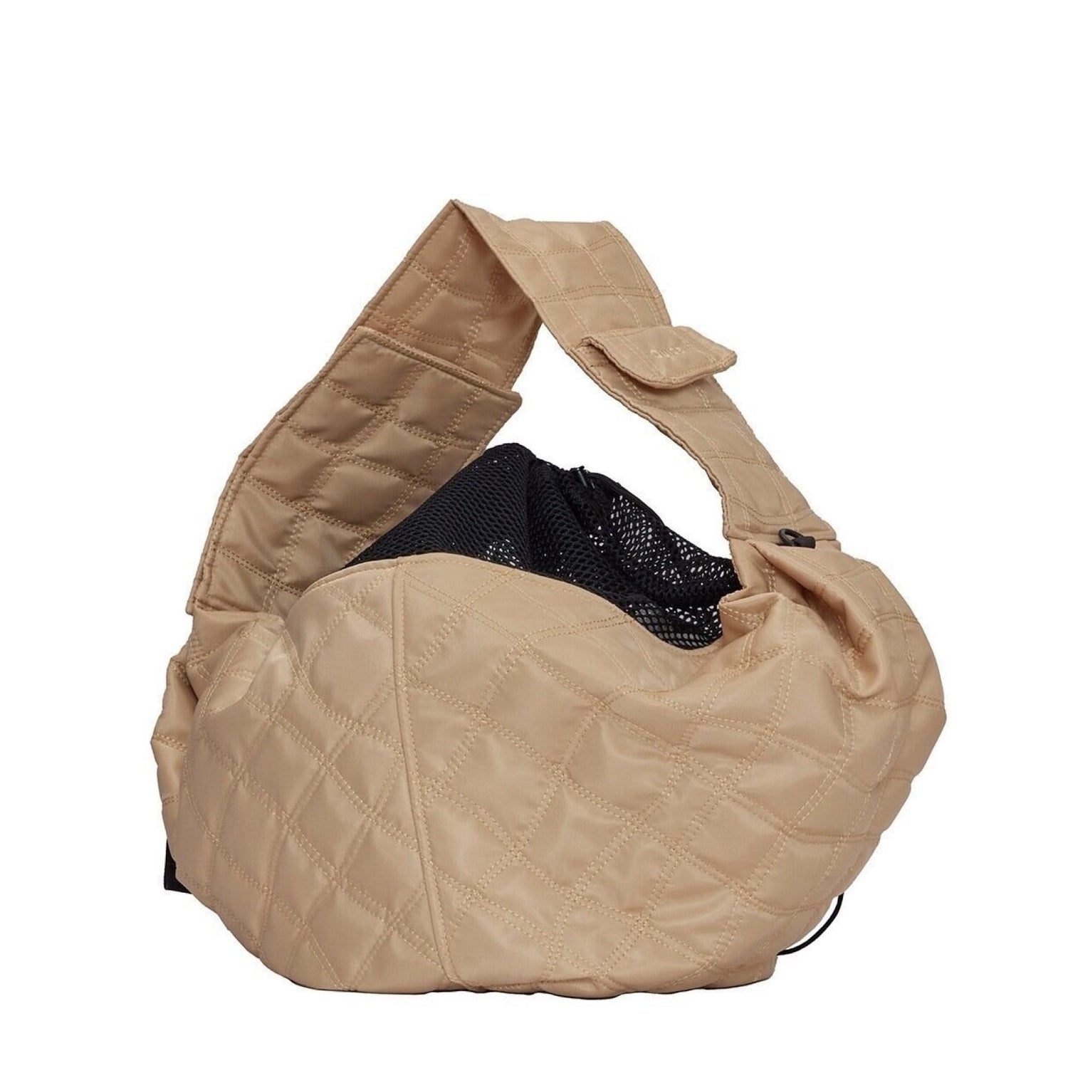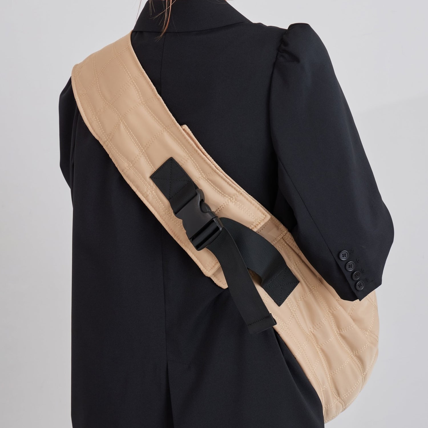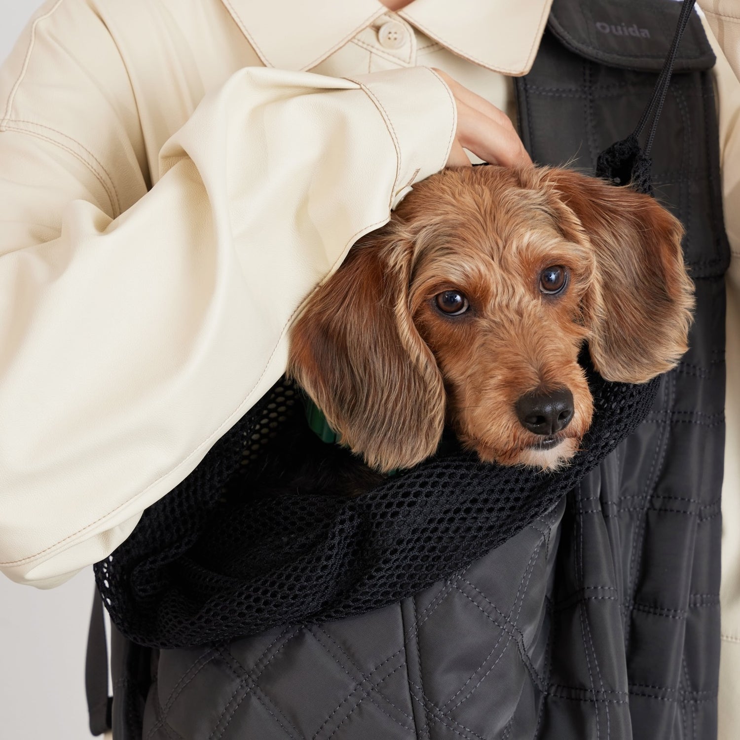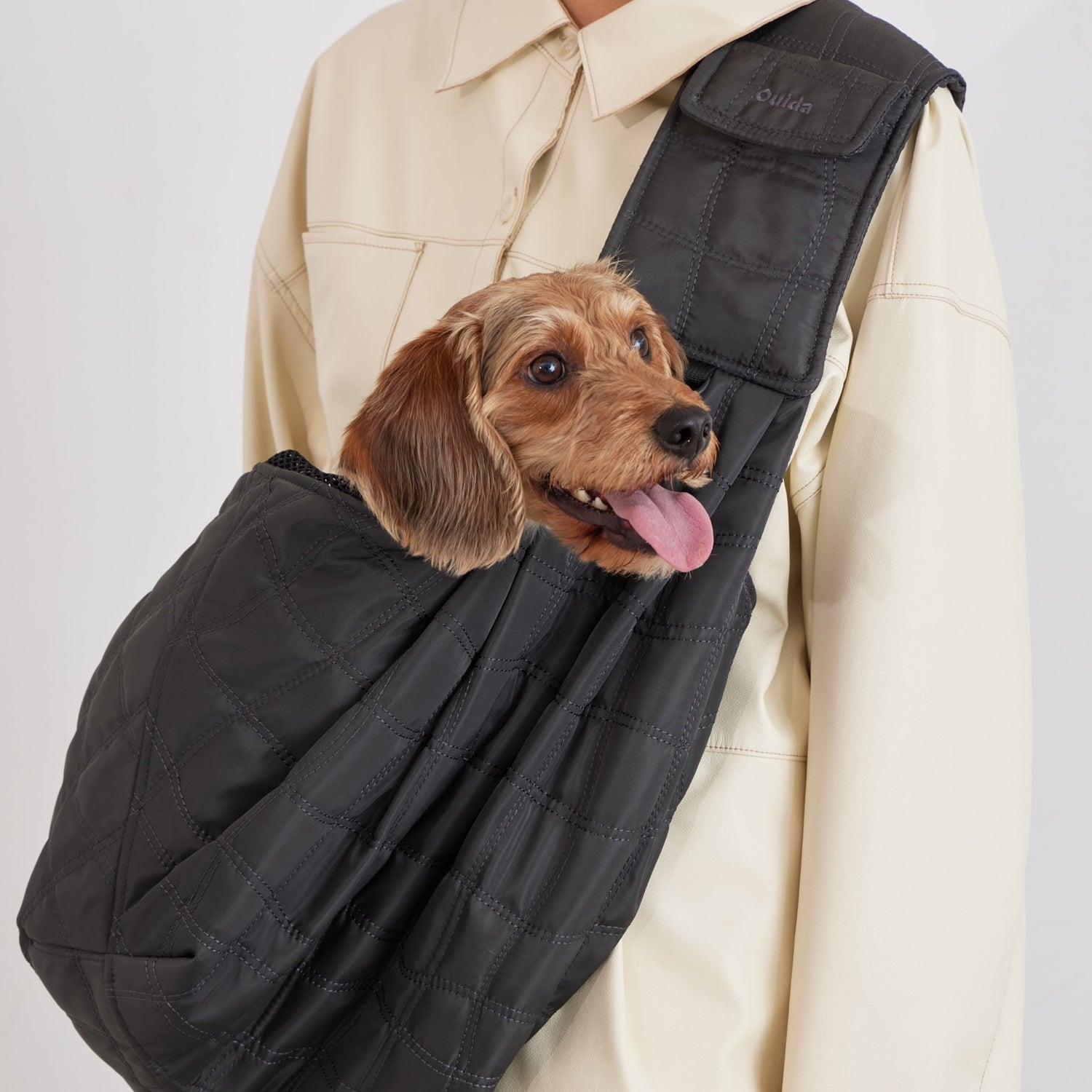 ショルダーの長さ調節が可能な、オリジナルキルティングのスリングバッグ。メッシュ付きで公共機関での移動にもご使用になれます。汚れと傷に強い丈夫なナイロン素材で、小型犬から中型犬も入る大きめサイズとなっております。幅広なショルダーは肩に掛かる負担が少なく、長時間の移動でも疲れにくいです。ショルダーには小物類を収納できるポケットが付いています。内側底部分にはもしもの時に安心な、飛び出し防止リードも付いております。