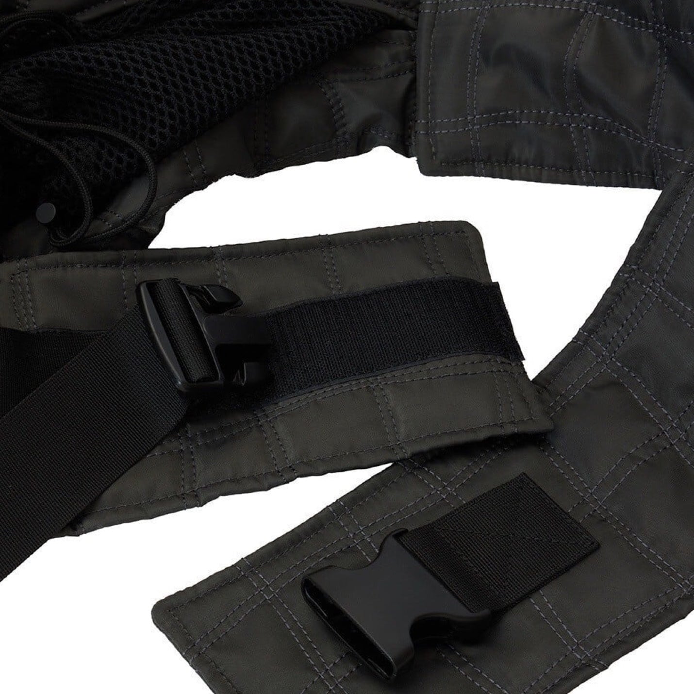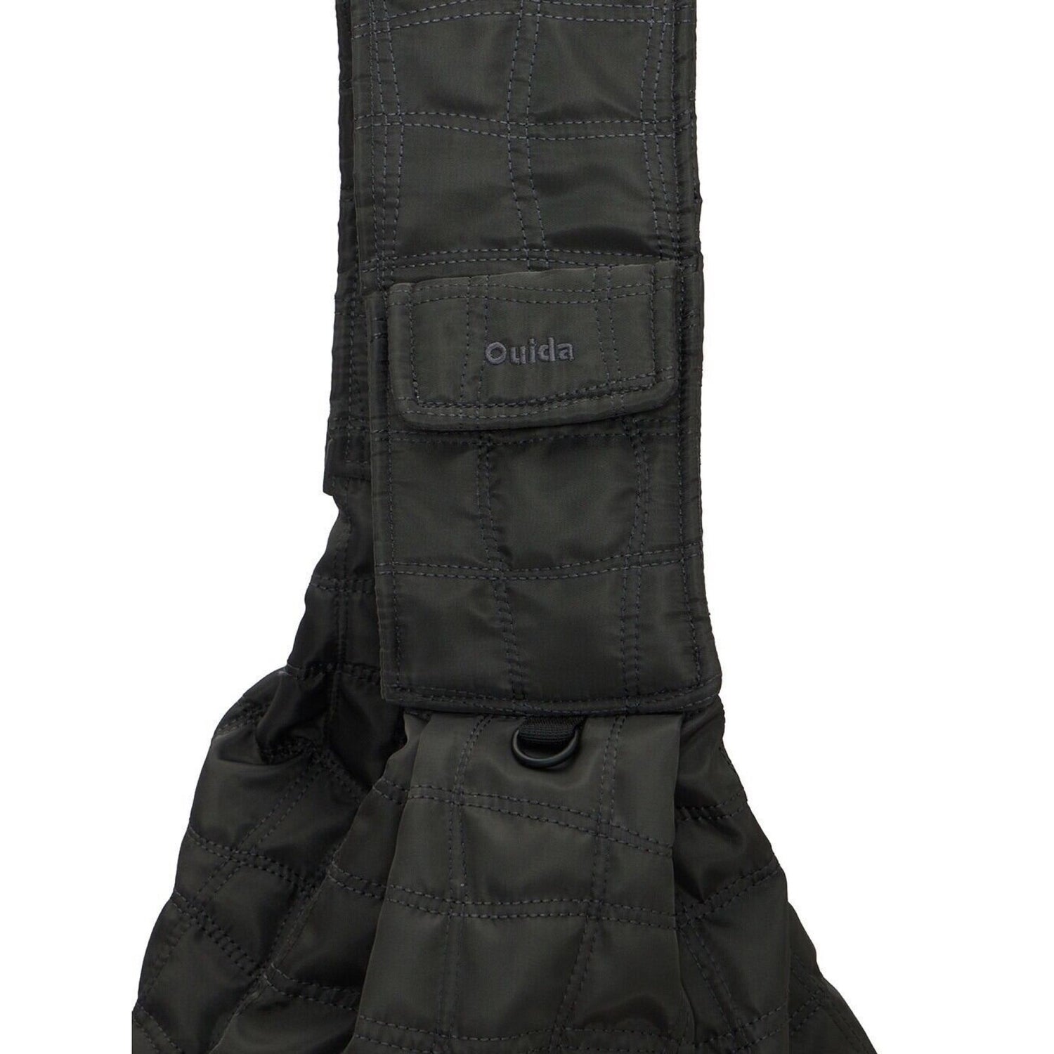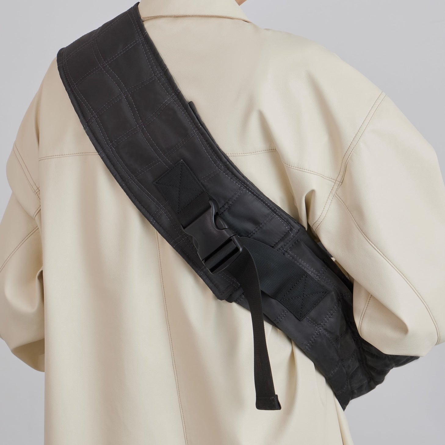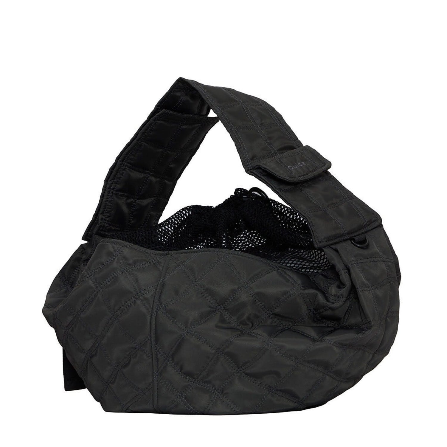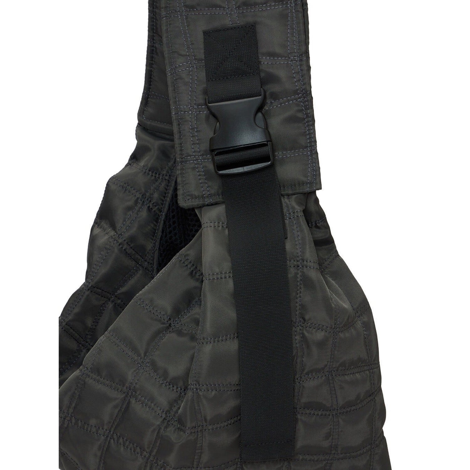 ショルダーの長さ調節が可能な、オリジナルキルティングのスリングバッグ。メッシュ付きで公共機関での移動にもご使用になれます。汚れと傷に強い丈夫なナイロン素材で、小型犬から中型犬も入る大きめサイズとなっております。幅広なショルダーは肩に掛かる負担が少なく、長時間の移動でも疲れにくいです。ショルダーには小物類を収納できるポケットが付いています。内側底部分にはもしもの時に安心な、飛び出し防止リードも付いております。