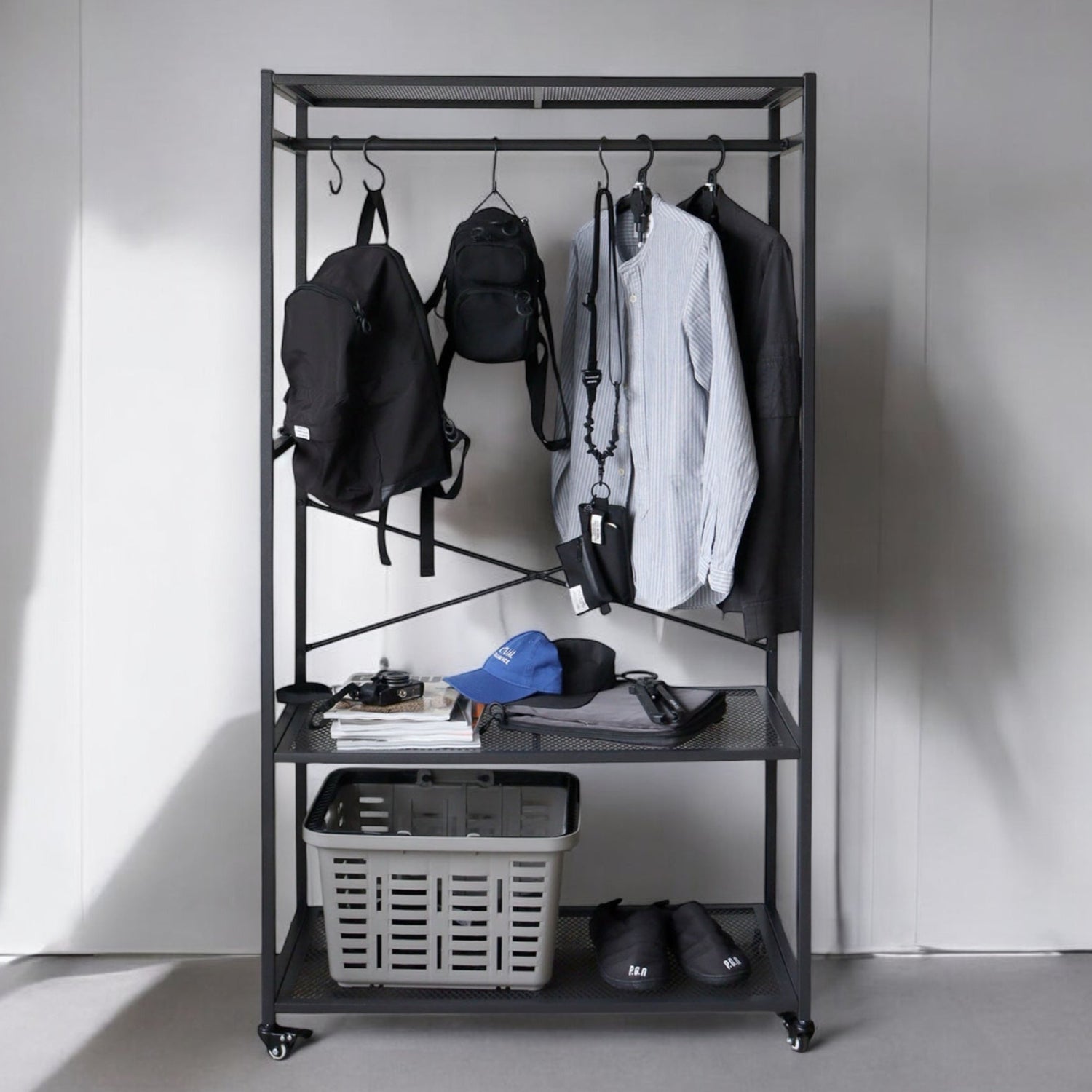 天板がパンチング加工されており、見た目も実際の重さも軽量化されたコートラック。アイアン系のインテリア/ファニチャーは無骨なモノが多いですが、こちらはお部屋の雰囲気問わずニュートラルに使えるデザイン。キャスター付きで移動が楽ちんなのも嬉しいポイント!