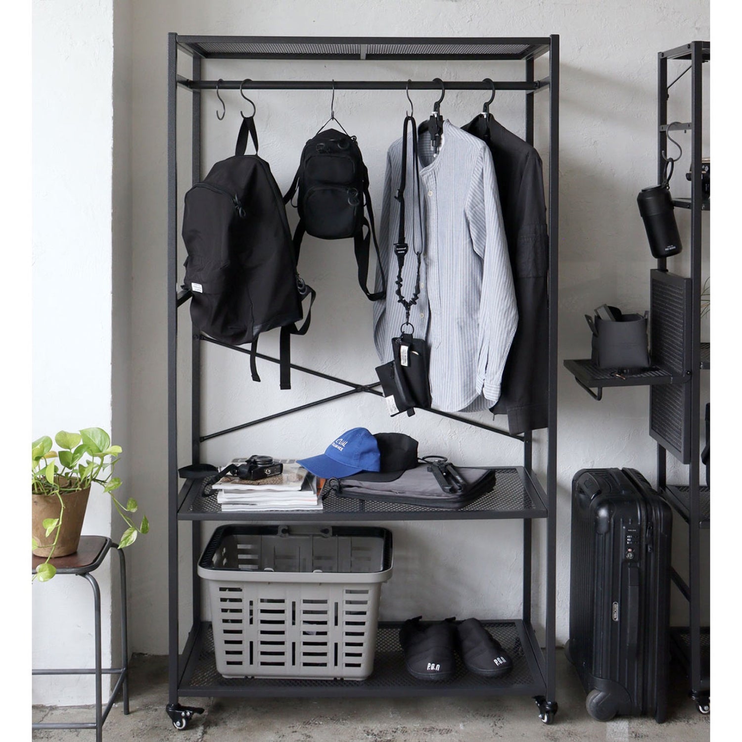 スチールシェルフシリーズにコートハンガーラックタイプが新たに加わりました。中段の棚板を取り外すとロングコートなどの丈の長いものを収納することができるので、アイテムに合わせて収納をカスタマイズすることが可能です。移動に便利なキャスター付きで、ちょっとした間仕切りのような使い方もおすすめのハンガーラックです。耐荷重:棚板1枚につき約15kgまで