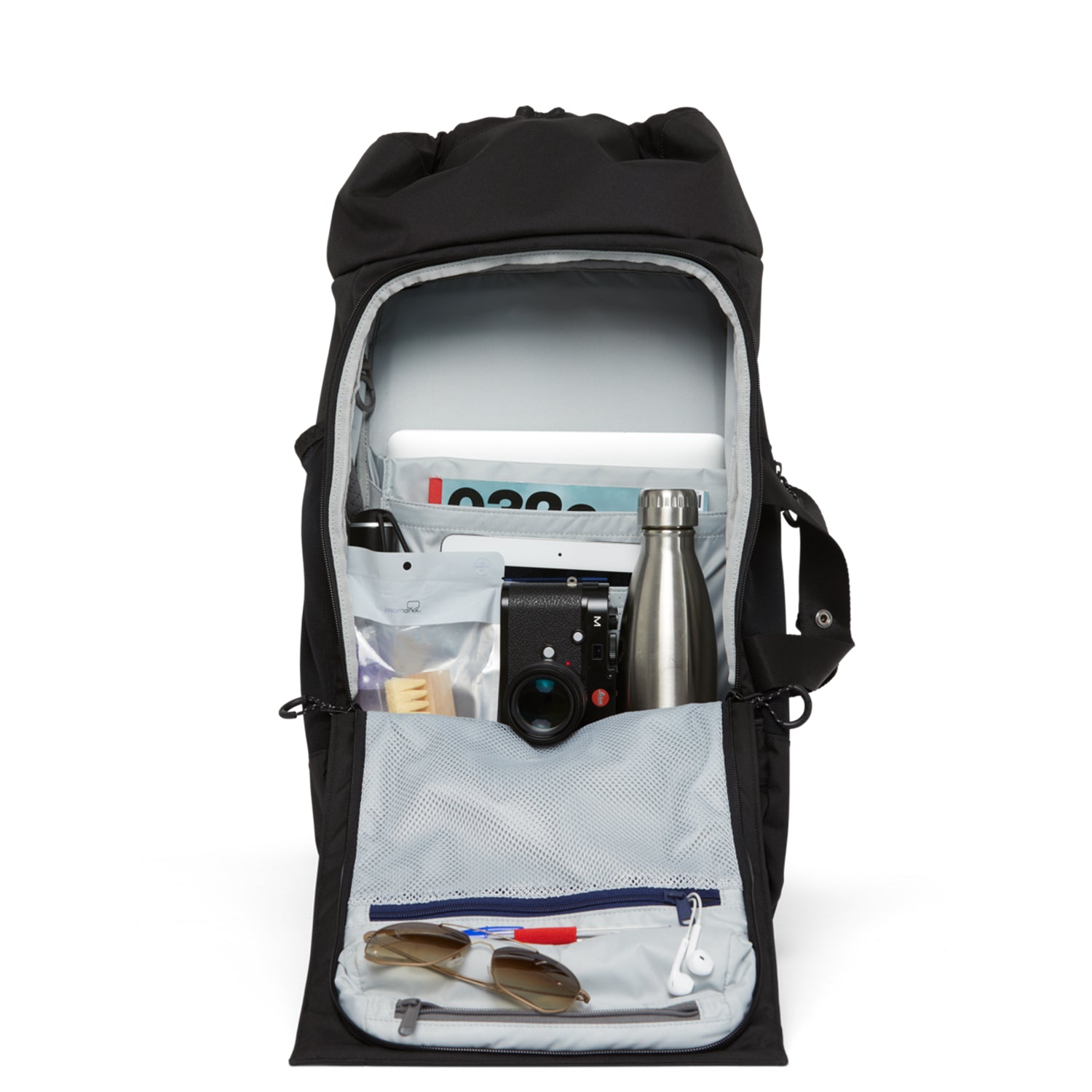 45Lも入るバックパックです。スーパーのカゴ一杯の買い出しがすっぽり入ります。前面がガバッと開くから、段ボールに物を詰めるようにパッキングができて、レジ袋では指がちぎれてしまうような量の買い物でも重さを分散して楽に運べます。大容量のバックパックって登山や旅行くらいでしか出番がないものですが、これはスーパーに行く時の運搬ツールとしても必ず使っていて、もうすっかり暮らしの相棒です。目みたいなのがついていてかわいいです。