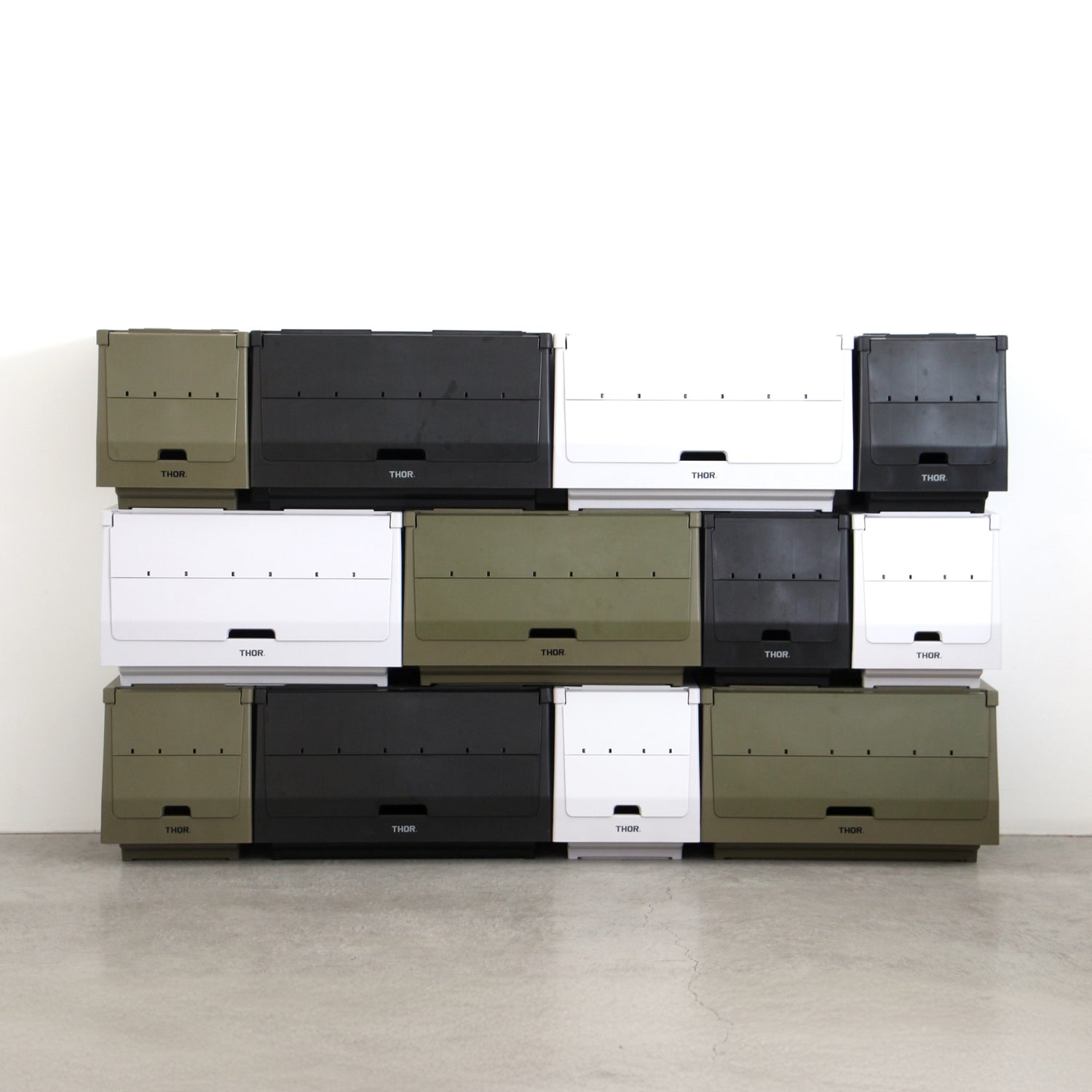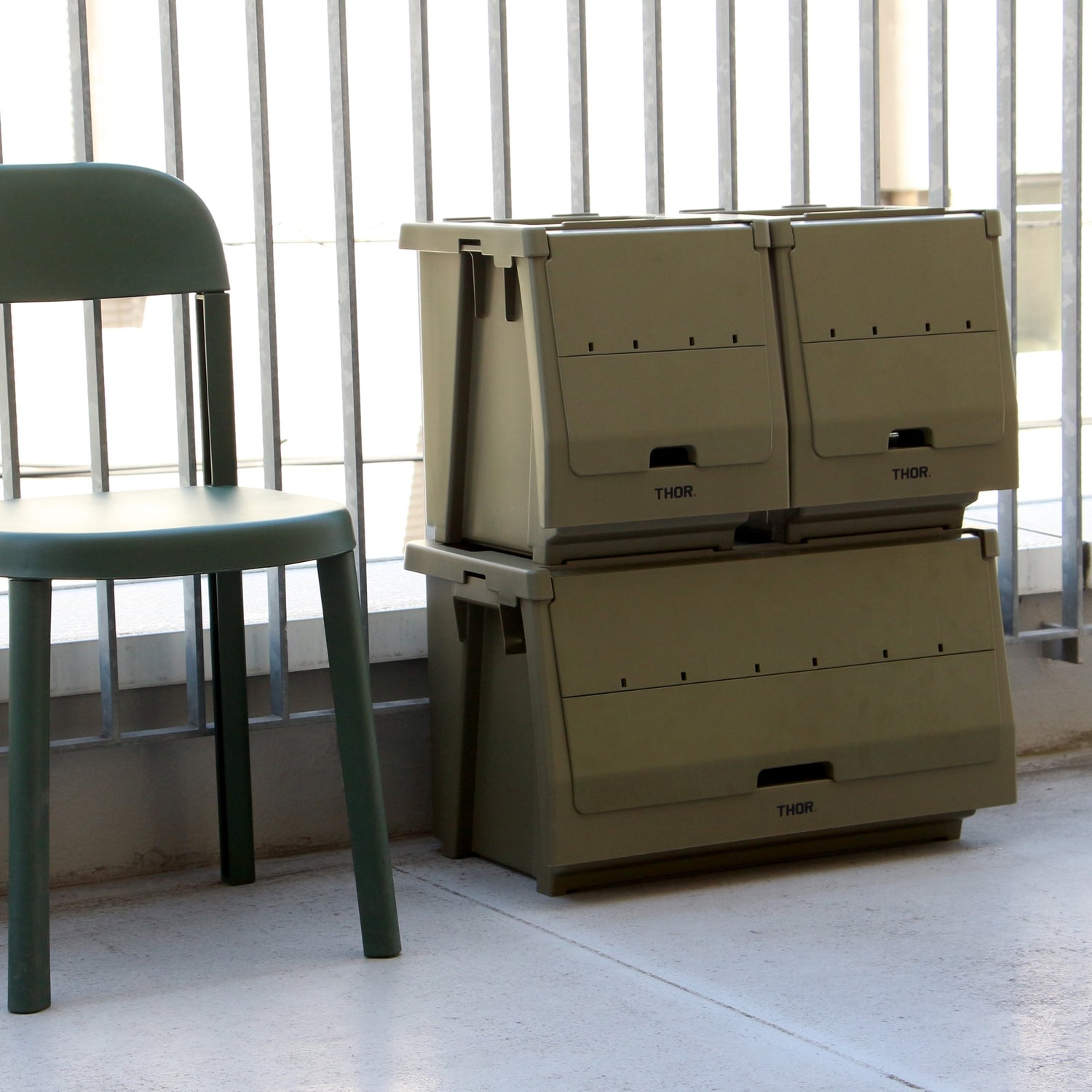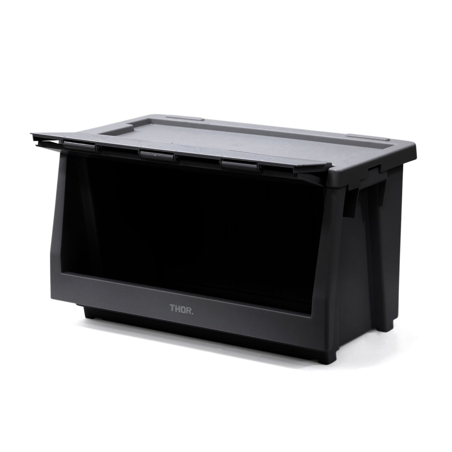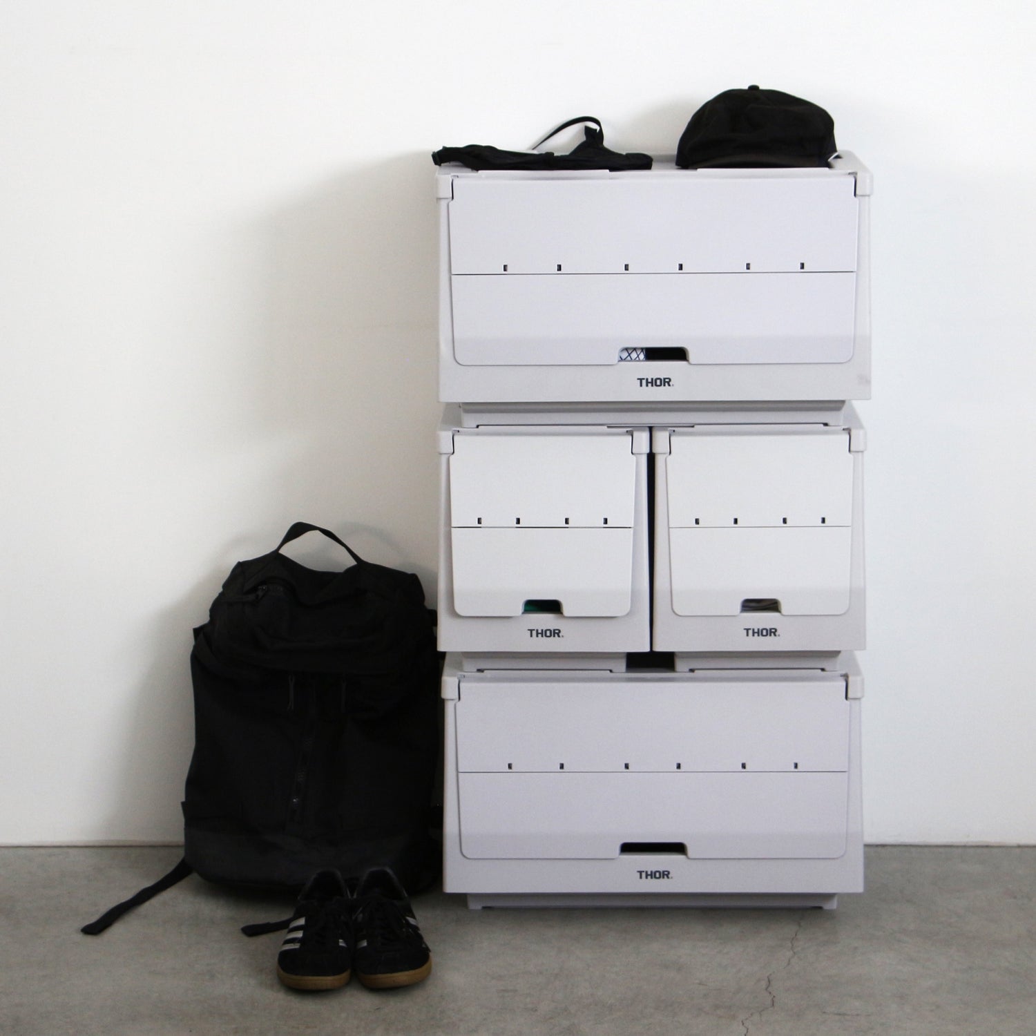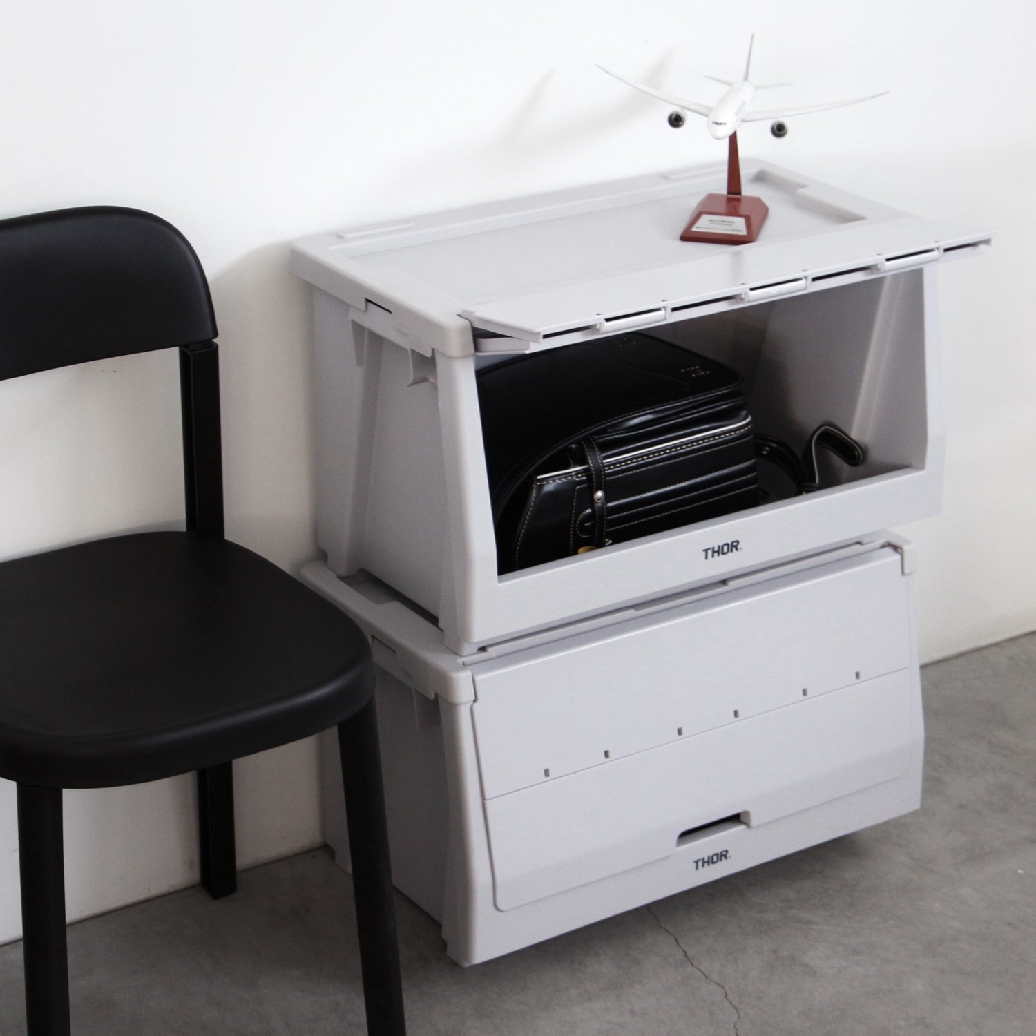 コンテナボックスといえば今や定番のTHORから、室内での収納に特化した「スタッキングシェルフコンテ」が登場したので、我が家にも導入しました。業務用感の強い従来のコンテナに比べて、生活空間にも馴染みやすい仕様。正直、画像だけ見たときは「ちょっと物足りないかも…?」と思ったけど、実際に部屋で使ってみるとこれがちょうどいい。無骨さは残しつつ、ちゃんと生活雑貨に寄り添ってる感じ。前扉は開けっぱなしに固定できて、出し入れもスムーズ。折りたたみコンテナによくある耐荷重20〜30kgとは違い、これは120kgとタフ仕様(さすがTHOR)。アウトドアでももちろん活躍してくれそうです。内寸の高さが33.5cmあるのも地味に優秀で、2Lのペットボトルや雑誌も立てたまま収納できます。ここ、意外と見逃せないポイントかも。20Lと50Lの2サイズ展開で、カラーは3色。20Lはソファ横に置いてサイドテーブルとして使うのもアリ。3段までスタッキングOKなので、50L+20L×2の組み合わせなんかも楽しい。物置部屋の壁一面に並べて、配色を楽しむのもアリです。これは、室内収納の新しい定番になっていく気がしてます。