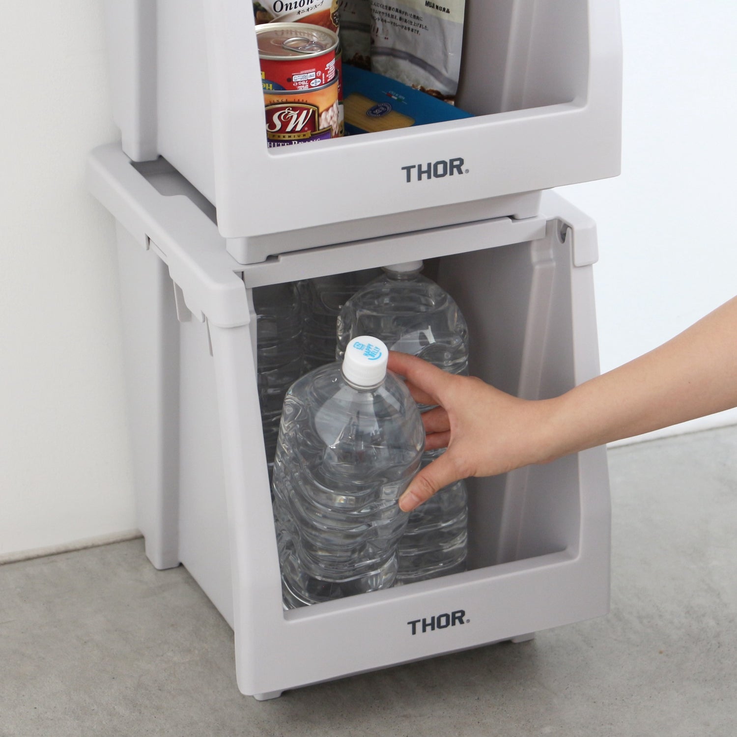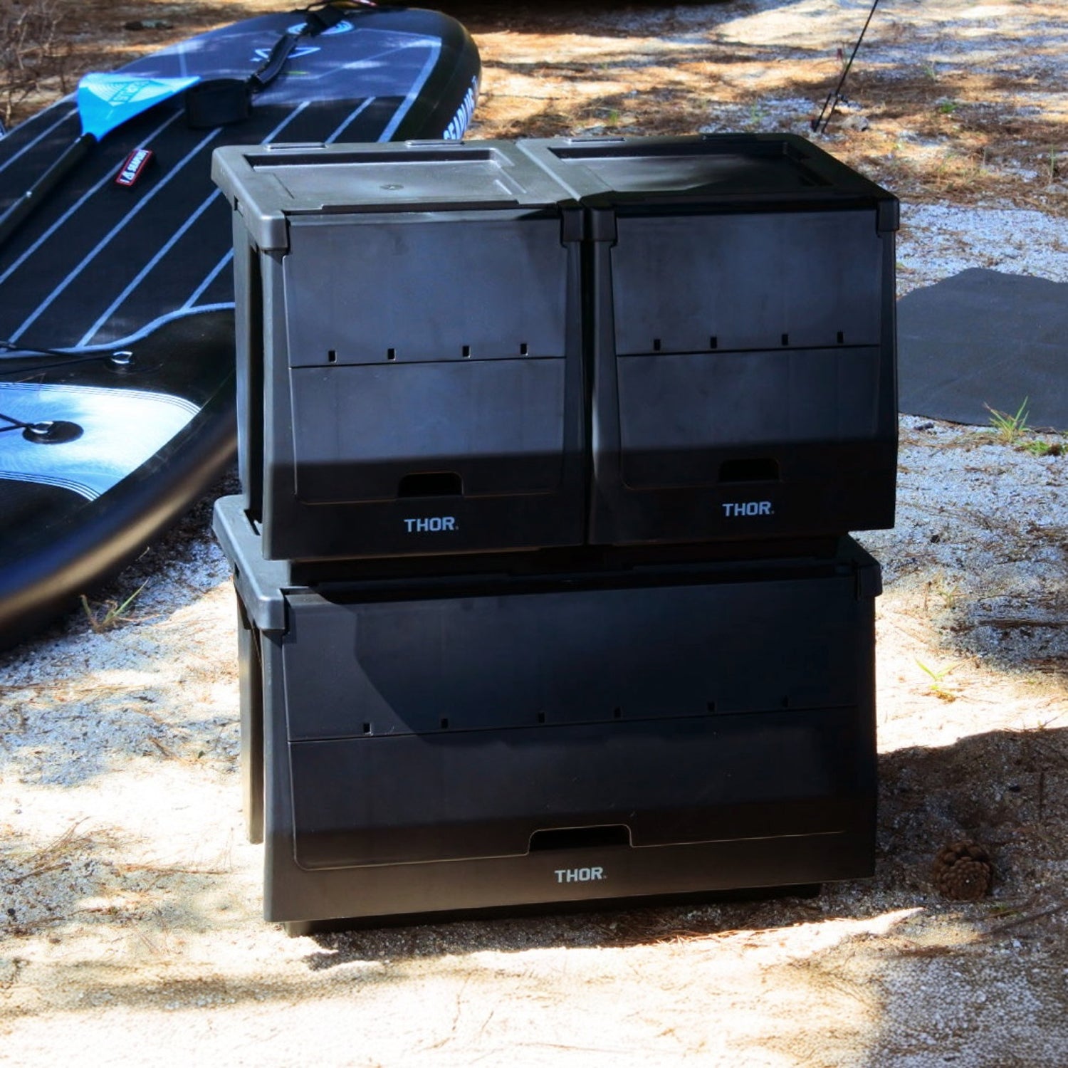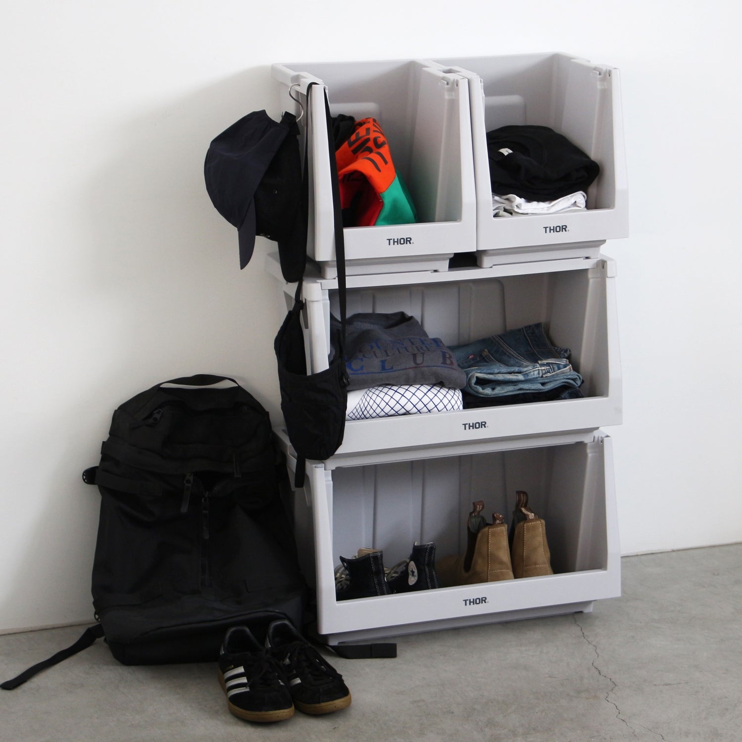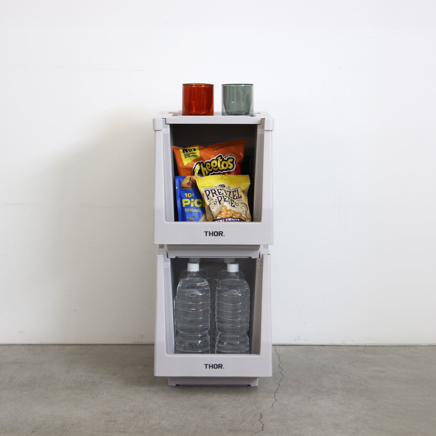 コンテナボックスといえば今や定番のTHORから、室内での収納に特化した「スタッキングシェルフコンテ」が登場したので、我が家にも導入しました。業務用感の強い従来のコンテナに比べて、生活空間にも馴染みやすい仕様。正直、画像だけ見たときは「ちょっと物足りないかも…?」と思ったけど、実際に部屋で使ってみるとこれがちょうどいい。無骨さは残しつつ、ちゃんと生活雑貨に寄り添ってる感じ。前扉は開けっぱなしに固定できて、出し入れもスムーズ。折りたたみコンテナによくある耐荷重20〜30kgとは違い、これは120kgとタフ仕様(さすがTHOR)。アウトドアでももちろん活躍してくれそうです。内寸の高さが33.5cmあるのも地味に優秀で、2Lのペットボトルや雑誌も立てたまま収納できます。ここ、意外と見逃せないポイントかも。20Lと50Lの2サイズ展開で、カラーは3色。20Lはソファ横に置いてサイドテーブルとして使うのもアリ。3段までスタッキングOKなので、50L+20L×2の組み合わせなんかも楽しい。物置部屋の壁一面に並べて、配色を楽しむのもアリです。これは、室内収納の新しい定番になっていく気がしてます。
