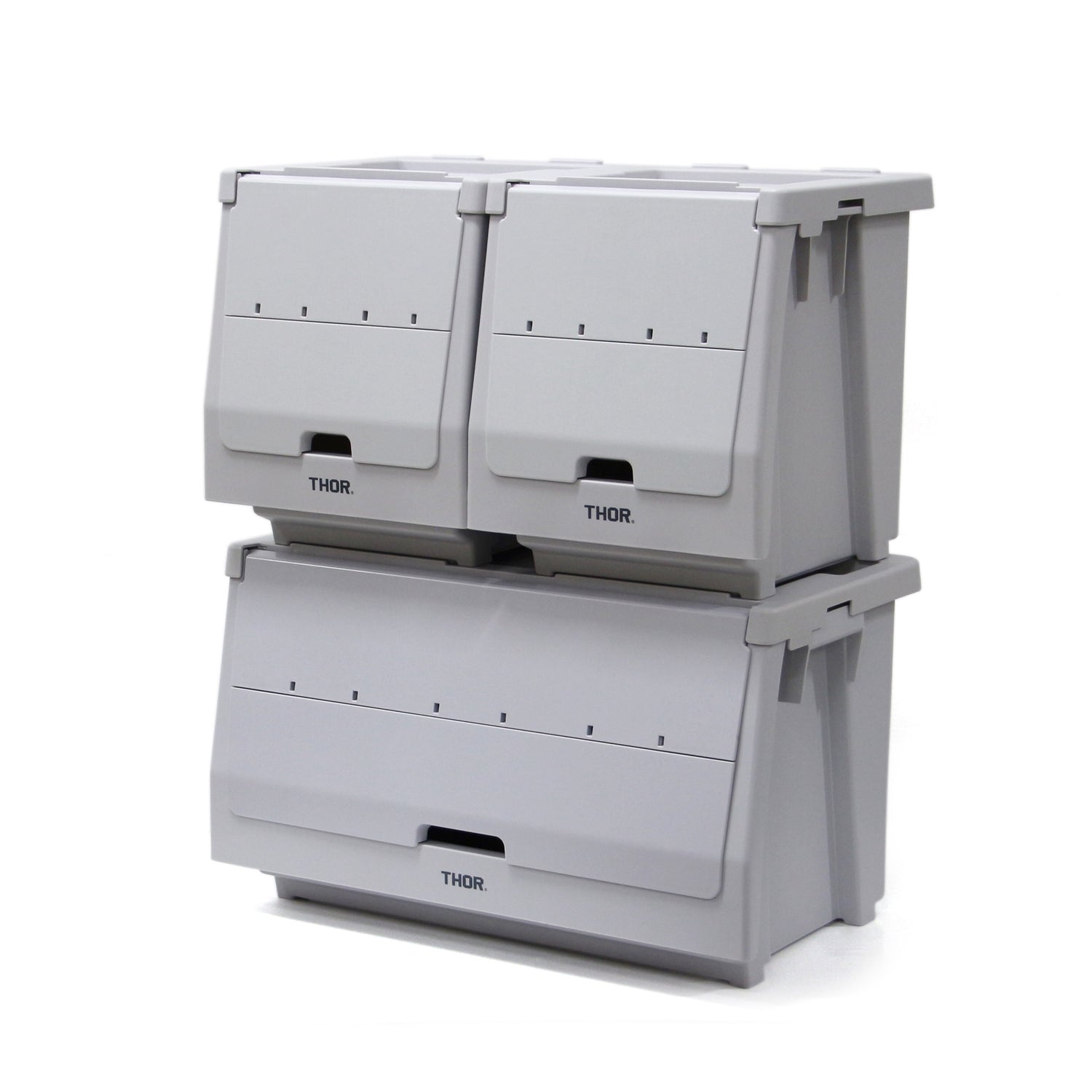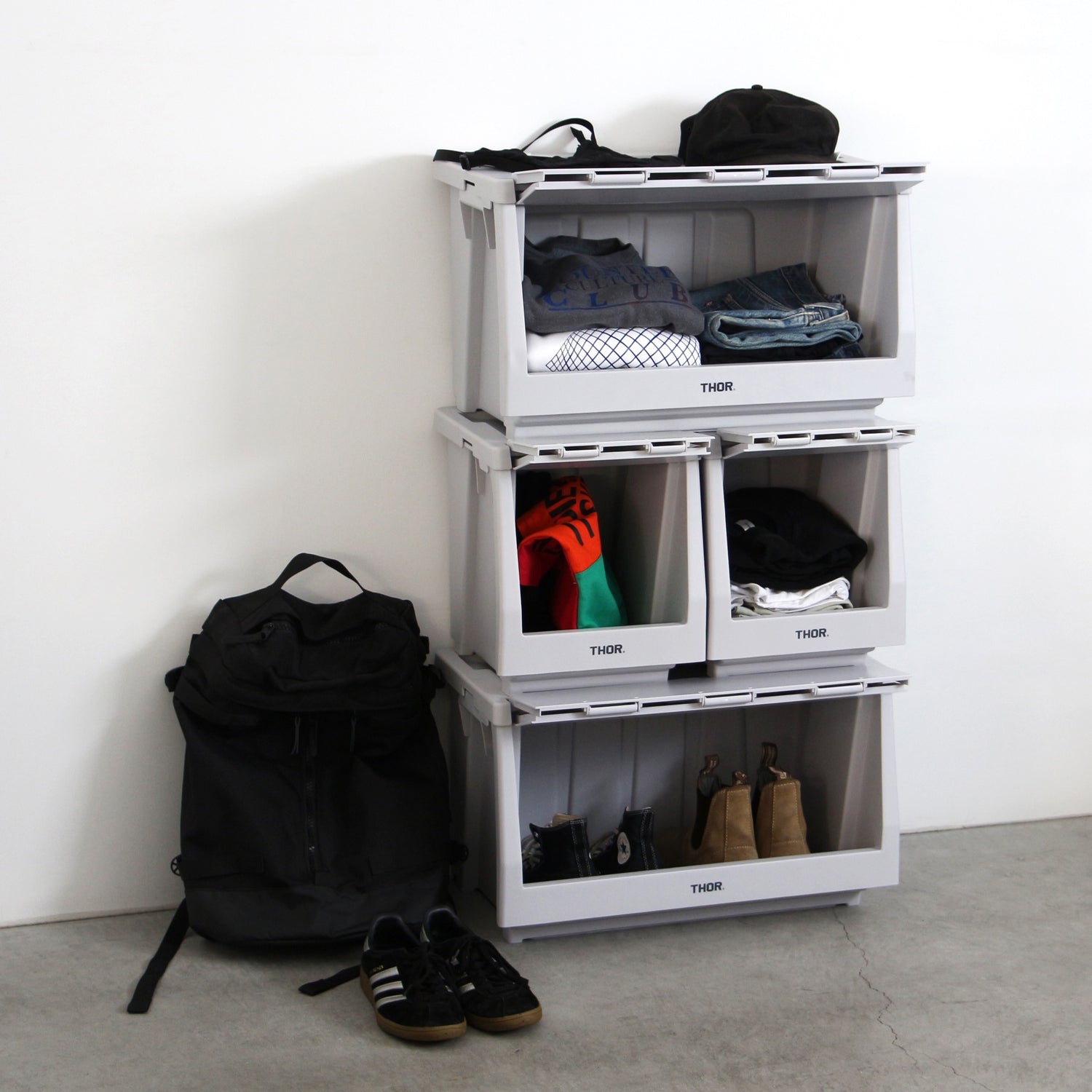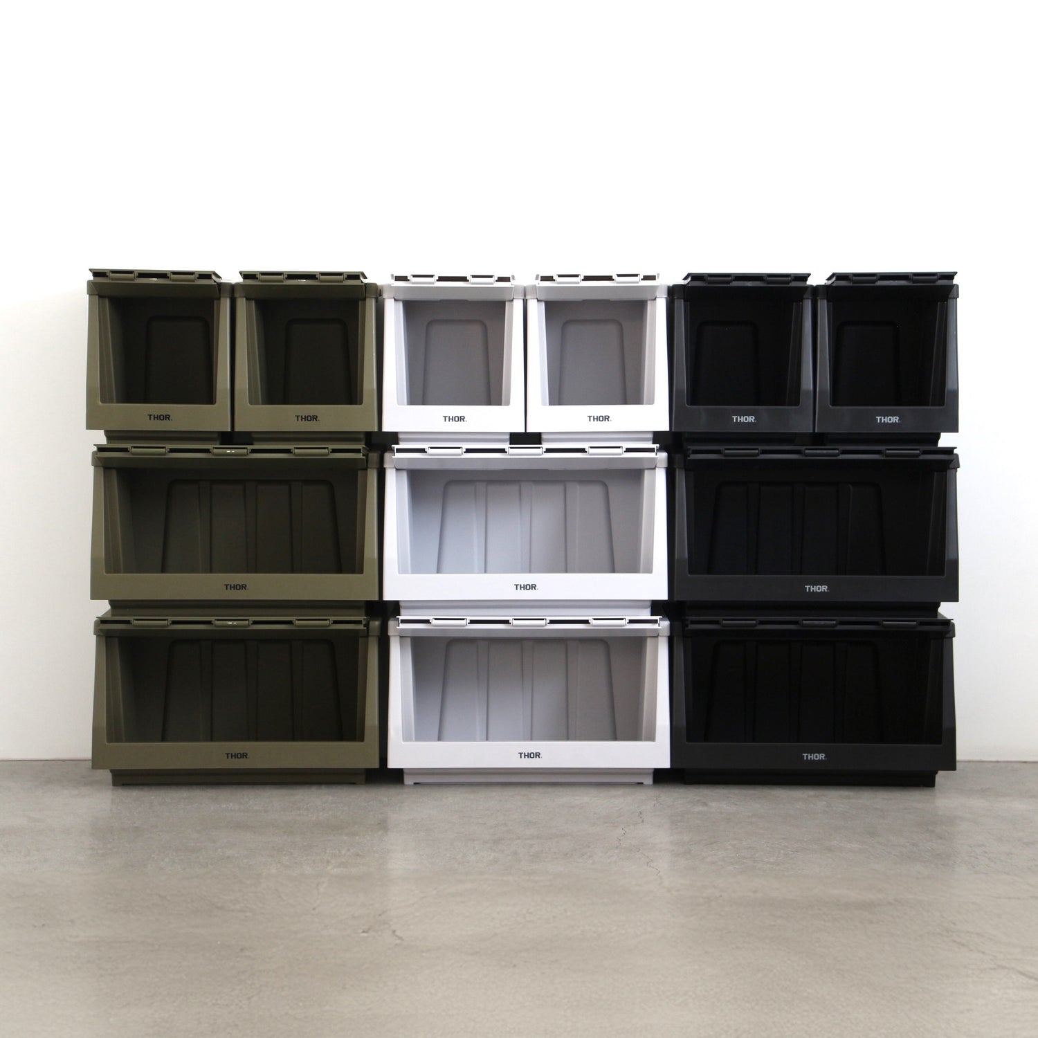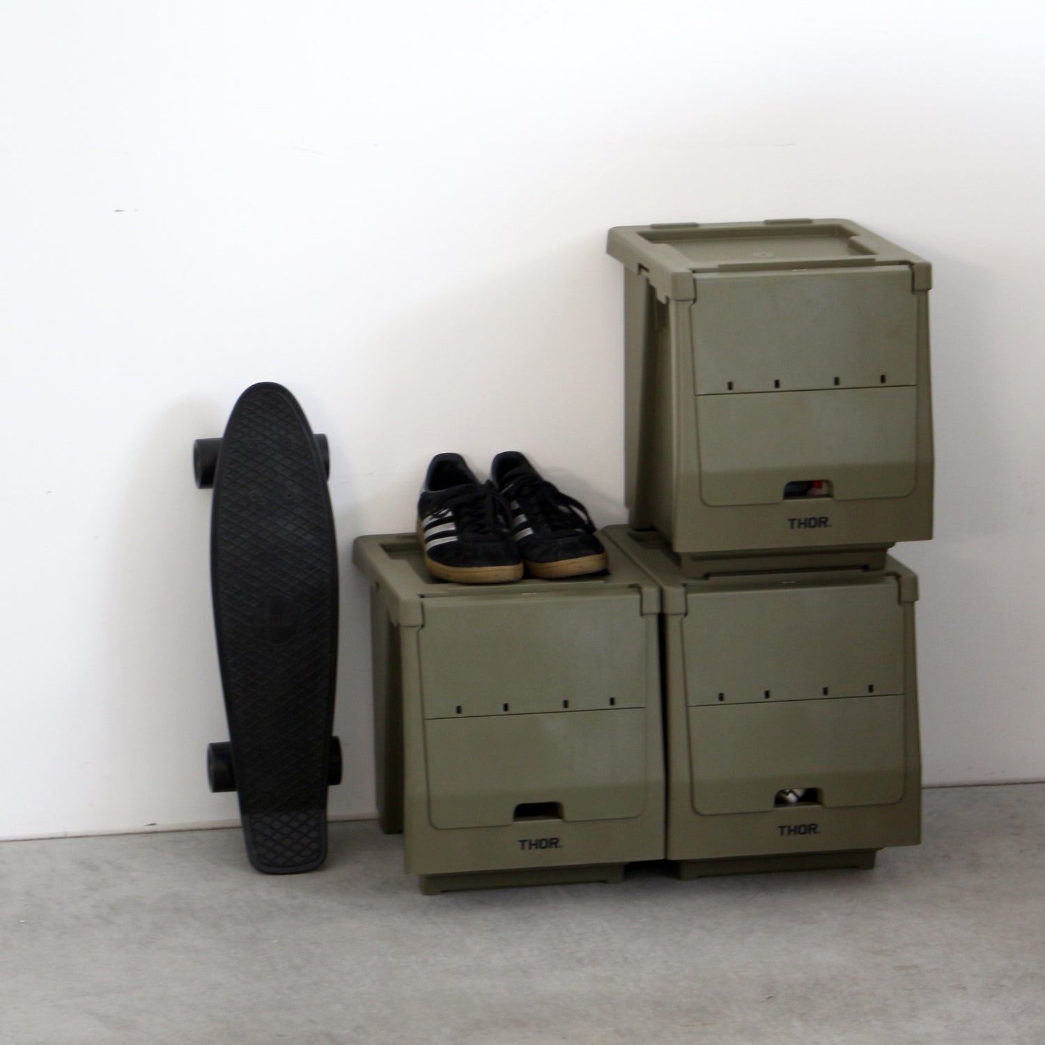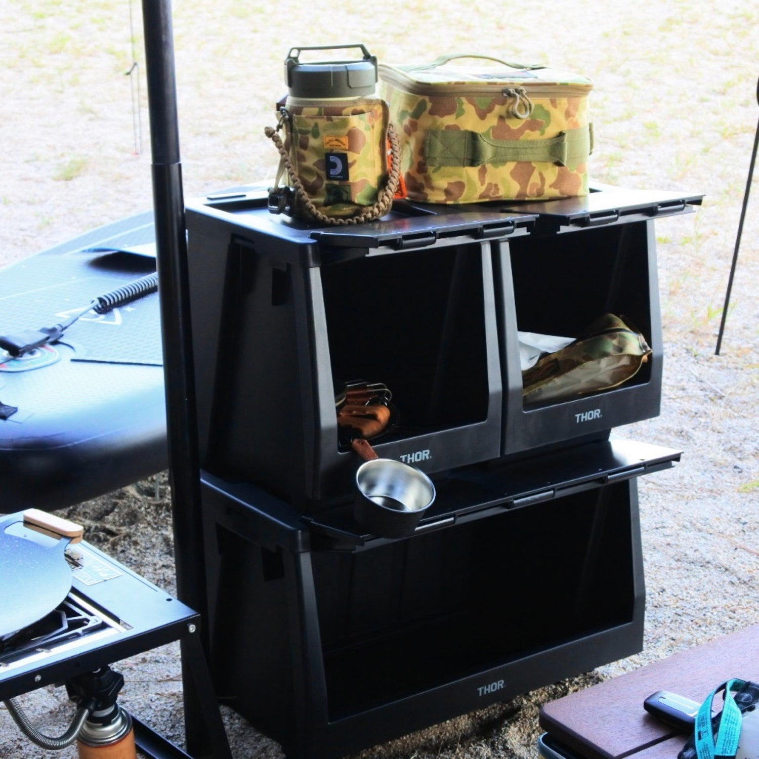 コンテナボックスといえば今や定番のTHORから、室内での収納に特化した「スタッキングシェルフコンテ」が登場したので、我が家にも導入しました。業務用感の強い従来のコンテナに比べて、生活空間にも馴染みやすい仕様。正直、画像だけ見たときは「ちょっと物足りないかも…?」と思ったけど、実際に部屋で使ってみるとこれがちょうどいい。無骨さは残しつつ、ちゃんと生活雑貨に寄り添ってる感じ。前扉は開けっぱなしに固定できて、出し入れもスムーズ。折りたたみコンテナによくある耐荷重20〜30kgとは違い、これは120kgとタフ仕様(さすがTHOR)。アウトドアでももちろん活躍してくれそうです。内寸の高さが33.5cmあるのも地味に優秀で、2Lのペットボトルや雑誌も立てたまま収納できます。ここ、意外と見逃せないポイントかも。20Lと50Lの2サイズ展開で、カラーは3色。20Lはソファ横に置いてサイドテーブルとして使うのもアリ。3段までスタッキングOKなので、50L+20L×2の組み合わせなんかも楽しい。物置部屋の壁一面に並べて、配色を楽しむのもアリです。これは、室内収納の新しい定番になっていく気がしてます。