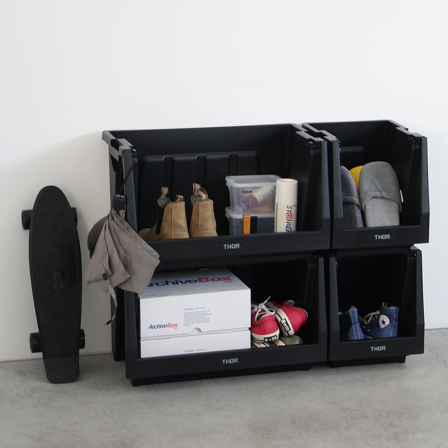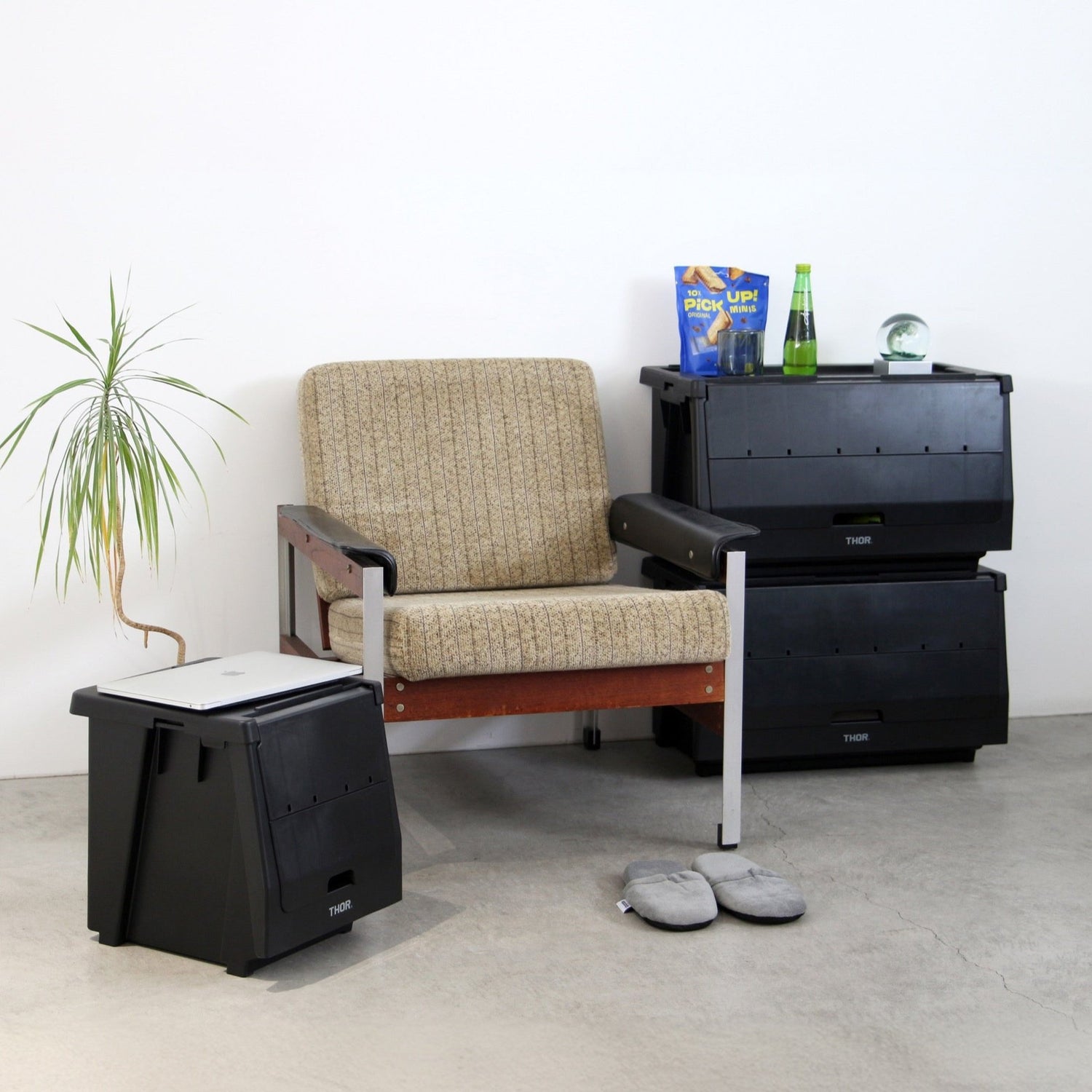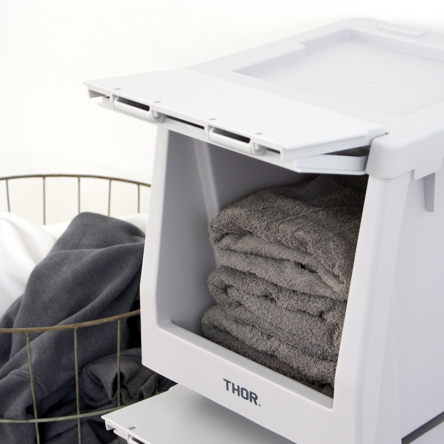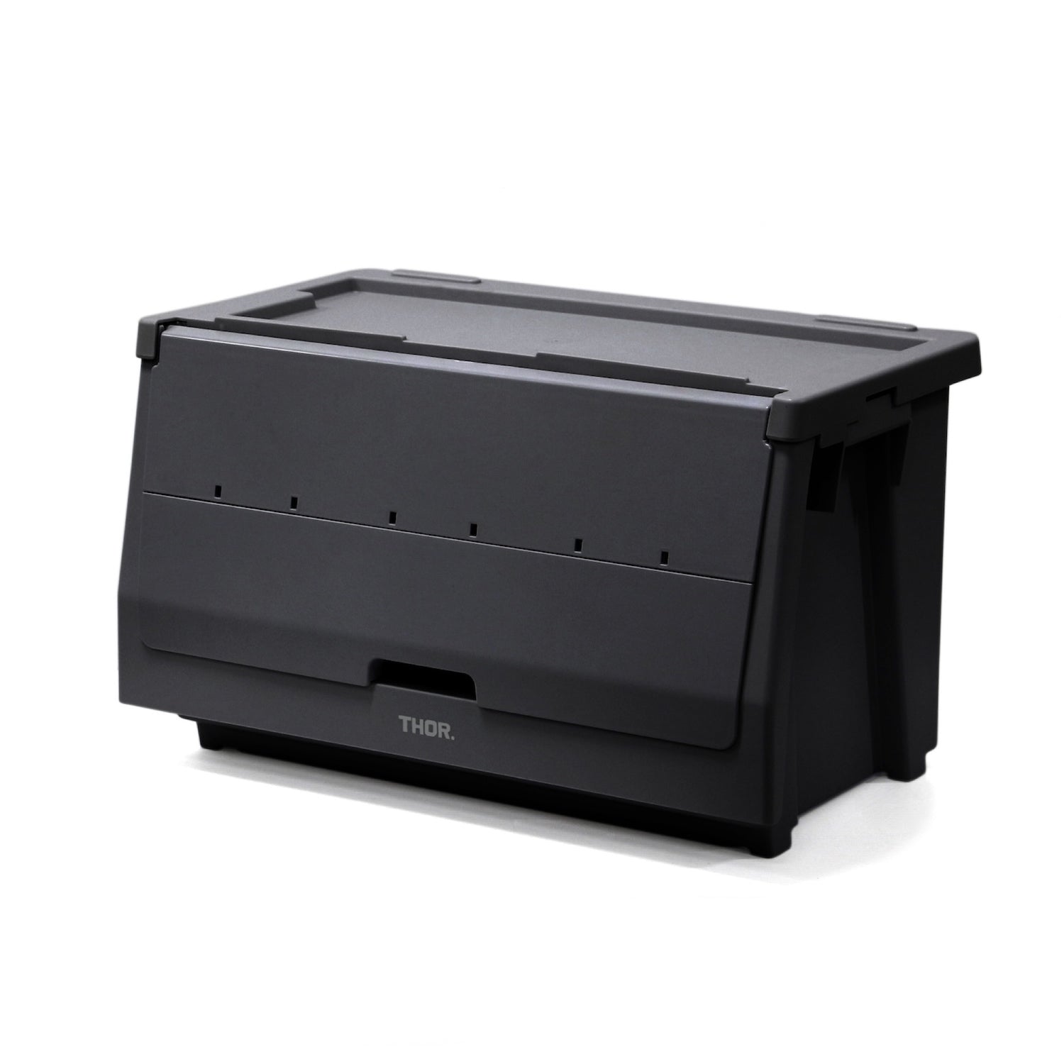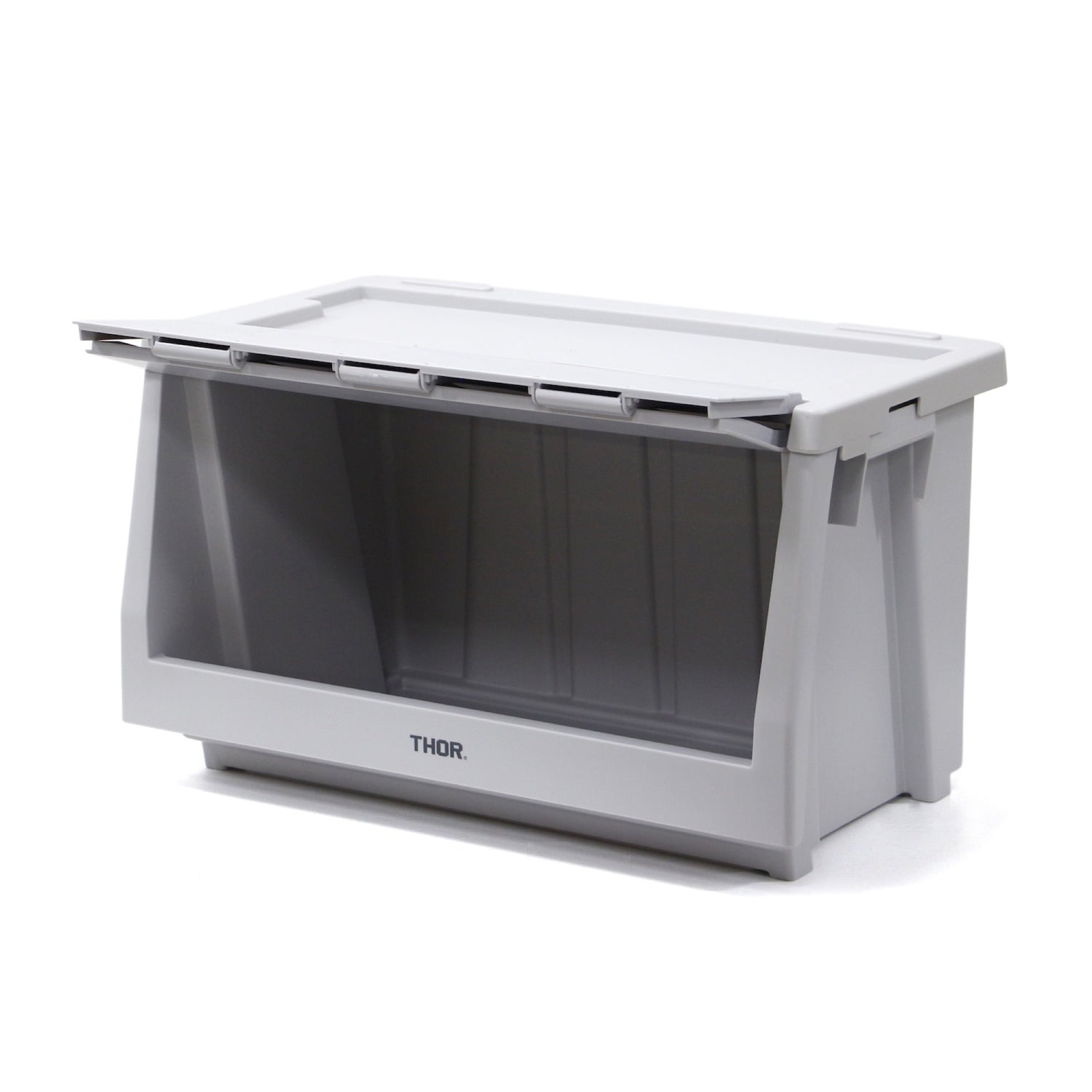 コンテナボックスといえば今や定番のTHORから、室内での収納に特化した「スタッキングシェルフコンテ」が登場したので、我が家にも導入しました。業務用感の強い従来のコンテナに比べて、生活空間にも馴染みやすい仕様。正直、画像だけ見たときは「ちょっと物足りないかも…?」と思ったけど、実際に部屋で使ってみるとこれがちょうどいい。無骨さは残しつつ、ちゃんと生活雑貨に寄り添ってる感じ。前扉は開けっぱなしに固定できて、出し入れもスムーズ。折りたたみコンテナによくある耐荷重20〜30kgとは違い、これは120kgとタフ仕様(さすがTHOR)。アウトドアでももちろん活躍してくれそうです。内寸の高さが33.5cmあるのも地味に優秀で、2Lのペットボトルや雑誌も立てたまま収納できます。ここ、意外と見逃せないポイントかも。20Lと50Lの2サイズ展開で、カラーは3色。20Lはソファ横に置いてサイドテーブルとして使うのもアリ。3段までスタッキングOKなので、50L+20L×2の組み合わせなんかも楽しい。物置部屋の壁一面に並べて、配色を楽しむのもアリです。これは、室内収納の新しい定番になっていく気がしてます。