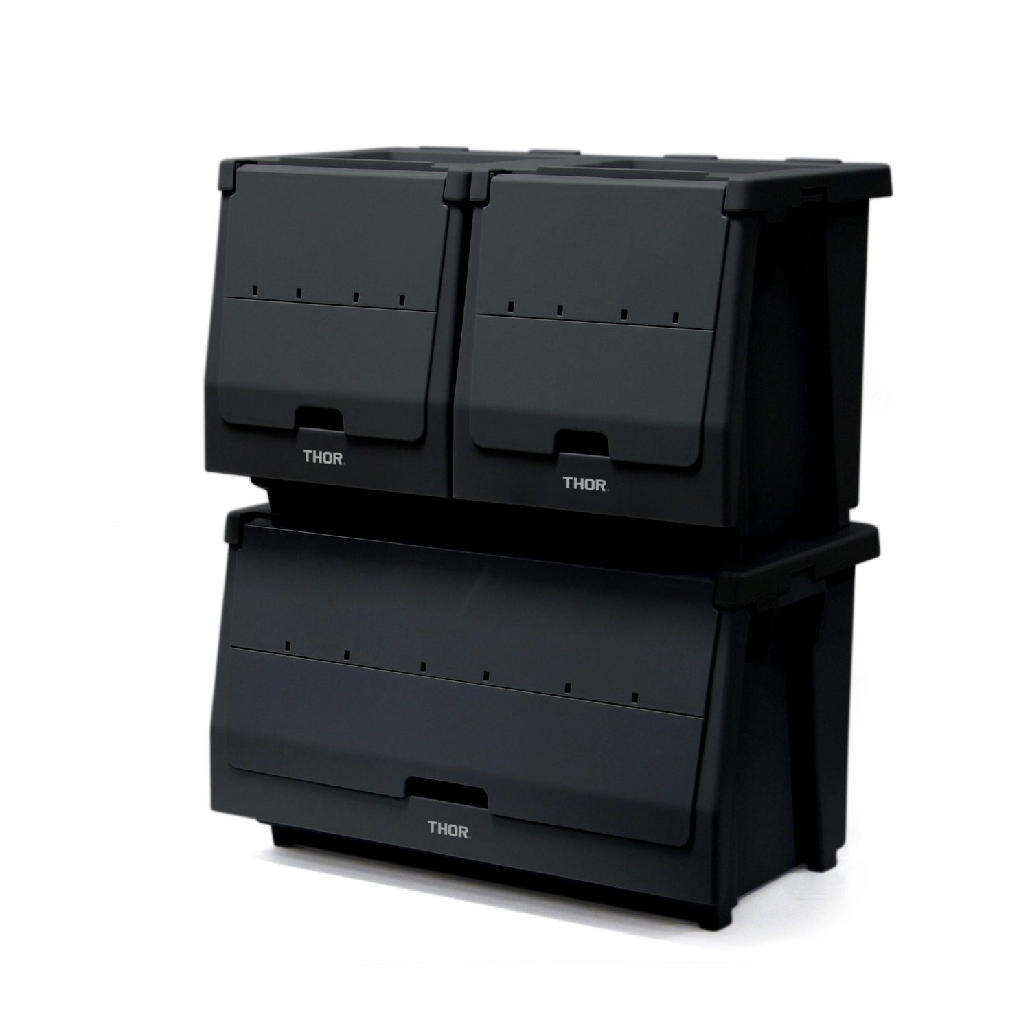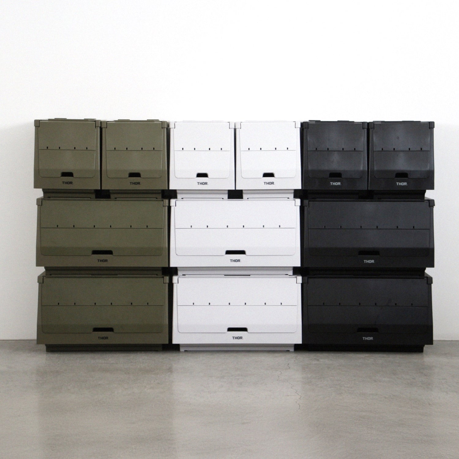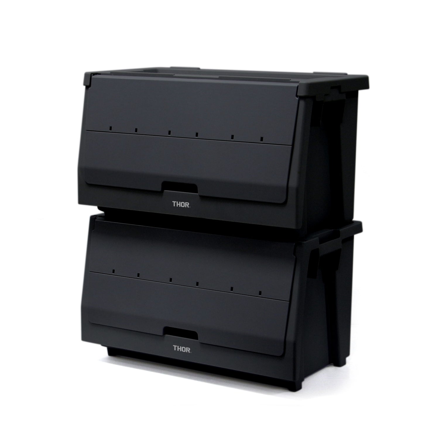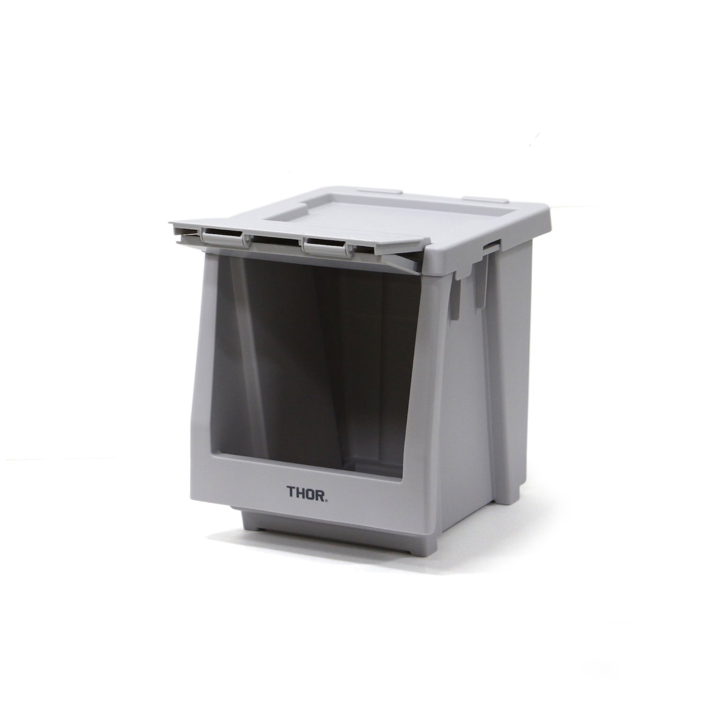 コンテナボックスといえば今や定番のTHORから、室内での収納に特化した「スタッキングシェルフコンテ」が登場したので、我が家にも導入しました。業務用感の強い従来のコンテナに比べて、生活空間にも馴染みやすい仕様。正直、画像だけ見たときは「ちょっと物足りないかも…?」と思ったけど、実際に部屋で使ってみるとこれがちょうどいい。無骨さは残しつつ、ちゃんと生活雑貨に寄り添ってる感じ。前扉は開けっぱなしに固定できて、出し入れもスムーズ。折りたたみコンテナによくある耐荷重20〜30kgとは違い、これは120kgとタフ仕様(さすがTHOR)。アウトドアでももちろん活躍してくれそうです。内寸の高さが33.5cmあるのも地味に優秀で、2Lのペットボトルや雑誌も立てたまま収納できます。ここ、意外と見逃せないポイントかも。20Lと50Lの2サイズ展開で、カラーは3色。20Lはソファ横に置いてサイドテーブルとして使うのもアリ。3段までスタッキングOKなので、50L+20L×2の組み合わせなんかも楽しい。物置部屋の壁一面に並べて、配色を楽しむのもアリです。これは、室内収納の新しい定番になっていく気がしてます。