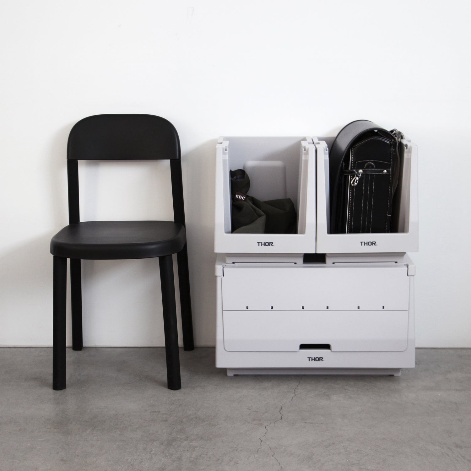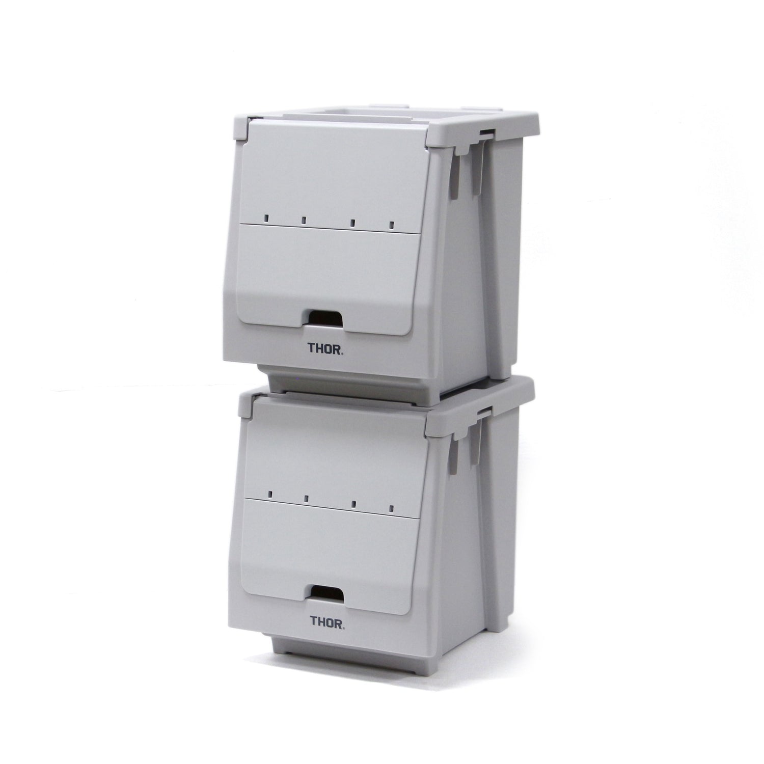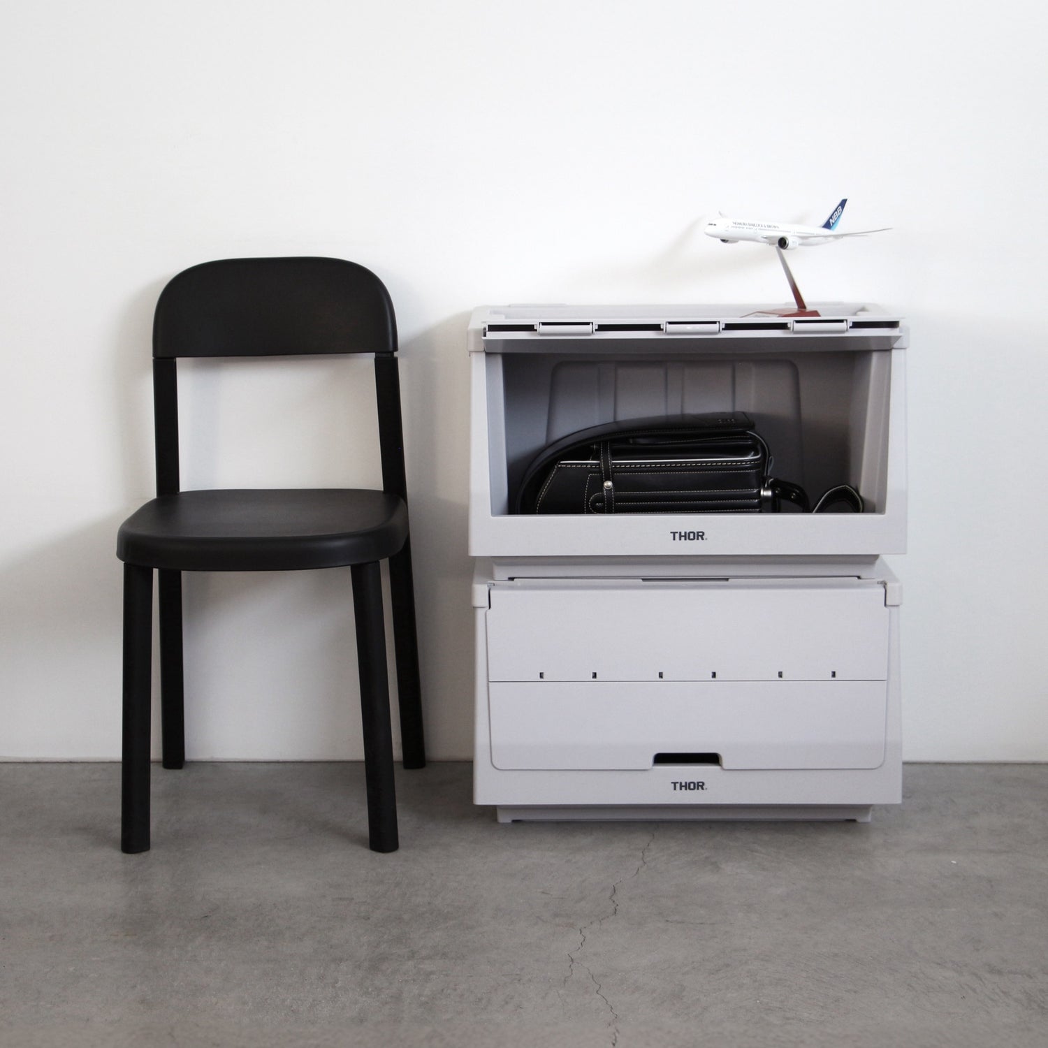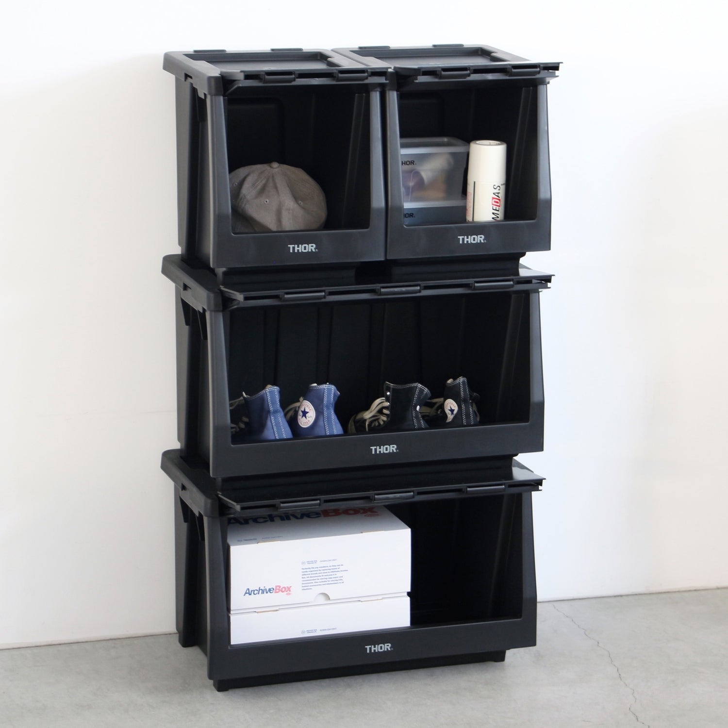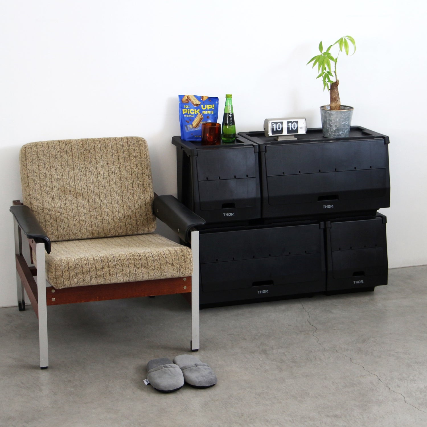 コンテナボックスといえば今や定番のTHORから、室内での収納に特化した「スタッキングシェルフコンテ」が登場したので、我が家にも導入しました。業務用感の強い従来のコンテナに比べて、生活空間にも馴染みやすい仕様。正直、画像だけ見たときは「ちょっと物足りないかも…?」と思ったけど、実際に部屋で使ってみるとこれがちょうどいい。無骨さは残しつつ、ちゃんと生活雑貨に寄り添ってる感じ。前扉は開けっぱなしに固定できて、出し入れもスムーズ。折りたたみコンテナによくある耐荷重20〜30kgとは違い、これは120kgとタフ仕様(さすがTHOR)。アウトドアでももちろん活躍してくれそうです。内寸の高さが33.5cmあるのも地味に優秀で、2Lのペットボトルや雑誌も立てたまま収納できます。ここ、意外と見逃せないポイントかも。20Lと50Lの2サイズ展開で、カラーは3色。20Lはソファ横に置いてサイドテーブルとして使うのもアリ。3段までスタッキングOKなので、50L+20L×2の組み合わせなんかも楽しい。物置部屋の壁一面に並べて、配色を楽しむのもアリです。これは、室内収納の新しい定番になっていく気がしてます。