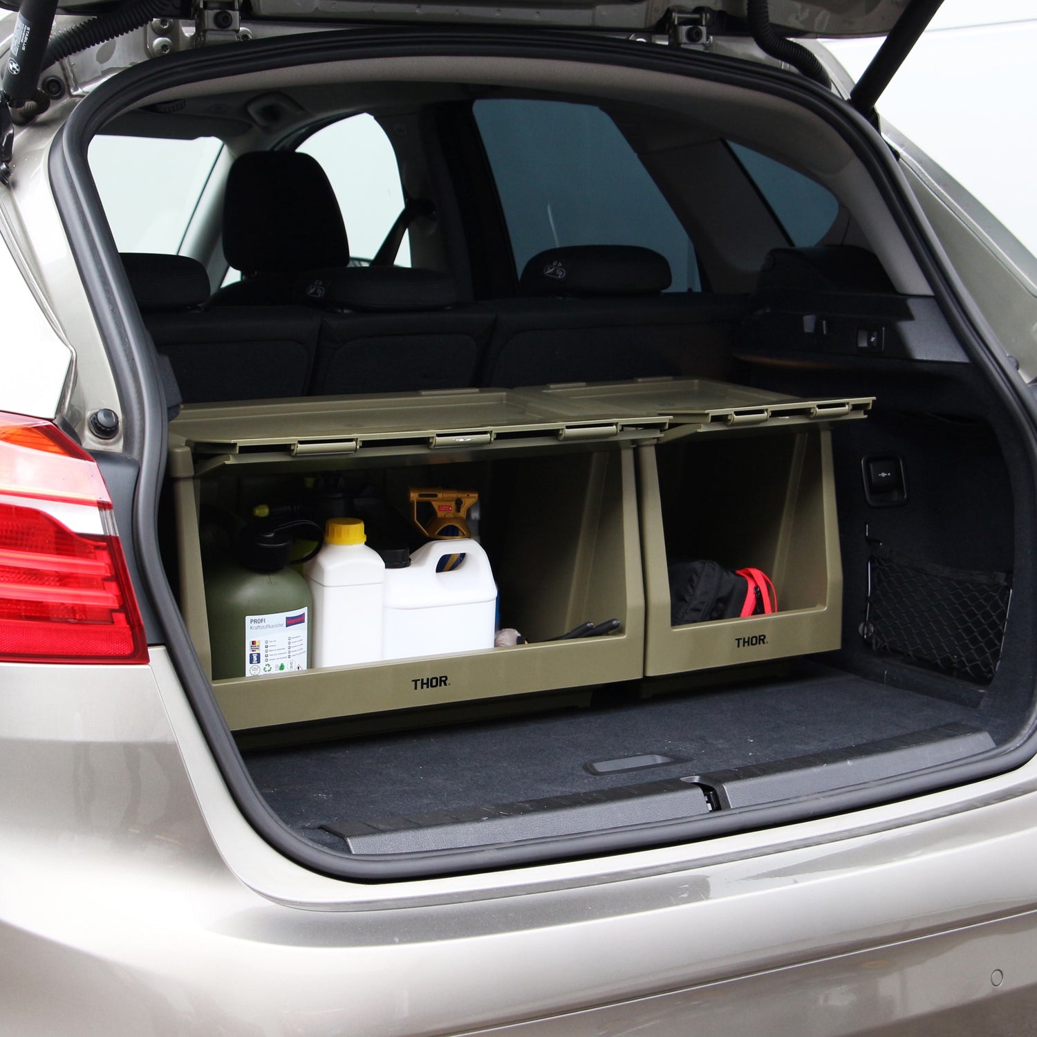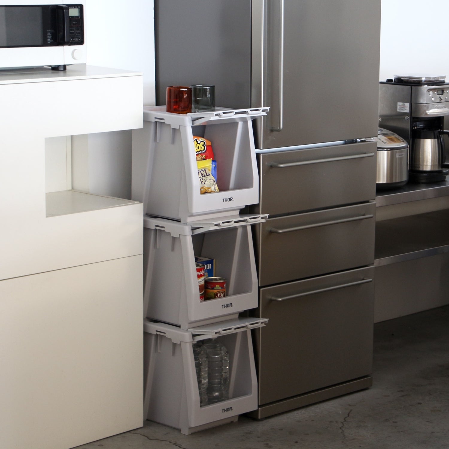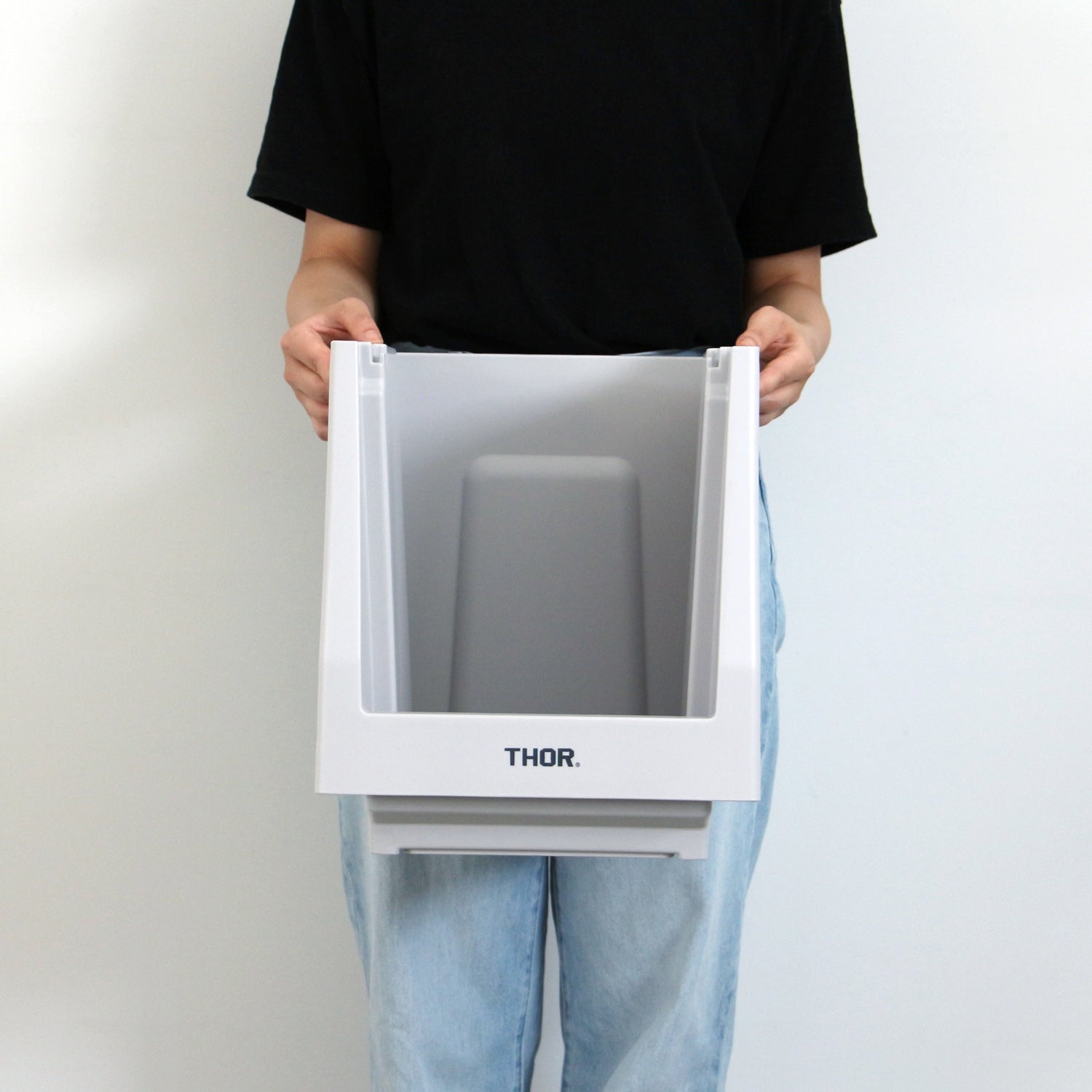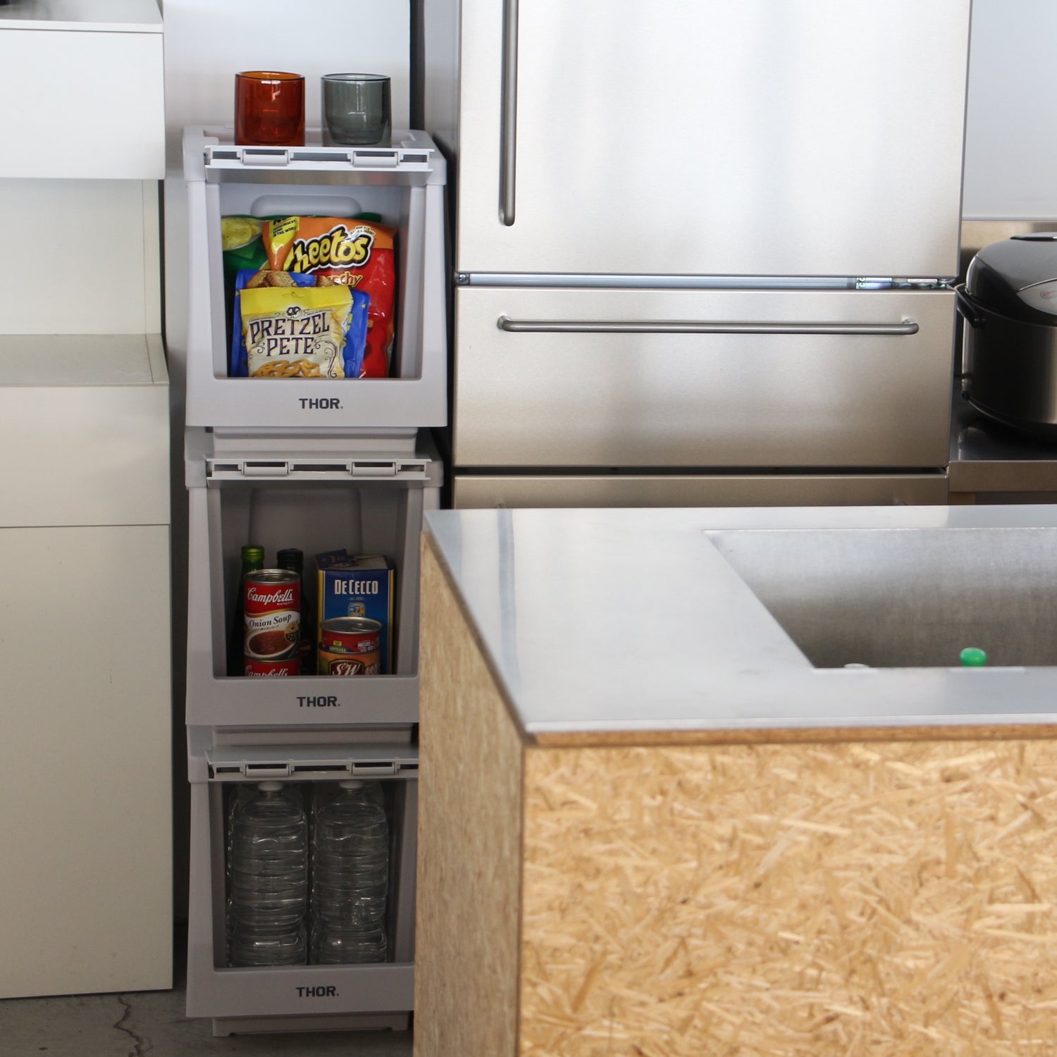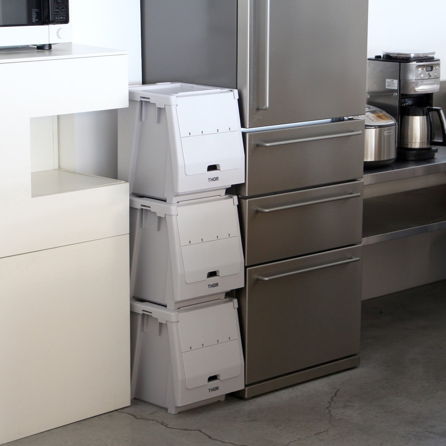 コンテナボックスといえば今や定番のTHORから、室内での収納に特化した「スタッキングシェルフコンテ」が登場したので、我が家にも導入しました。業務用感の強い従来のコンテナに比べて、生活空間にも馴染みやすい仕様。正直、画像だけ見たときは「ちょっと物足りないかも…?」と思ったけど、実際に部屋で使ってみるとこれがちょうどいい。無骨さは残しつつ、ちゃんと生活雑貨に寄り添ってる感じ。前扉は開けっぱなしに固定できて、出し入れもスムーズ。折りたたみコンテナによくある耐荷重20〜30kgとは違い、これは120kgとタフ仕様(さすがTHOR)。アウトドアでももちろん活躍してくれそうです。内寸の高さが33.5cmあるのも地味に優秀で、2Lのペットボトルや雑誌も立てたまま収納できます。ここ、意外と見逃せないポイントかも。20Lと50Lの2サイズ展開で、カラーは3色。20Lはソファ横に置いてサイドテーブルとして使うのもアリ。3段までスタッキングOKなので、50L+20L×2の組み合わせなんかも楽しい。物置部屋の壁一面に並べて、配色を楽しむのもアリです。これは、室内収納の新しい定番になっていく気がしてます。