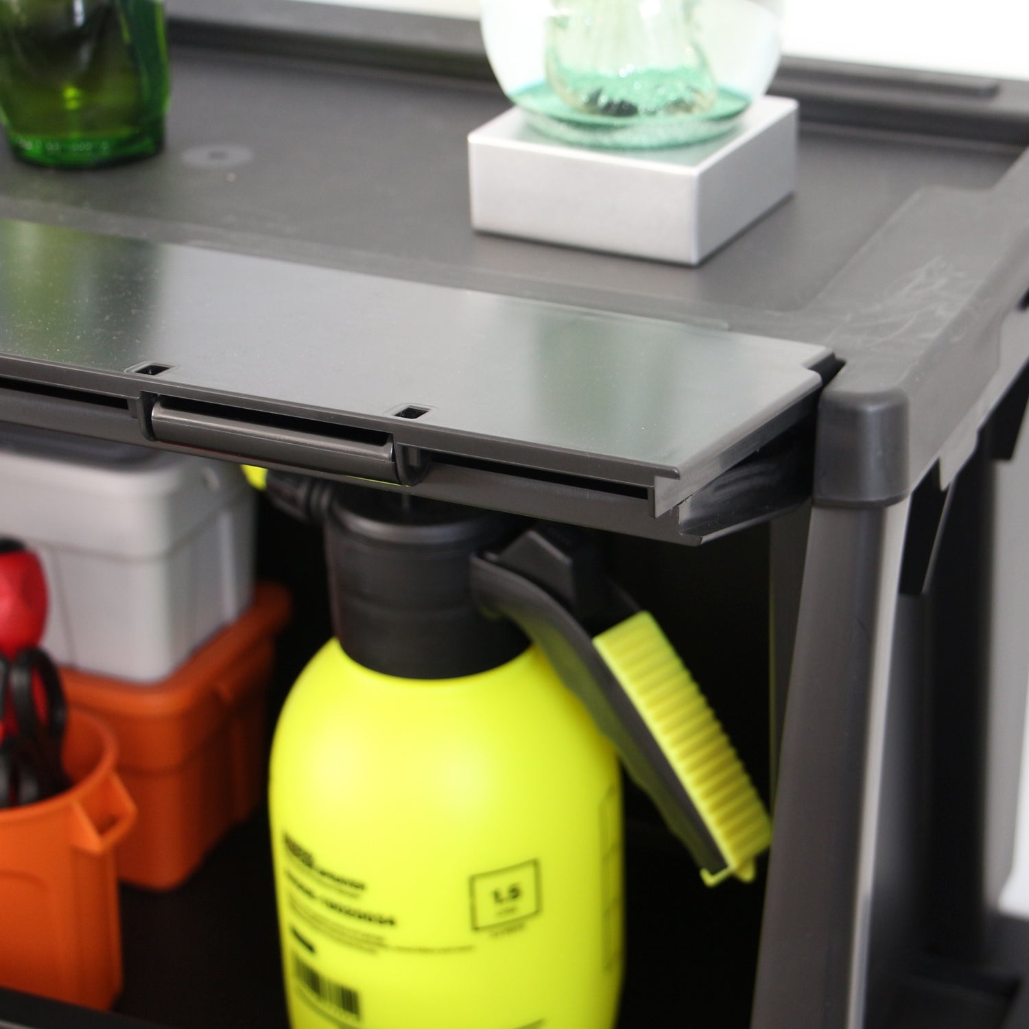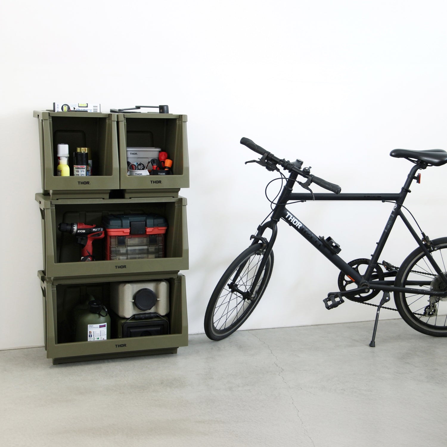 カラーはライトグレー・オリーブ・ブラックの3色展開。どの色も落ち着いたトーンで、室内収納やガレージ収納、アウトドアなど、さまざまな場面で使いやすいカラーリングになっています。
