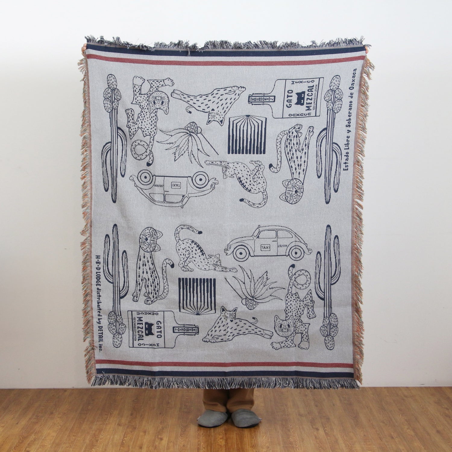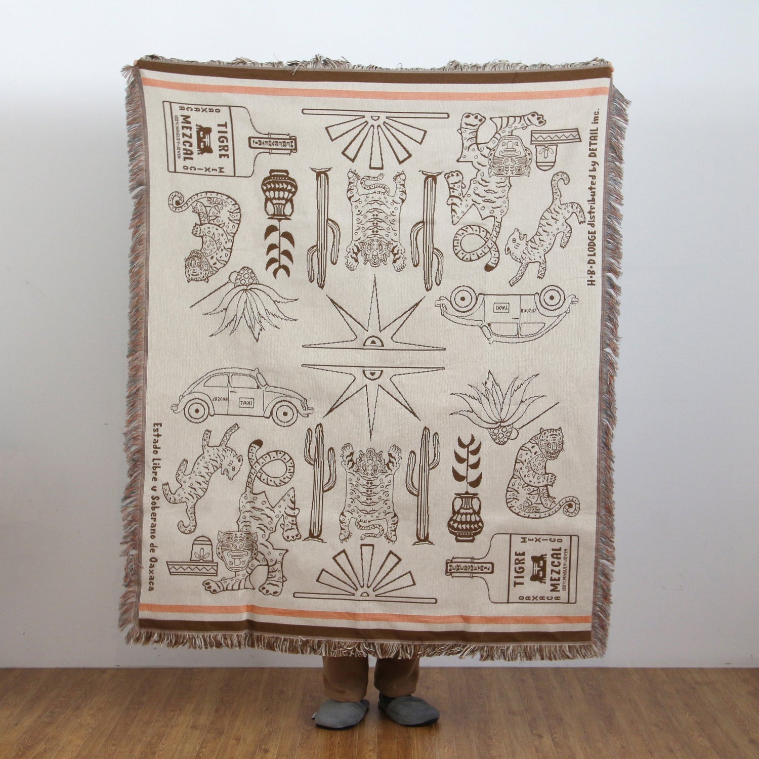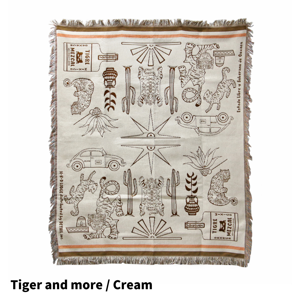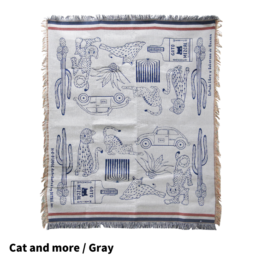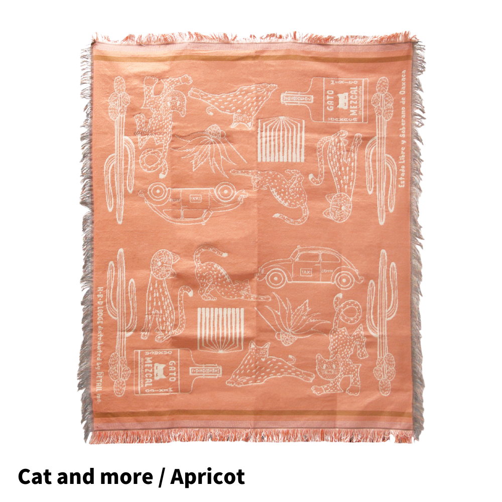 メキシコ原産の蒸留酒である"メスカル"の瓶・タクシー・カクタス・草・木、そしてタイガーor猫。メキシコにまつわるモチーフと緩やかな時間の流れや自由奔放さを、スローケット1枚のなかに表現しました。素材は、ポリエステルの耐久性とコットンの通気性の両方を特性を備えたポリエステルコットン生地。少し厚みがありながらも艶感があり、触り心地の良い通年ご使用いただける生地感です。インテリアに馴染みやすいカラーリングとデザインで、性別を問わず幅広くご使用いただけます。ソファやベッドにさらりと掛けて、肩から羽織れる大判サイズは膝掛けとして、タペストリーのように壁面アートとしてなど、様々なシーンでお部屋を彩ってくれます。