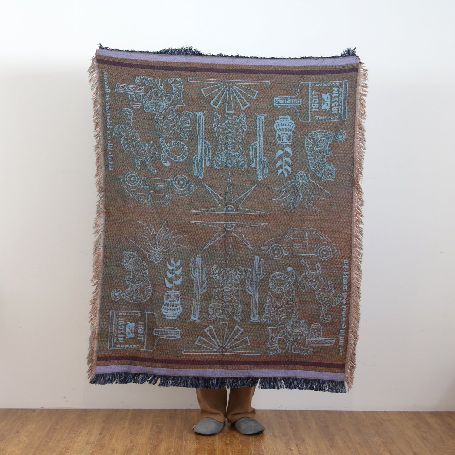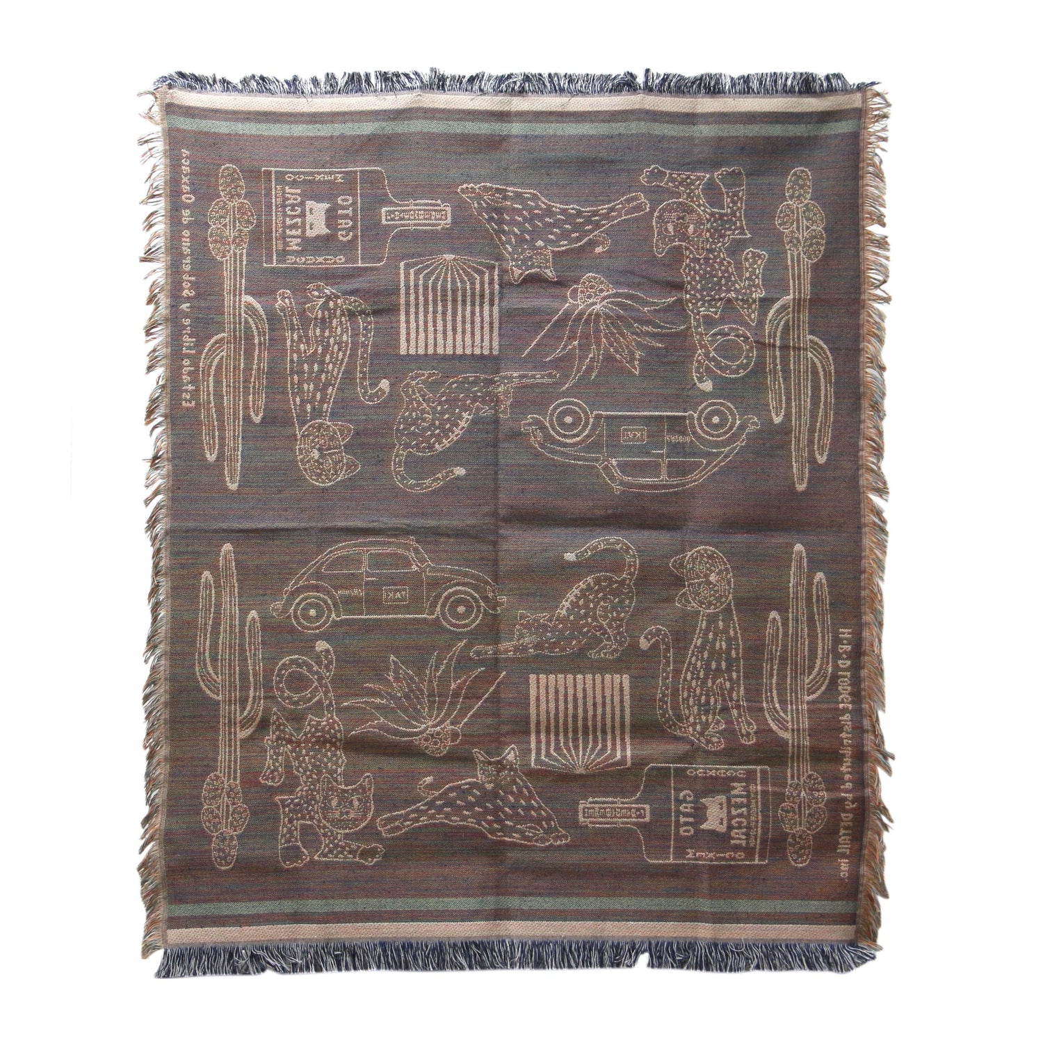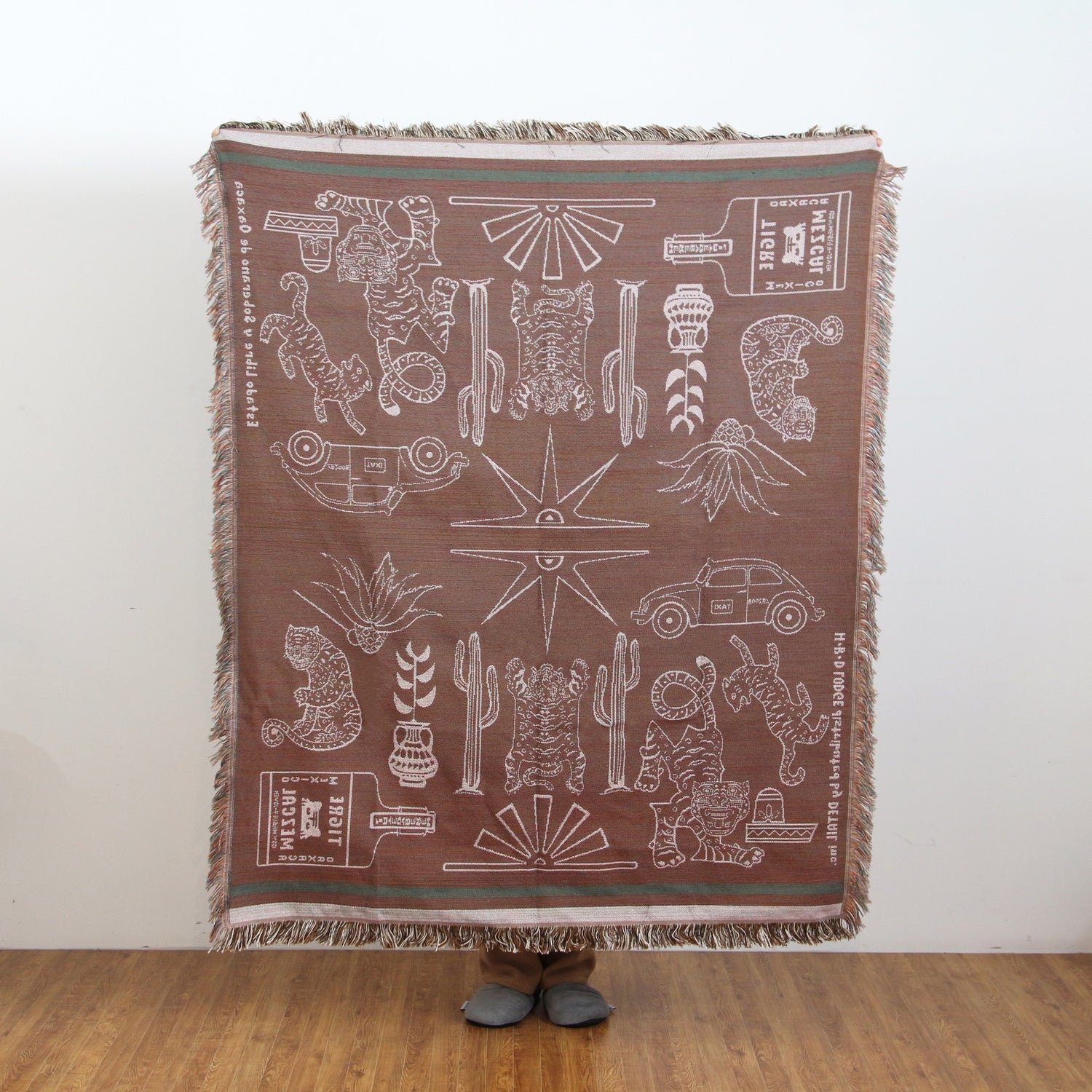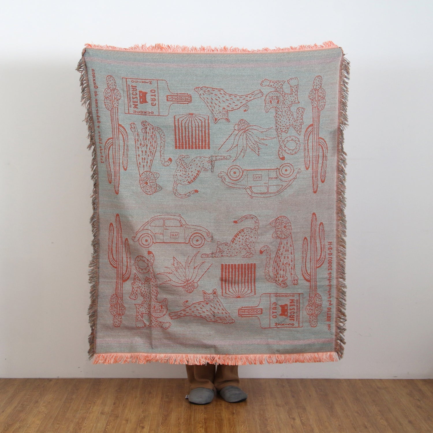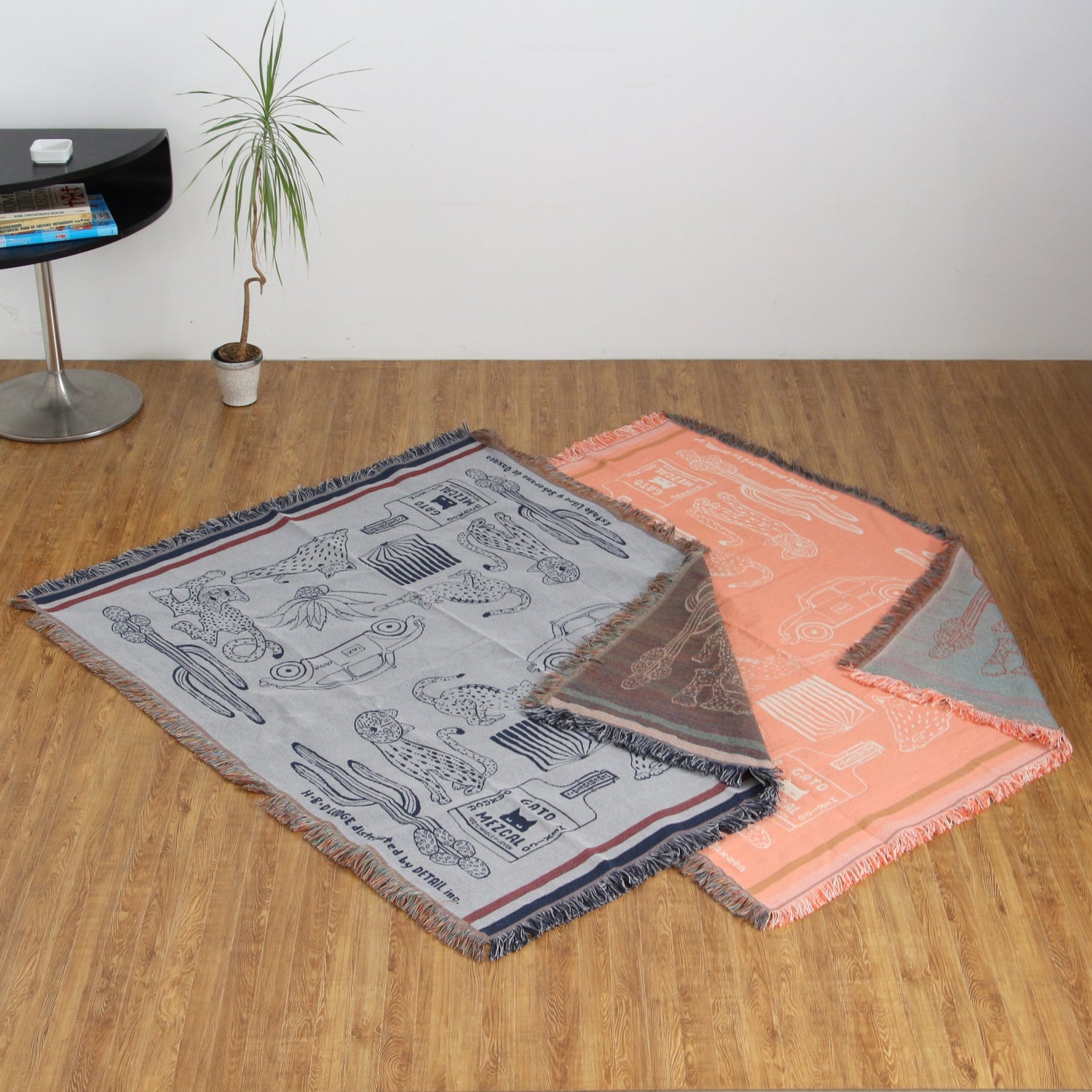 メキシコ原産の蒸留酒である"メスカル"の瓶・タクシー・カクタス・草・木、そしてタイガーor猫。メキシコにまつわるモチーフと緩やかな時間の流れや自由奔放さを、スローケット1枚のなかに表現しました。素材は、ポリエステルの耐久性とコットンの通気性の両方を特性を備えたポリエステルコットン生地。少し厚みがありながらも艶感があり、触り心地の良い通年ご使用いただける生地感です。インテリアに馴染みやすいカラーリングとデザインで、性別を問わず幅広くご使用いただけます。ソファやベッドにさらりと掛けて、肩から羽織れる大判サイズは膝掛けとして、タペストリーのように壁面アートとしてなど、様々なシーンでお部屋を彩ってくれます。