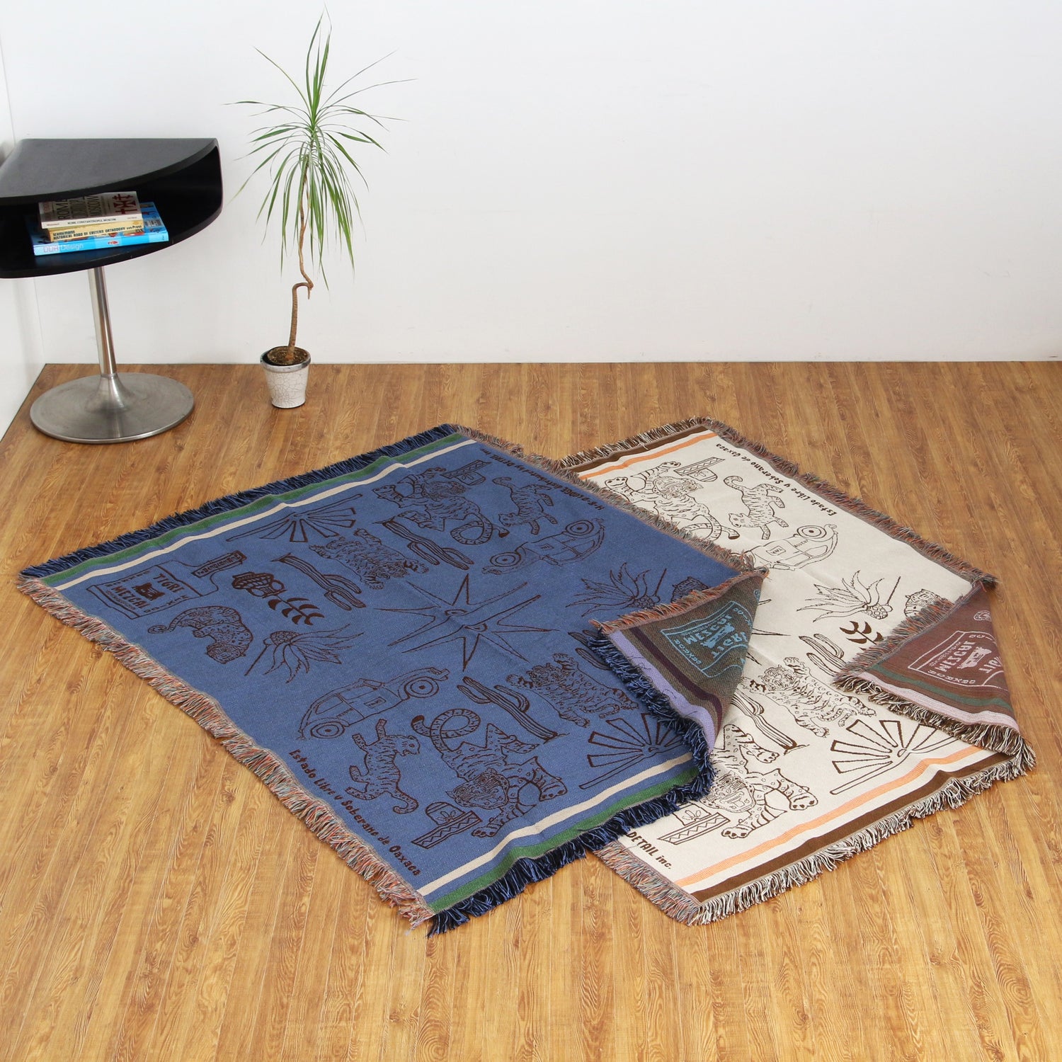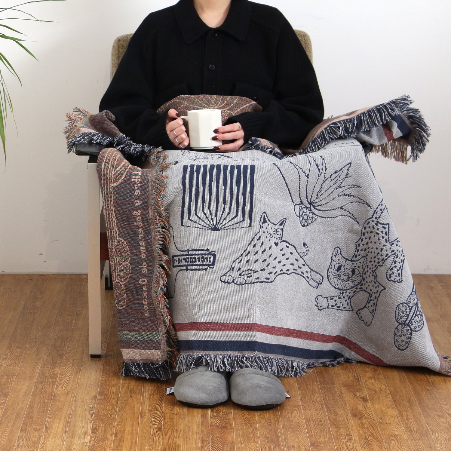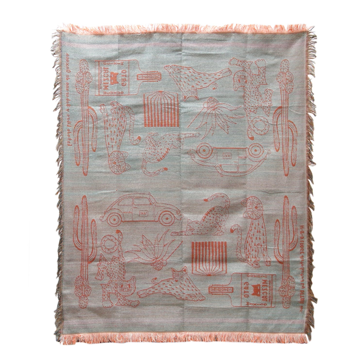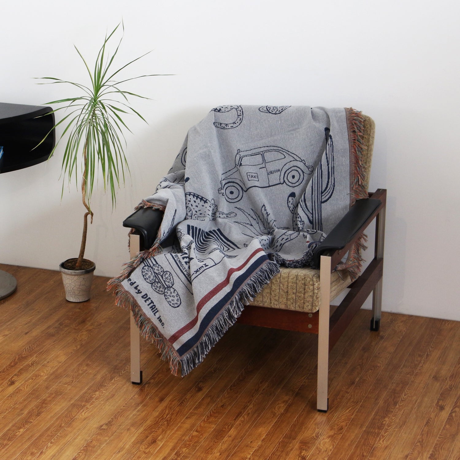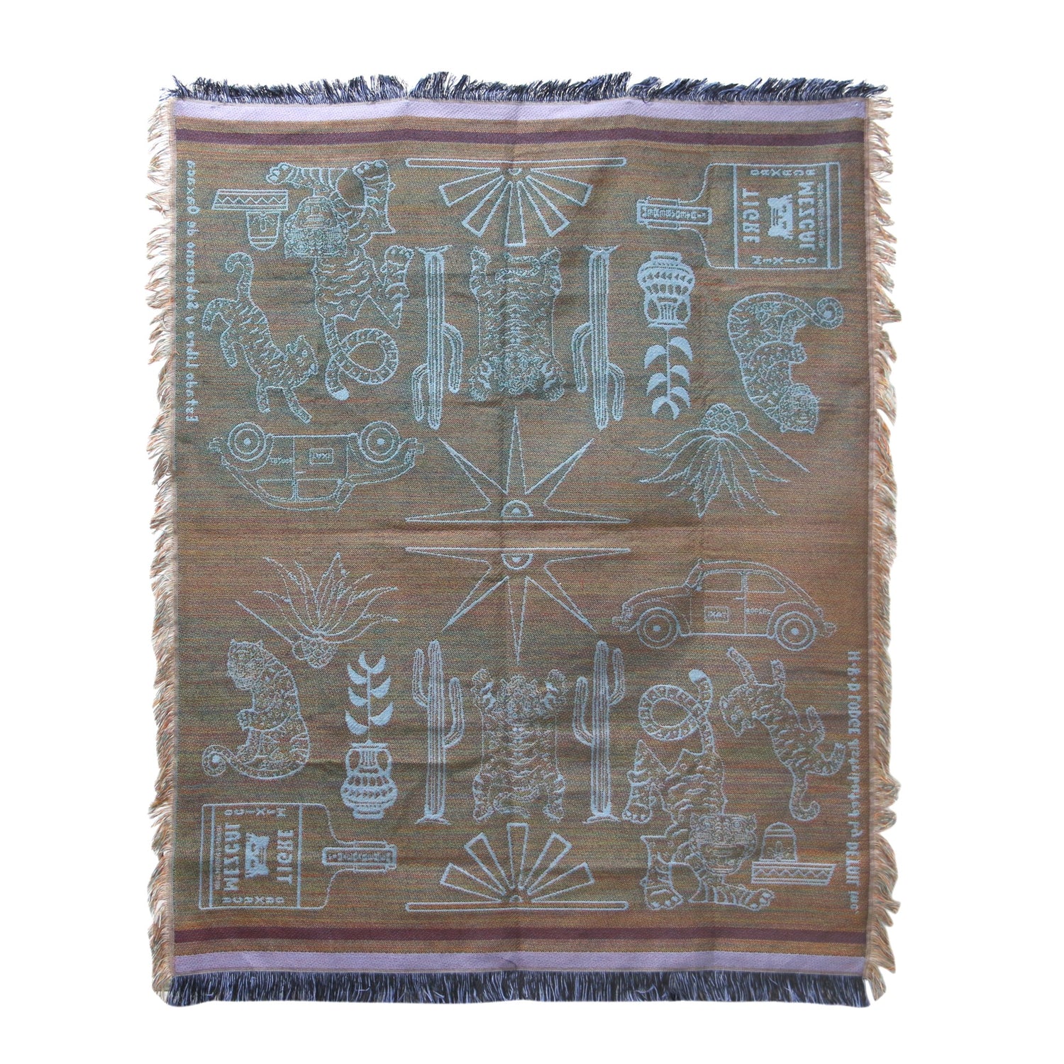 メキシコ原産の蒸留酒である"メスカル"の瓶・タクシー・カクタス・草・木、そしてタイガーor猫。メキシコにまつわるモチーフと緩やかな時間の流れや自由奔放さを、スローケット1枚のなかに表現しました。素材は、ポリエステルの耐久性とコットンの通気性の両方を特性を備えたポリエステルコットン生地。少し厚みがありながらも艶感があり、触り心地の良い通年ご使用いただける生地感です。インテリアに馴染みやすいカラーリングとデザインで、性別を問わず幅広くご使用いただけます。ソファやベッドにさらりと掛けて、肩から羽織れる大判サイズは膝掛けとして、タペストリーのように壁面アートとしてなど、様々なシーンでお部屋を彩ってくれます。