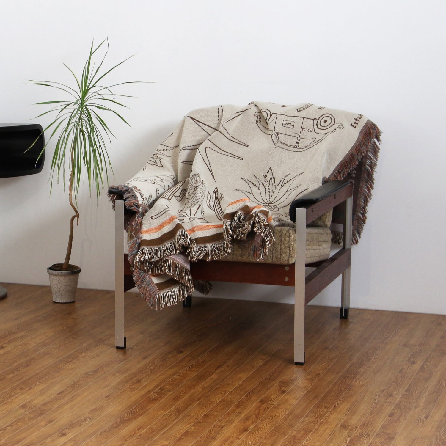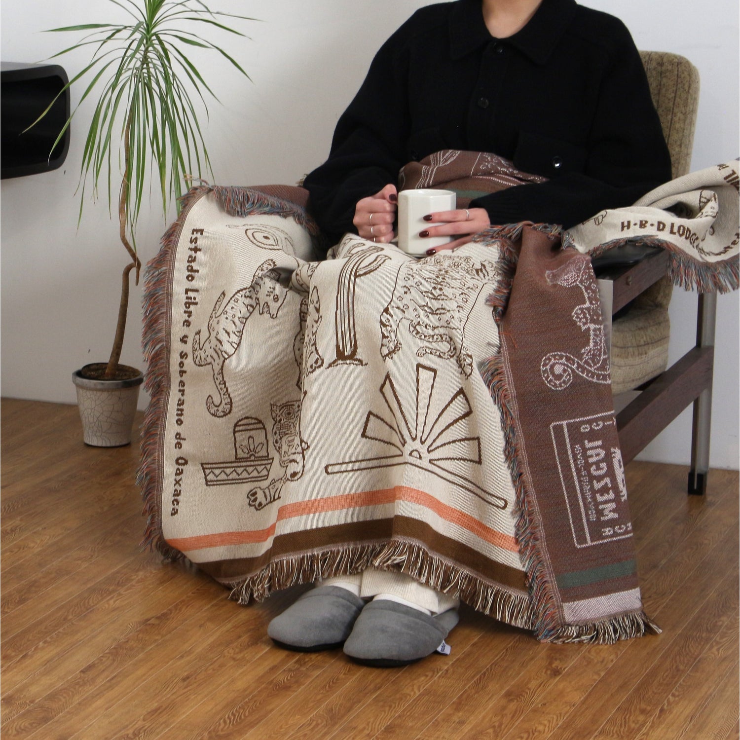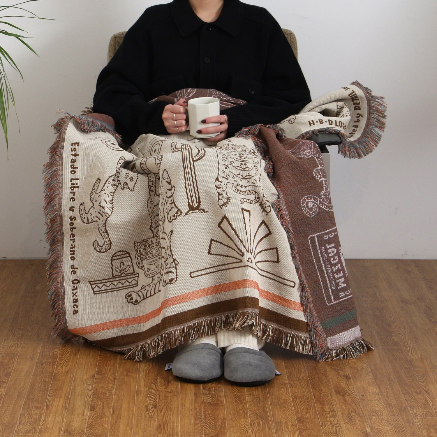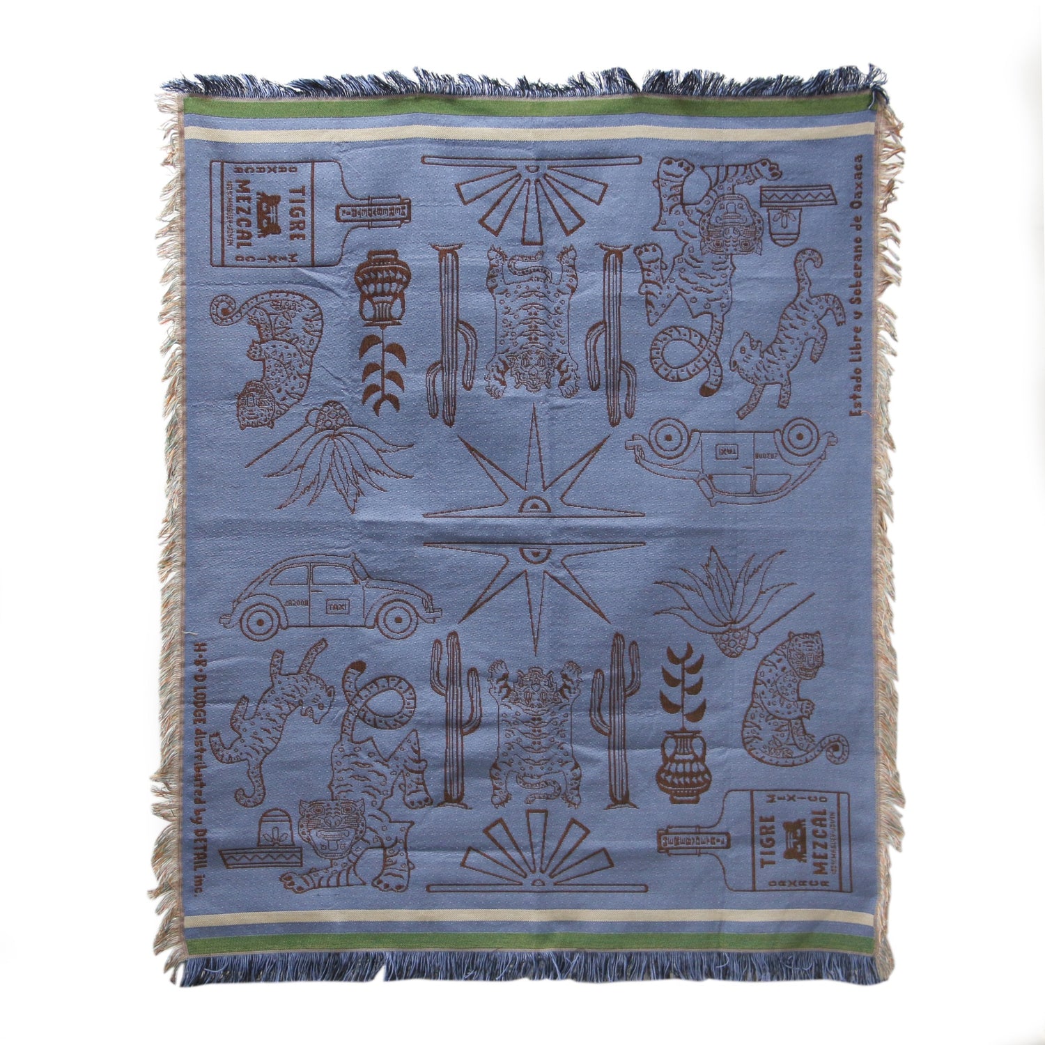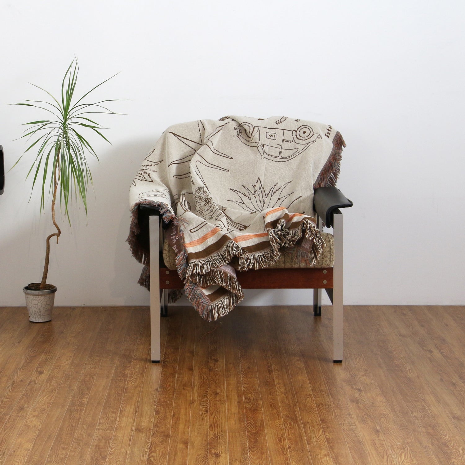 メキシコ原産の蒸留酒である"メスカル"の瓶・タクシー・カクタス・草・木、そしてタイガーor猫。メキシコにまつわるモチーフと緩やかな時間の流れや自由奔放さを、スローケット1枚のなかに表現しました。素材は、ポリエステルの耐久性とコットンの通気性の両方を特性を備えたポリエステルコットン生地。少し厚みがありながらも艶感があり、触り心地の良い通年ご使用いただける生地感です。インテリアに馴染みやすいカラーリングとデザインで、性別を問わず幅広くご使用いただけます。ソファやベッドにさらりと掛けて、肩から羽織れる大判サイズは膝掛けとして、タペストリーのように壁面アートとしてなど、様々なシーンでお部屋を彩ってくれます。
