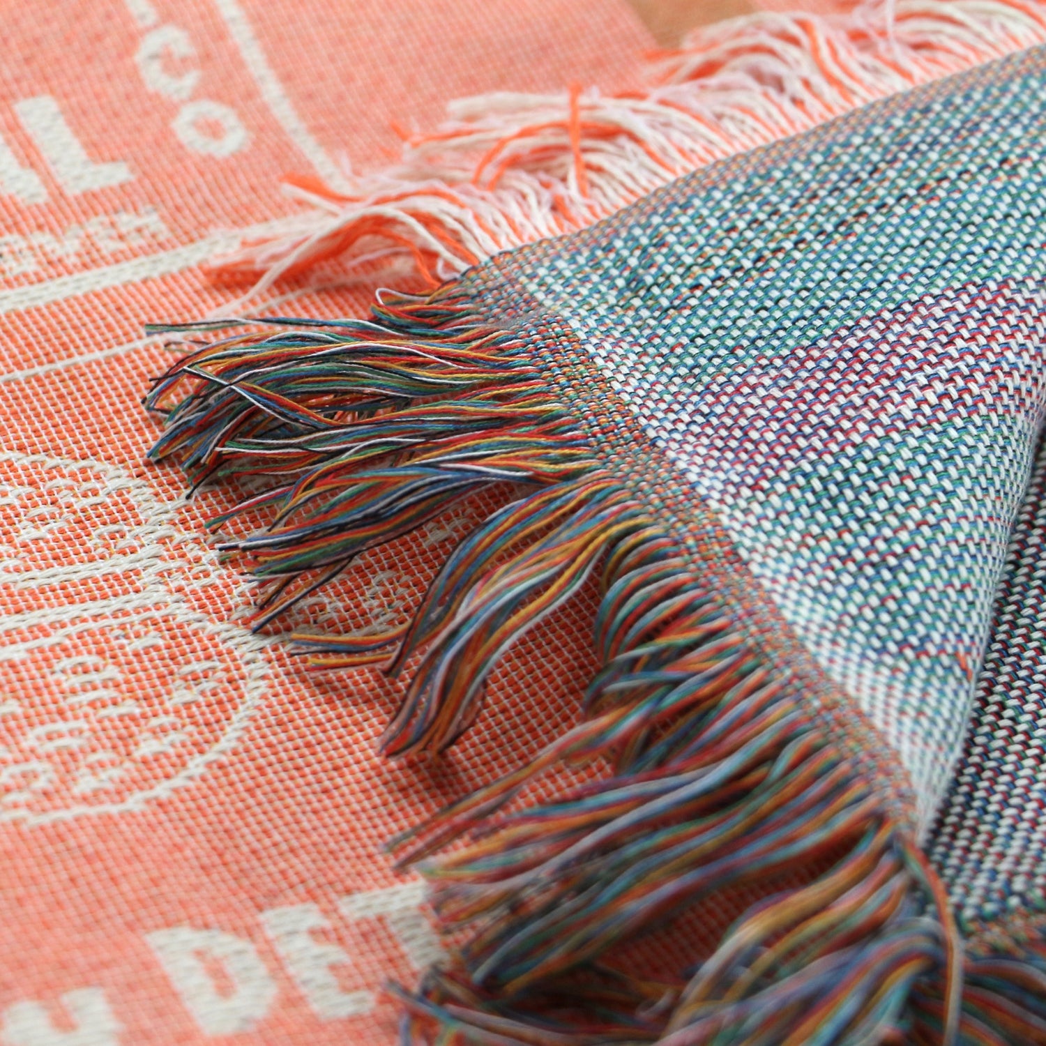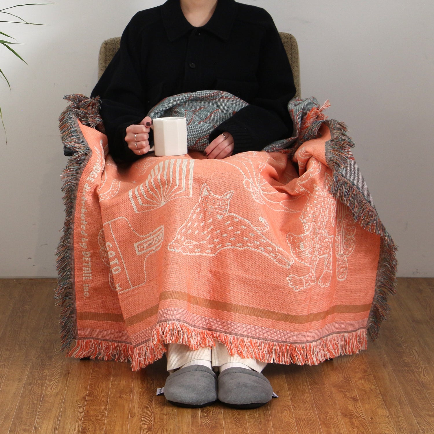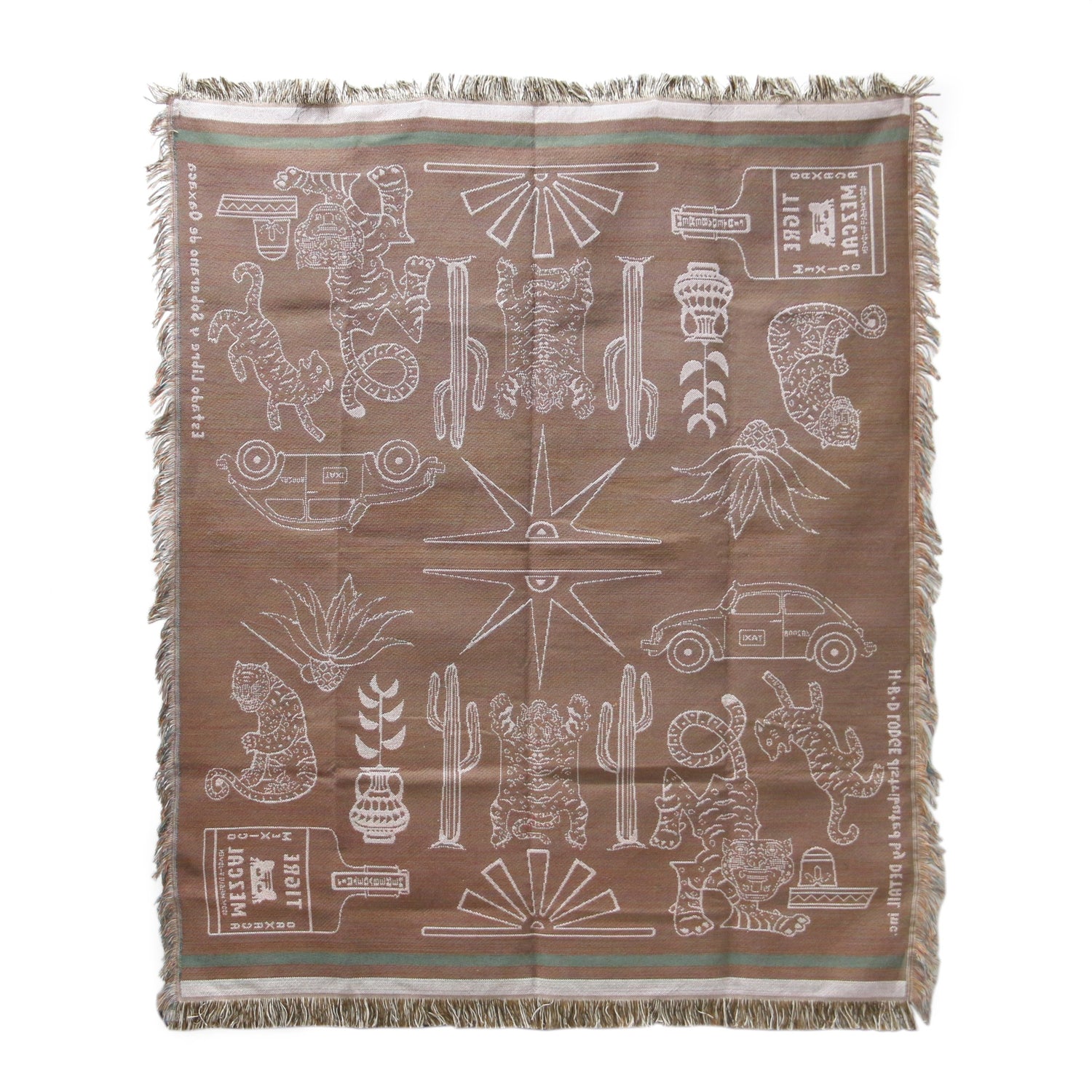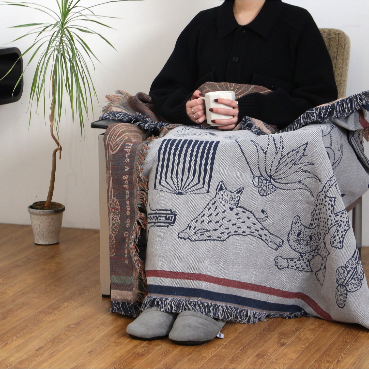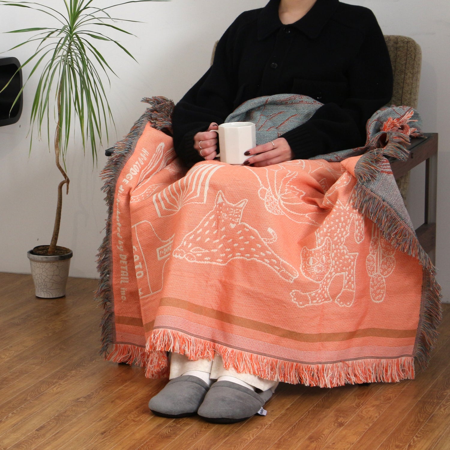 メキシコ原産の蒸留酒である"メスカル"の瓶・タクシー・カクタス・草・木、そしてタイガーor猫。メキシコにまつわるモチーフと緩やかな時間の流れや自由奔放さを、スローケット1枚のなかに表現しました。素材は、ポリエステルの耐久性とコットンの通気性の両方を特性を備えたポリエステルコットン生地。少し厚みがありながらも艶感があり、触り心地の良い通年ご使用いただける生地感です。インテリアに馴染みやすいカラーリングとデザインで、性別を問わず幅広くご使用いただけます。ソファやベッドにさらりと掛けて、肩から羽織れる大判サイズは膝掛けとして、タペストリーのように壁面アートとしてなど、様々なシーンでお部屋を彩ってくれます。