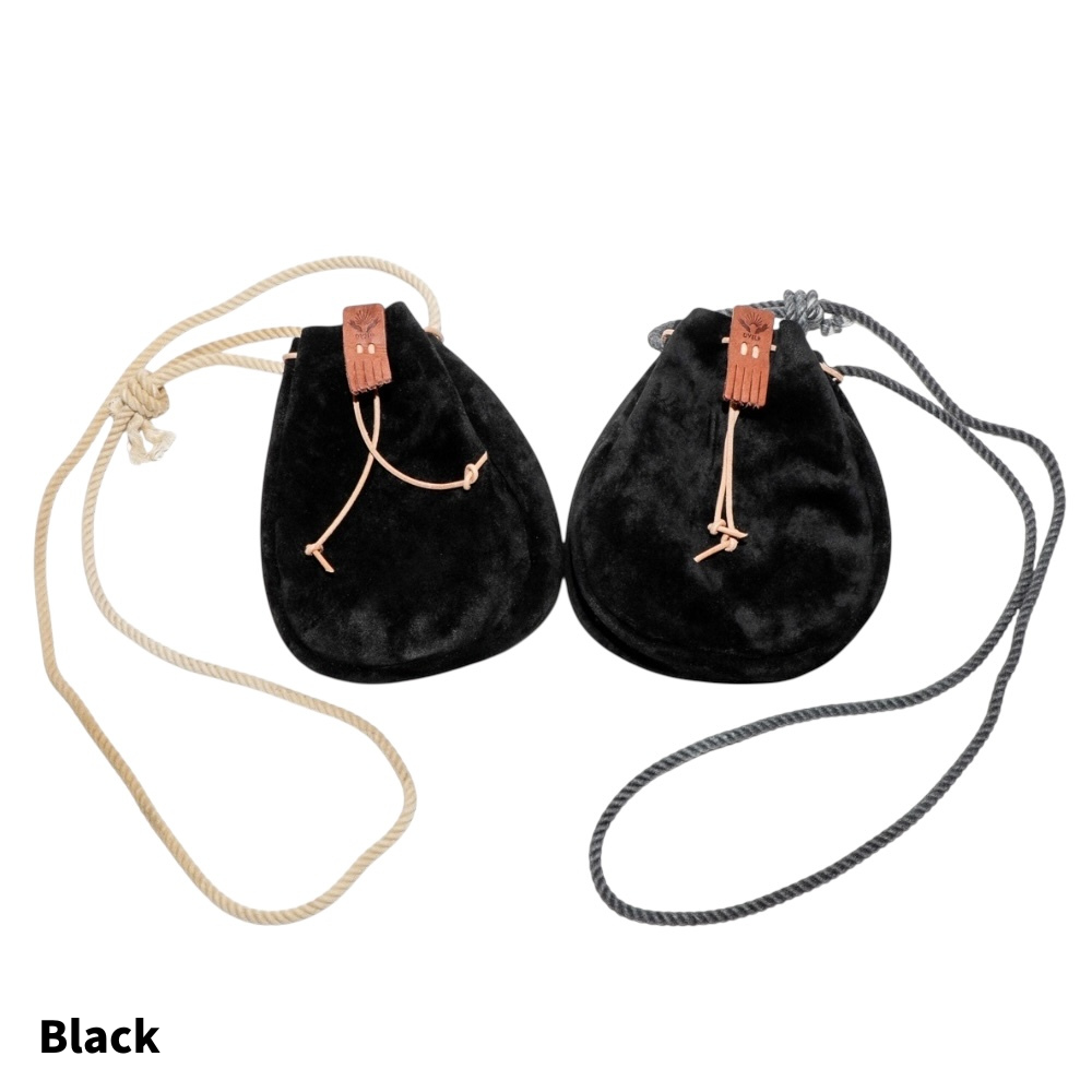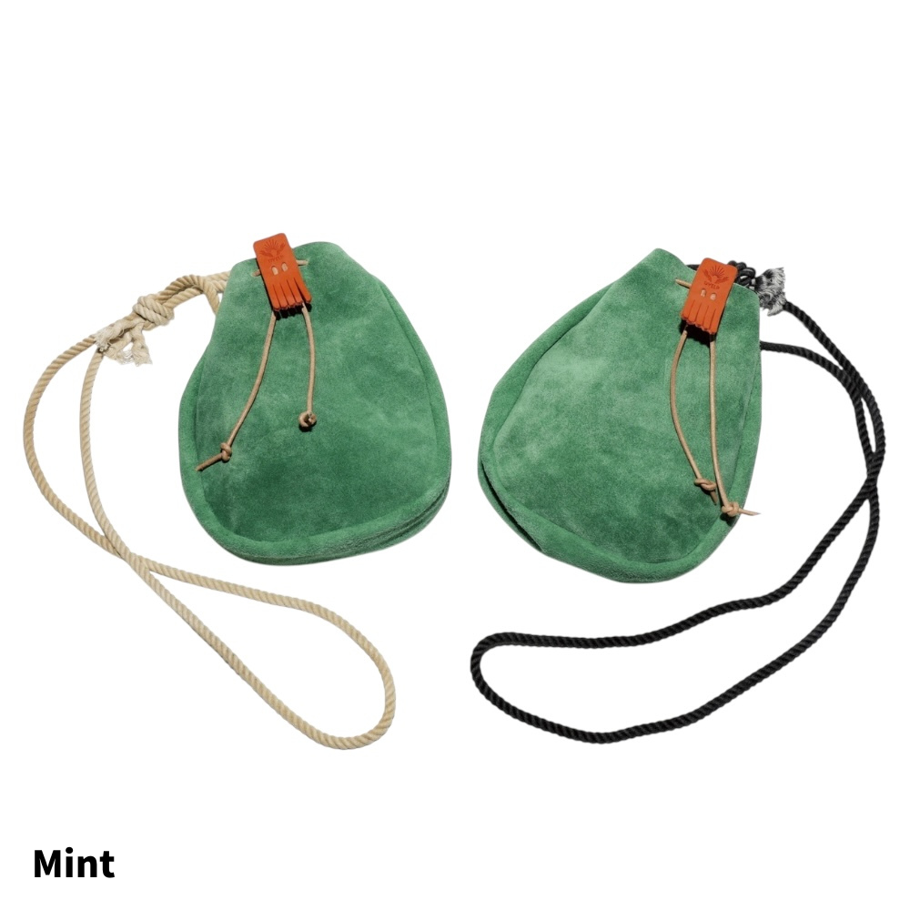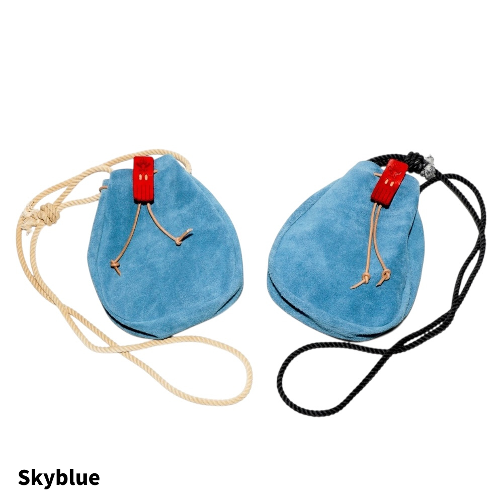 程よい毛羽立ちと発色の良い国産牛スエードを使用した巾着タイプのショルダーバッグ。巾着ひもはヌメ革の丸紐、フリンジになったロゴ刻印入りのストッパーで、開閉が自由に。