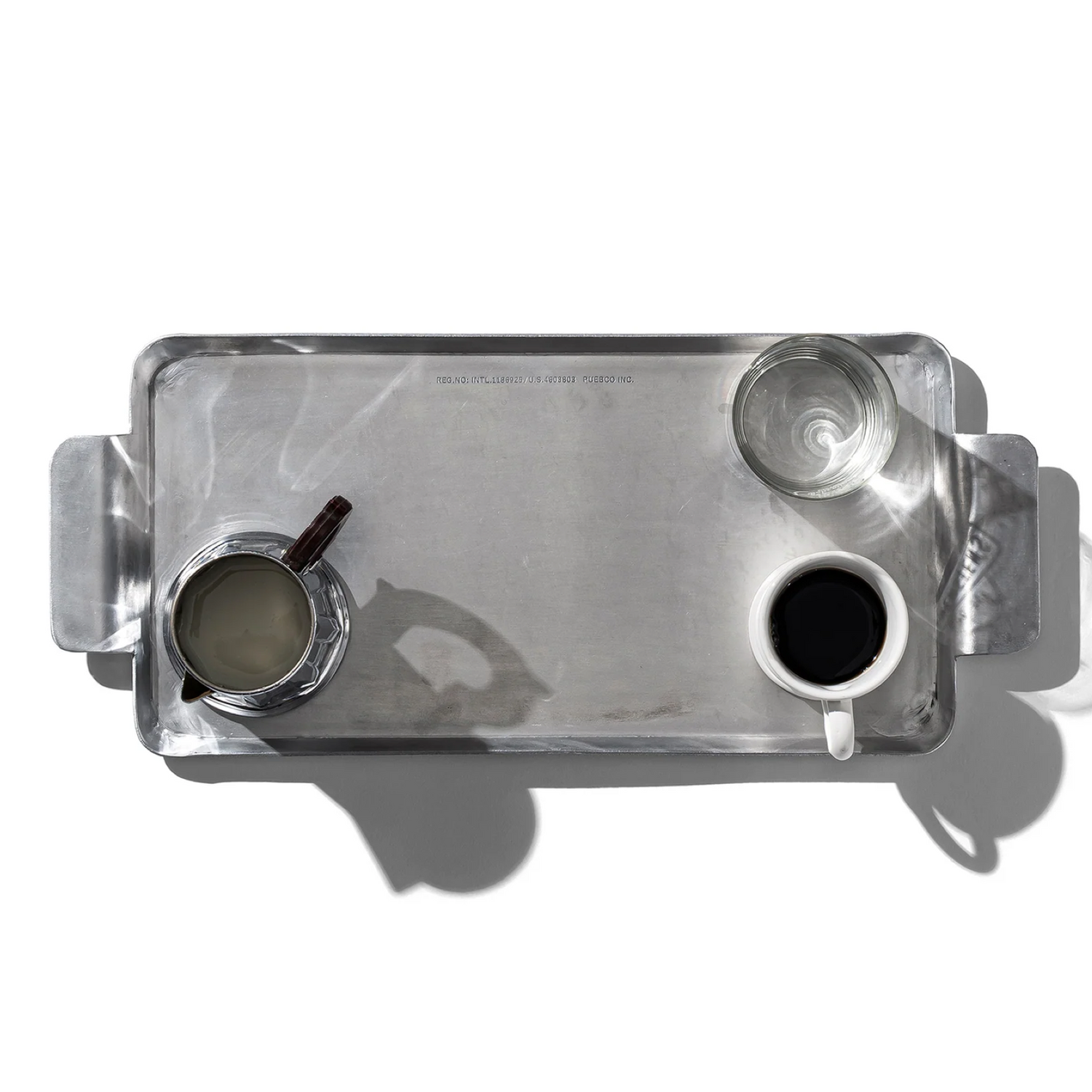 長方形、絶妙のサイズ感、取って部分のフォルム、アルミの無骨な素材感。工業用のパーツみたいな雰囲気。食卓に出すととにかく洒落て見える。素材の性質上の最初からついている傷や変色がめちゃめちゃいい仕事をしてくれてる。朝はコーヒーとトーストを並べて、夜はグラスを並べて晩酌。特別なことをしてるわけじゃないのに、このトレーにのせるだけでちょっといい時間に変わる気がする。(※ご購入前に必ずアイテム説明欄をご確認ください。この風合いも含めてブランドの魅力なので、ご理解いただけない方はご遠慮ください。)