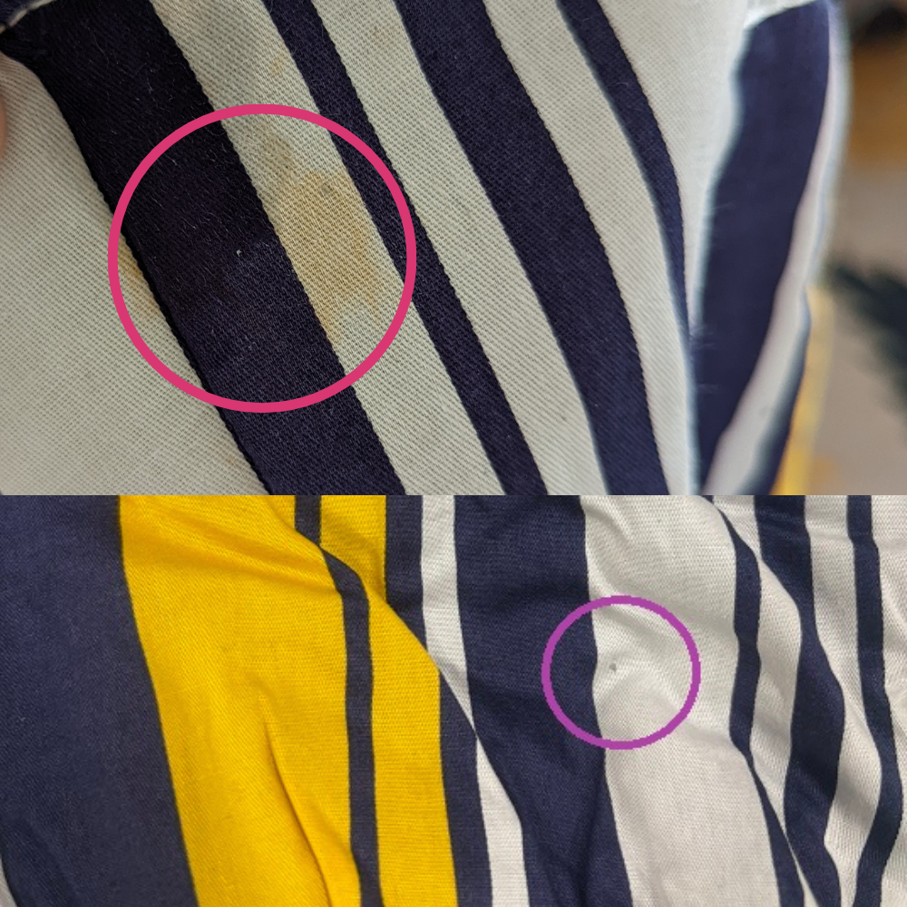 ※ハンドル部分はユーズドのベルトを再利用しているため、汚れや黄ばみなどがあります。本体生地にも汚れや黄ばみシミなどがある場合があります。縫い目が曲がっていることがあります。