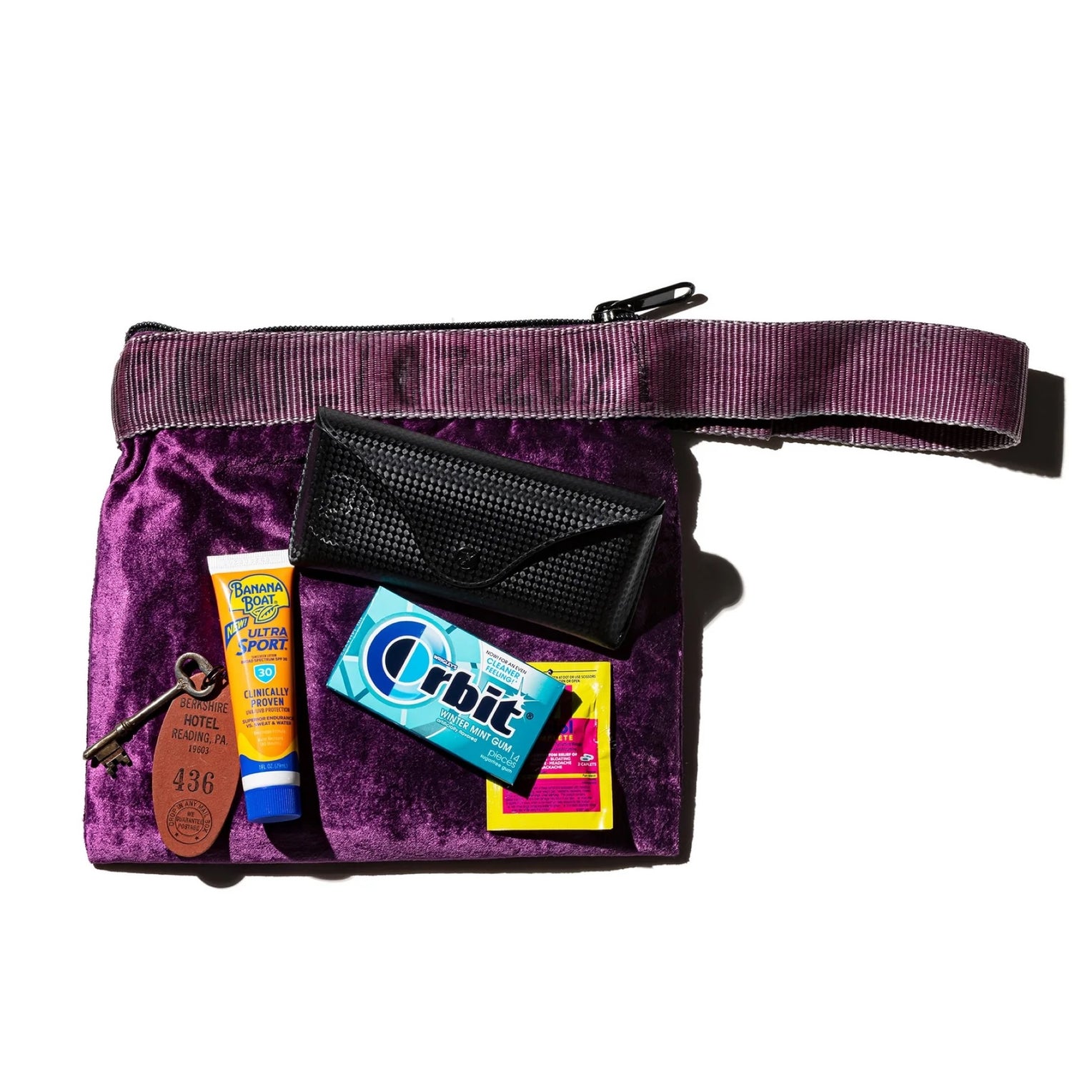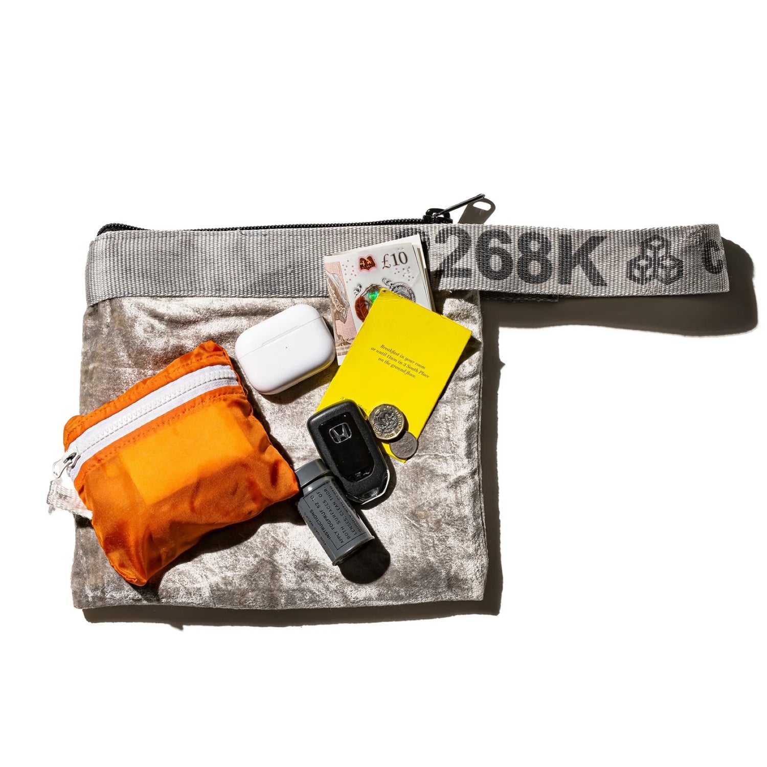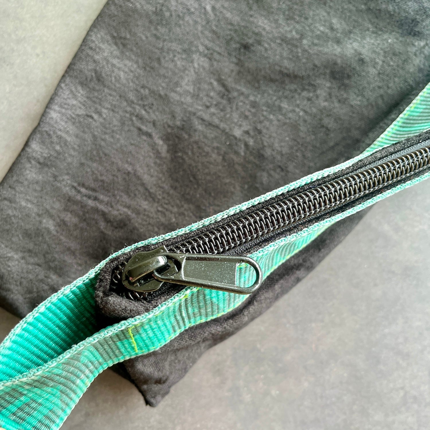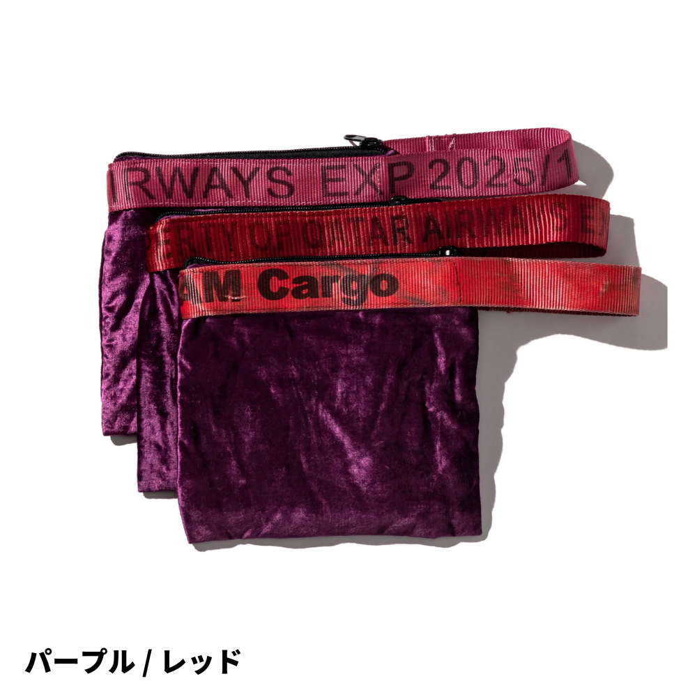 空港で使われていた貨物運搬用の頑丈なスリングベルトを使用したポーチ。内側にポケット付き。
