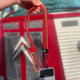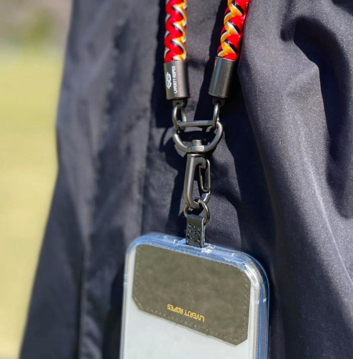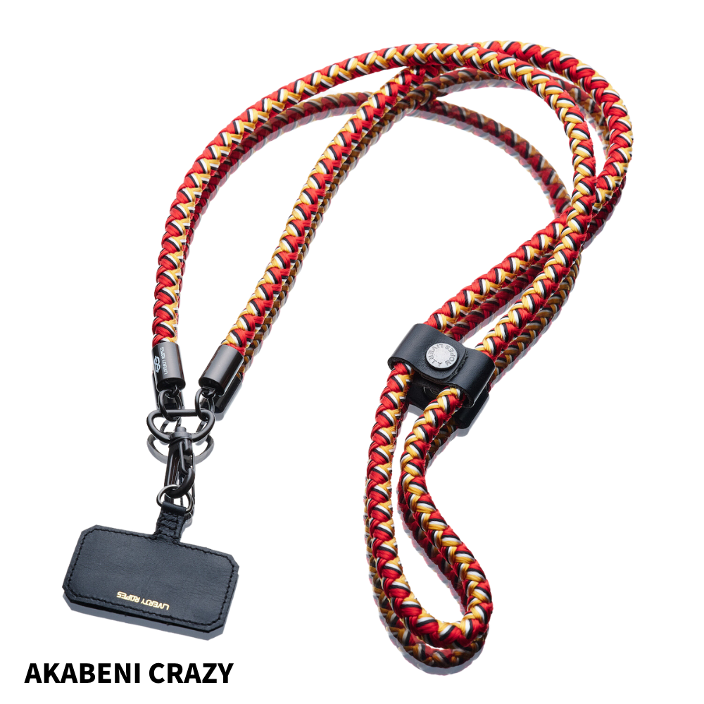 五つの束を編み込む「五連」編みで、美しく高級感のあるスマートフォンストラップです。日本の伝統的なカラーである「赤紅」「藤黄」をベースに兜紐や帯紐と同じ技法で編み、日本的な華やかさ、高級感を表現したアイテムです。