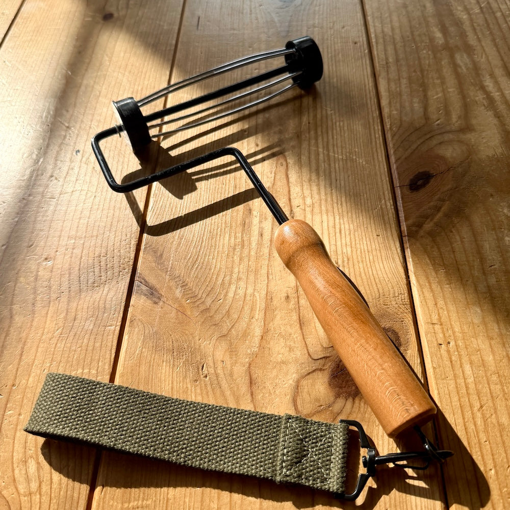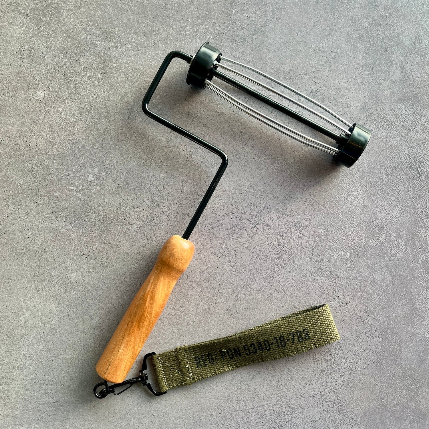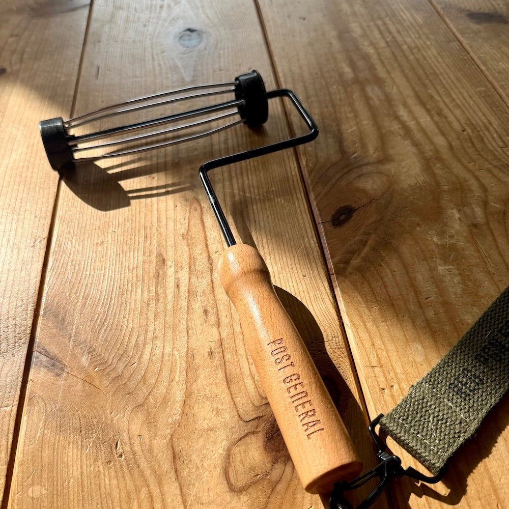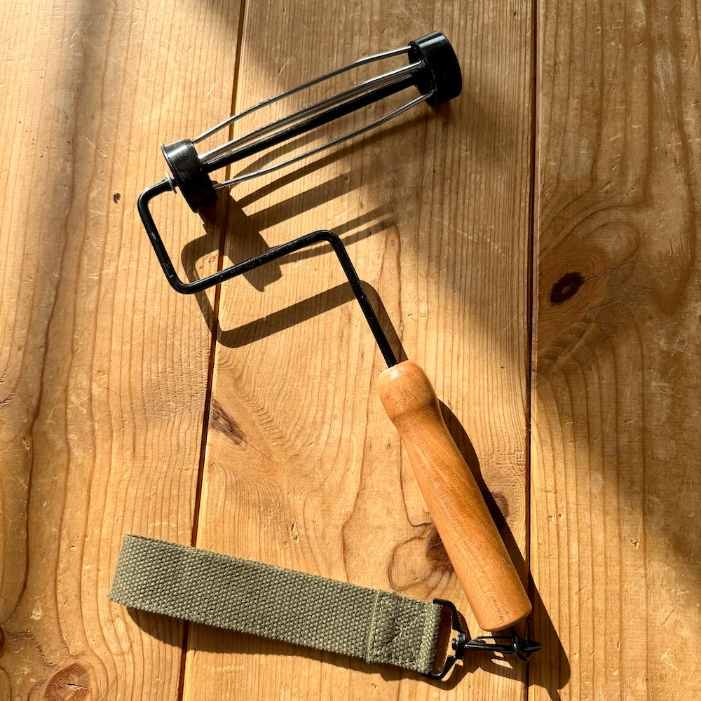 よく使う工具のような道具。そんなコンセプトから生まれたカーペットクリーナーホルダー。木の素材感を活かしたビーチ材の持ち柄に無骨な太めのロッドを組み合わせました。また掃除中に手を通せるストラップもアクセントにデザインしました。粘着テープは市販の幅約160mm、紙菅内径約38mmのものをお使いください。
