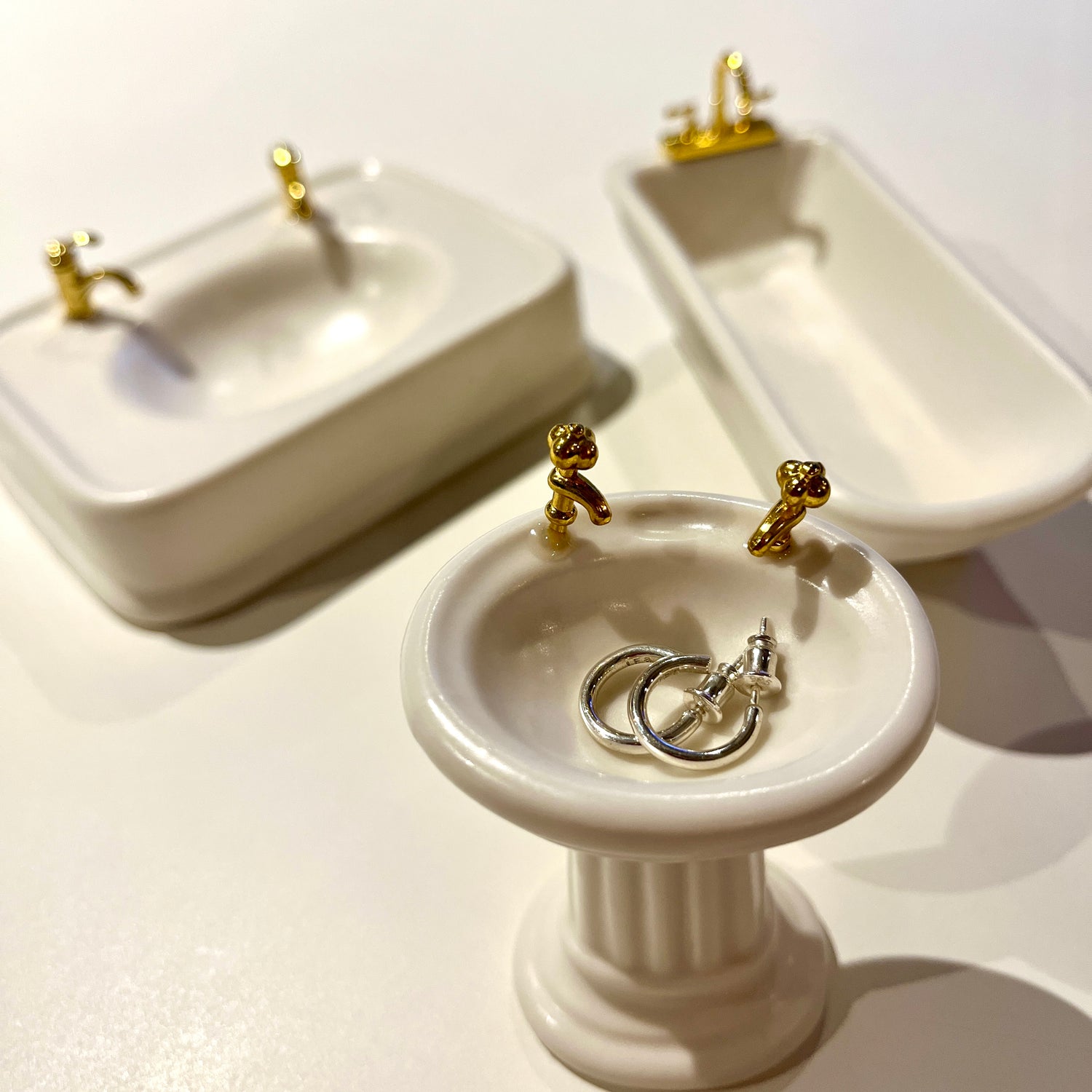 トレイとか小物入れにはめっぽう弱いんですが、気づいたら、これめちゃめちゃじっくり見てた。ミニチュアのバスタブやシンクがそのまま小物入れになってるって発想も最高だし、蛇口や足元のデザインまでディテールがしっかり作り込まれてるのもたまらない。これは3つ揃えるのが絶対正解。僕はBathtubにはカミソリ、Pedestal Sinkには最近買ってお気に入りのIF8のピアス、Sinkにはまだ何を入れるか決まってません。あえて空にしておくのも、なんかいいかも。何を置いてもとにかく可愛く見えちゃうし、想像以上に“絵になる”やつです。友達が遊びに来て、洗面所にこれが置いてあったら、絶対モテると思う。