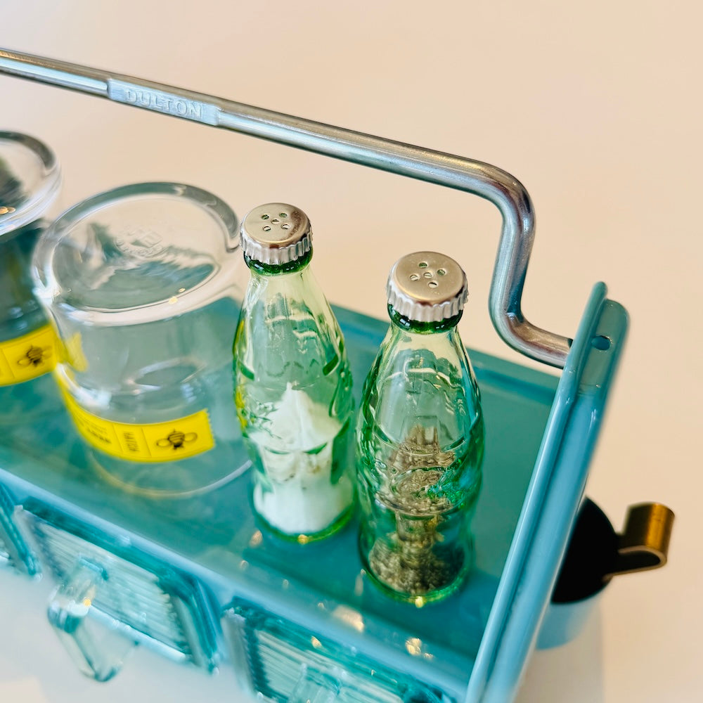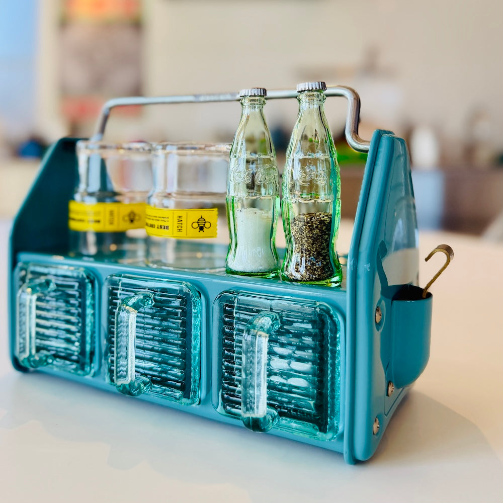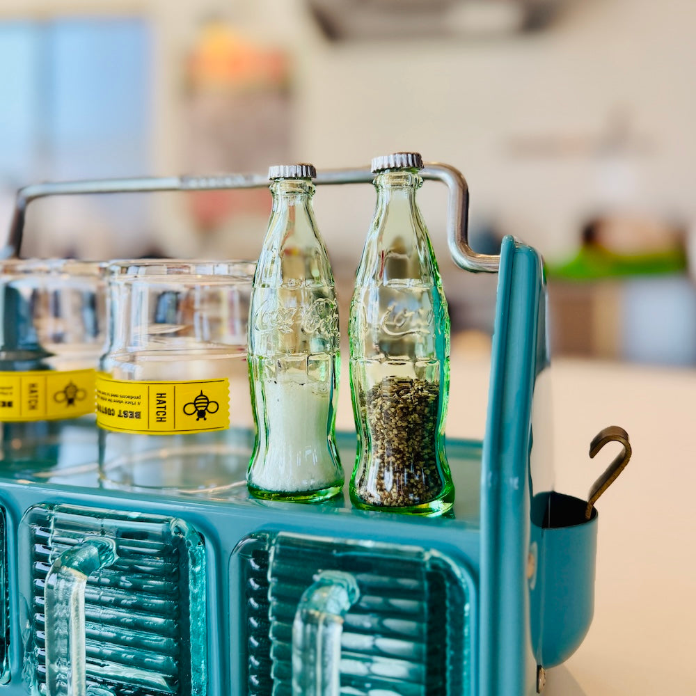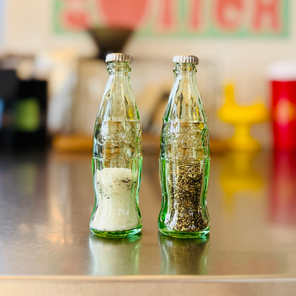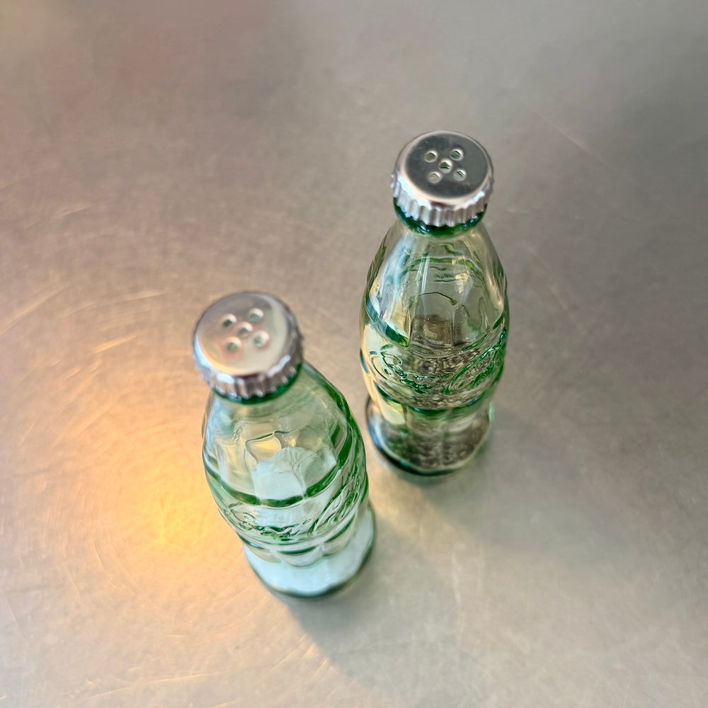 COCA COLAの瓶がそのまま小さく、 SALT & PEPPERを入れる容器になりました。蓋部分を開けて塩・コショウなど粉末状の調味料を入れられます。