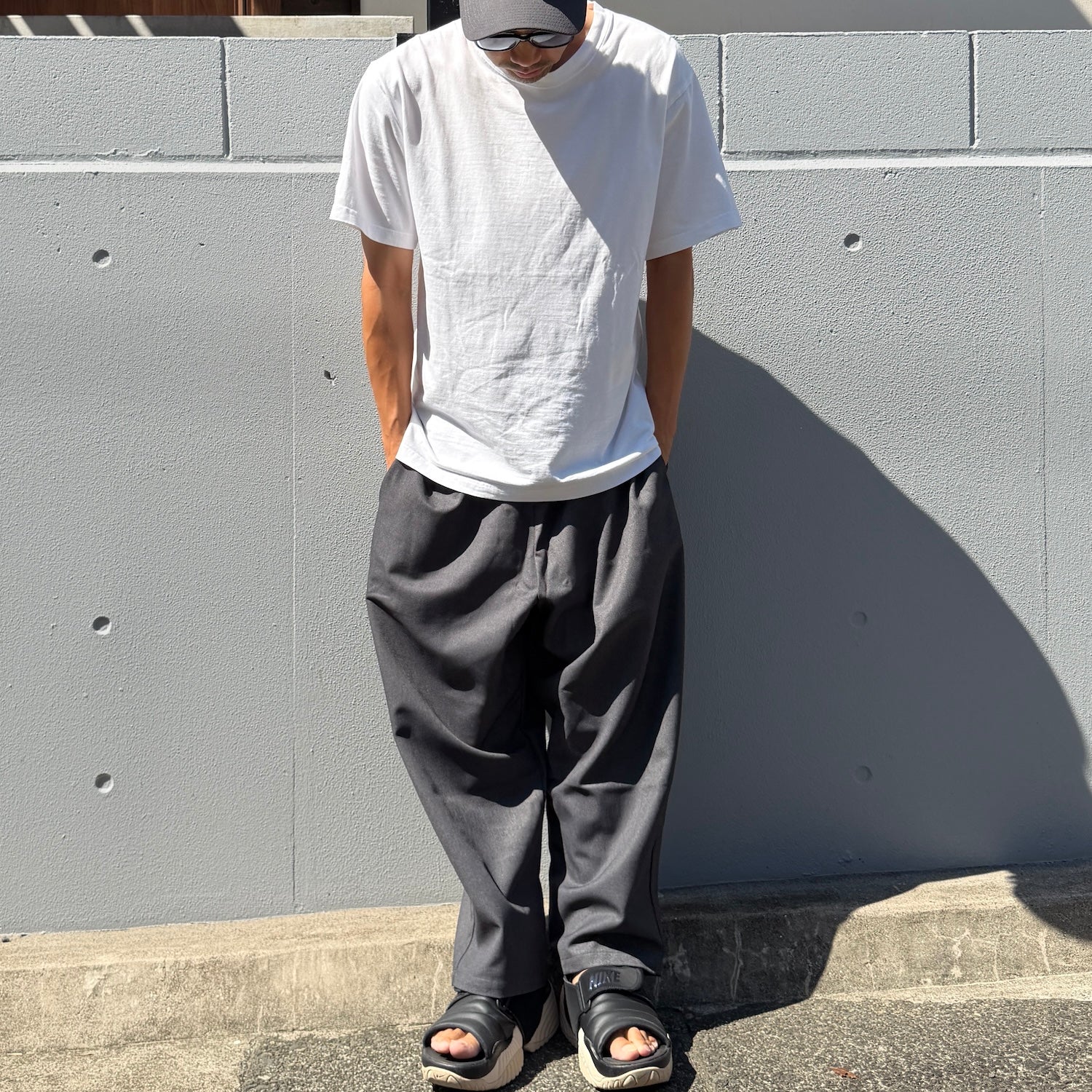 シルエット最高、履き心地抜群で、真夏以外は毎日履いている”やみつきパンツ"。おかげさまでメーカー在庫も無くなってしまい再販がいつになるかわからず……であればHATCH別注作ってしまえ!ということで作っちゃいました。素材は、とろみがあってシワ感の少ないきれいめなポリエステル×レーヨン。色は、どんなカラーとも合わせやすく、ラフに着てもなぜか上品な雰囲気が出るチャコールグレイ。右前にDカンを付けたので、鍵をじゃらじゃらさせるのも良いでしょう。ゆったりとしたリラックス感のあるフォルムが最高で、だらしなく見えることはなく、程よく力の抜けたバランスに仕上がります。履き心地はどれだけ説明しても実際に試してもらわないとわからないのですが……マジで良い!じゃなければ別注しません!着用画像は僕で、171cm・59kgです。身長176cmの友人も履いてくれてますが、シルエットバッチリでした