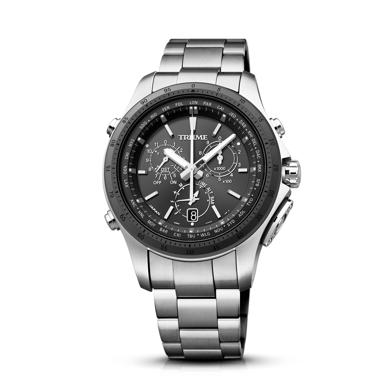 ステンレスケースに、ブラックのダイアルのツートーンの多機能だが都市で役立つ機能を満載した、素のTRUME。光充電、GPSセンサー、10気圧防水、サファイヤグラスなど満載。