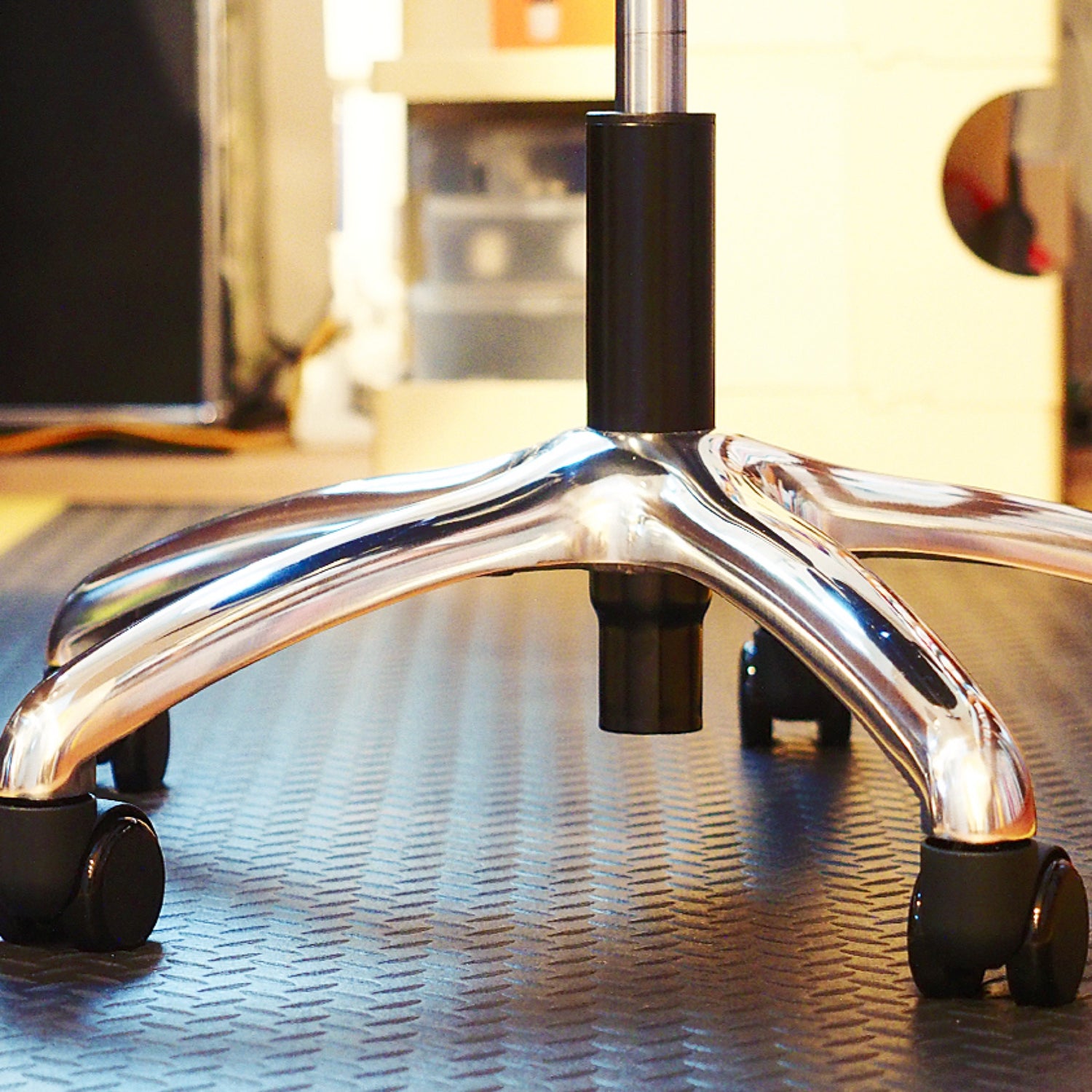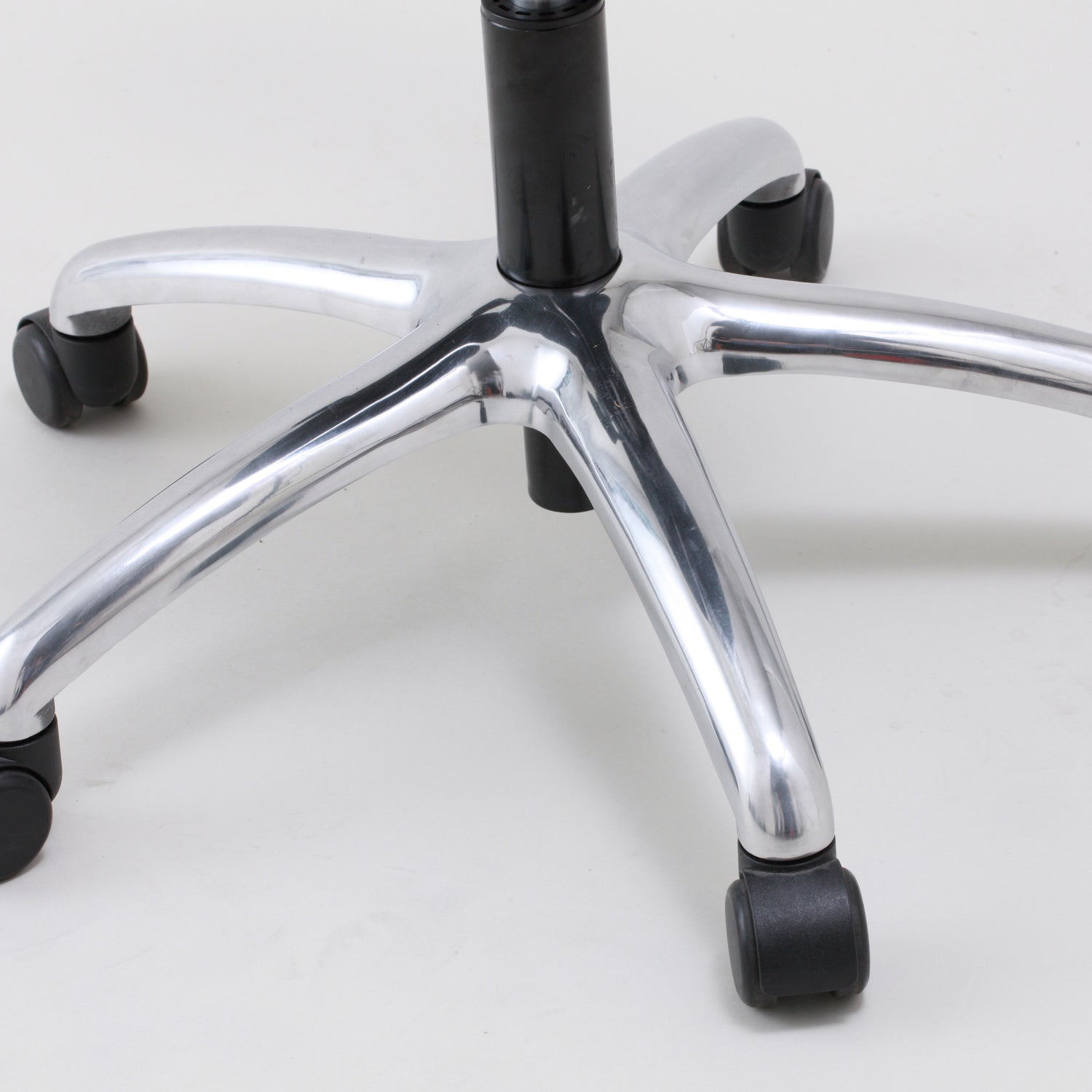 素材 | 【座面・腰あて部】表皮一体成形発泡ウレタン、【背座支持金物】鋼板プレス加工品、【支柱】※鋼管加工品・プラスチック成形品 ロック付きガススプリング、【脚部】アルミダイキャスト、ウレタンキャスター付き |