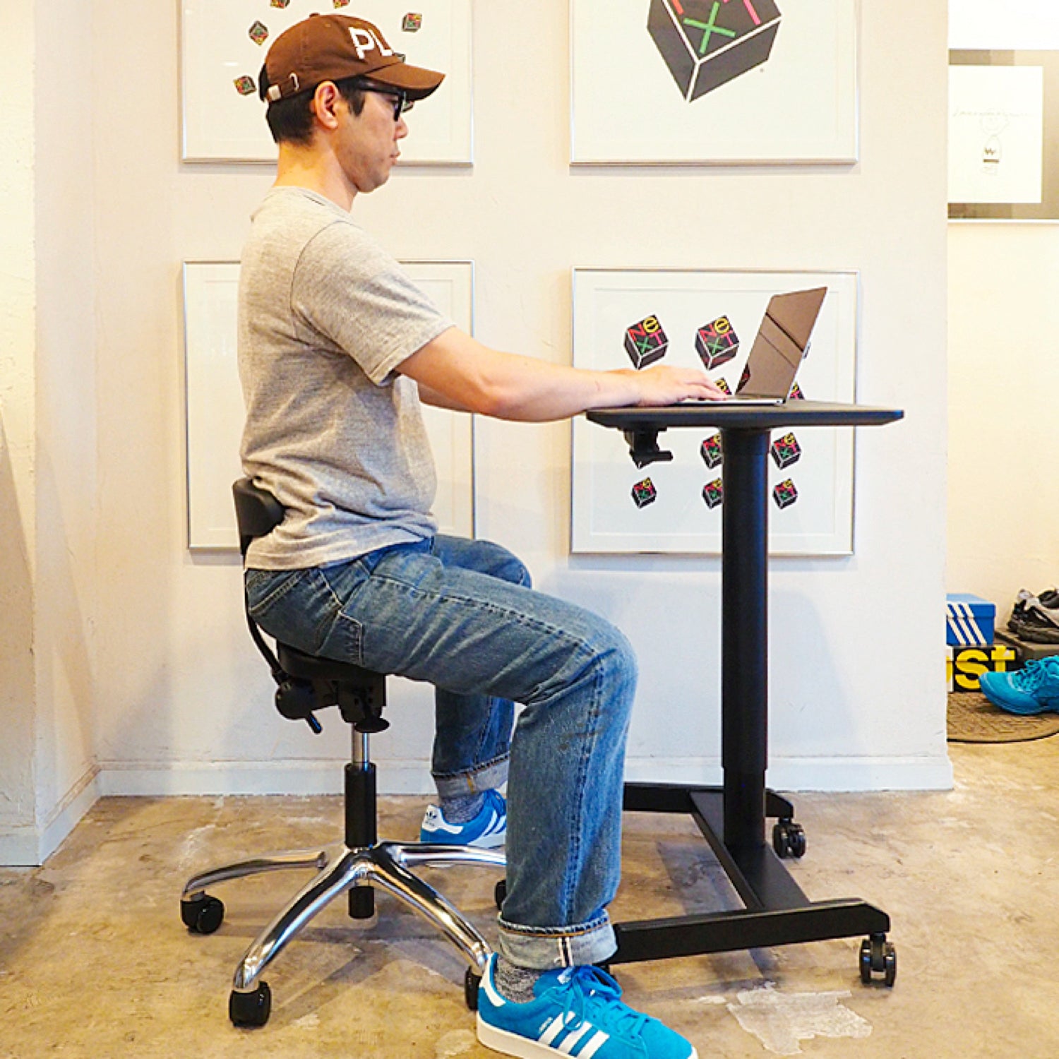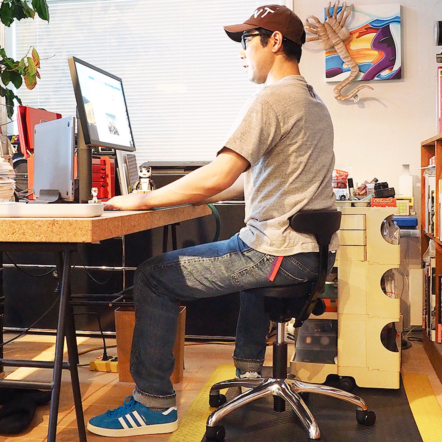 アドバイスをしておくと、まずこの椅子は、くつろぐためのふかふかしたリラックスチェアではないということ。姿勢を正すためのトレーニングツールであると考えるほうがいい。少し硬めの座面に慣れるまでに個人差はあると思うが、僕で半月ほど掛かった。最初の一週間くらいは座って30分もするとお尻が痛いと感じて、その都度立ち上がった。これは逆に集中する時間の休憩サイクルを作る良いきっかけとなった。自転車に乗り慣れない人が久しぶりにサドルにまたがると痛いと感じるように、乗り慣れることが必要。ただそれを過ぎると、正しい姿勢の気持ちよさが体感できる。