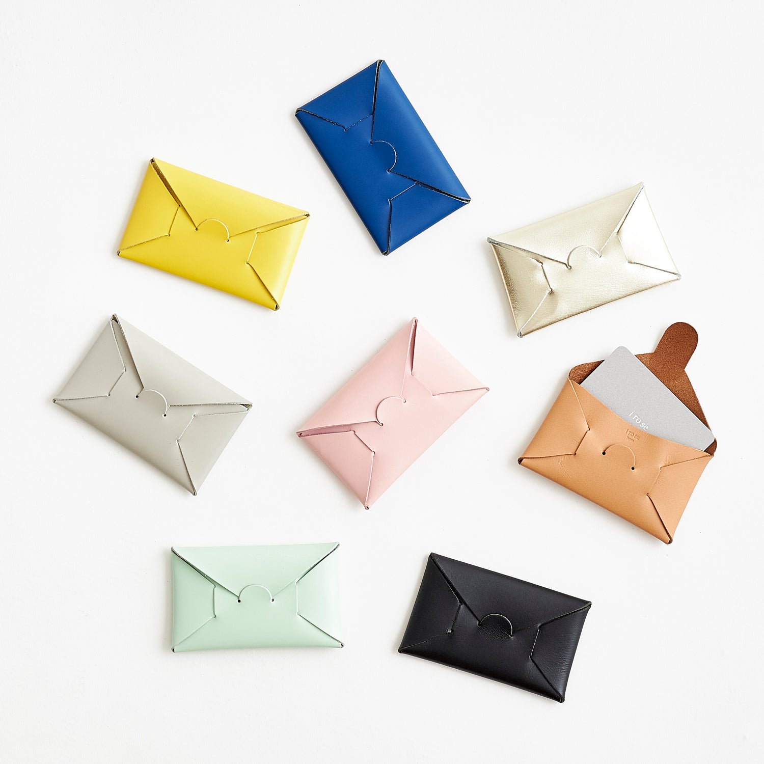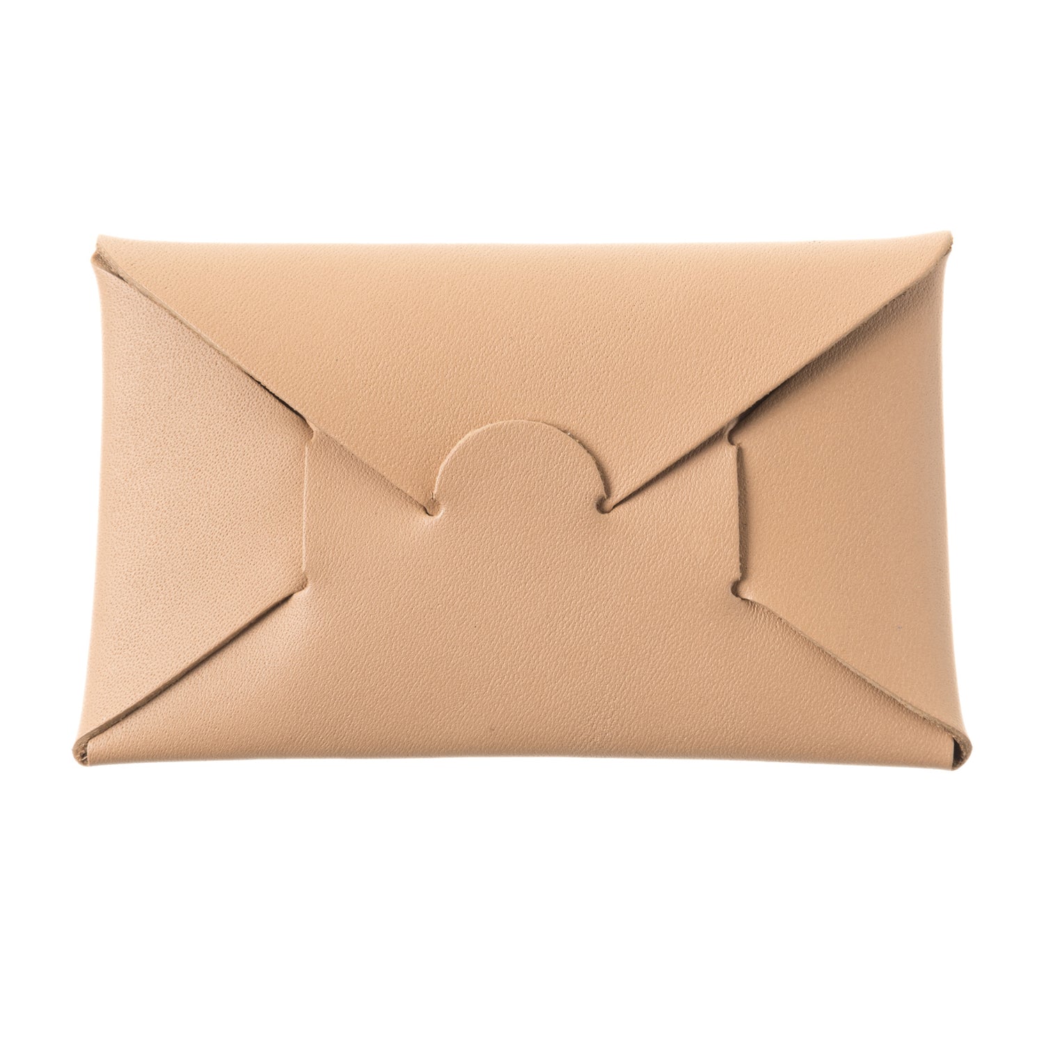 一枚の革を折り込んで組み立てたシンプルなカードケース。革でありながら、ポケットに入れても邪魔にならない薄さと軽さが魅力。クレジットカードなら約10枚、名刺なら20枚ぼど収納が可能です。ライトグレーの紙箱入り。
