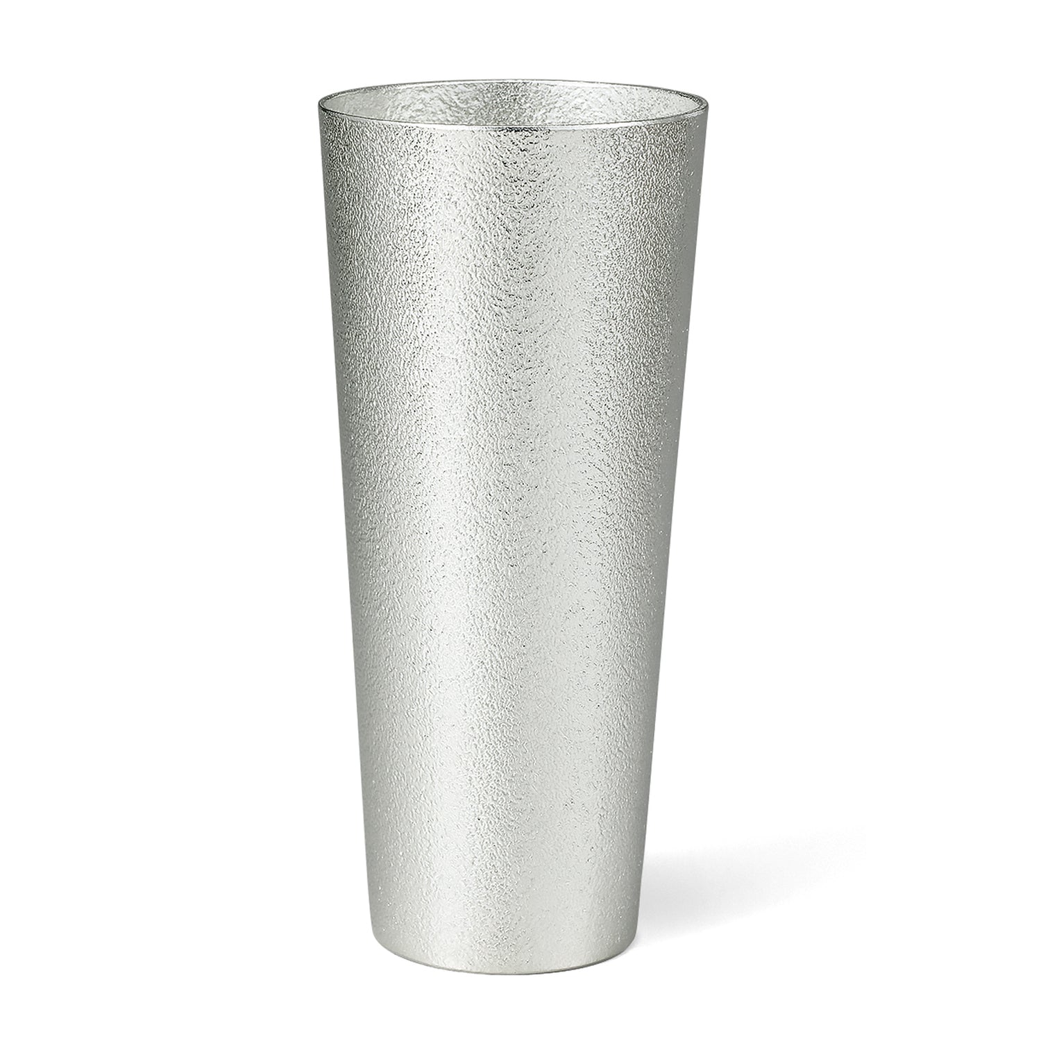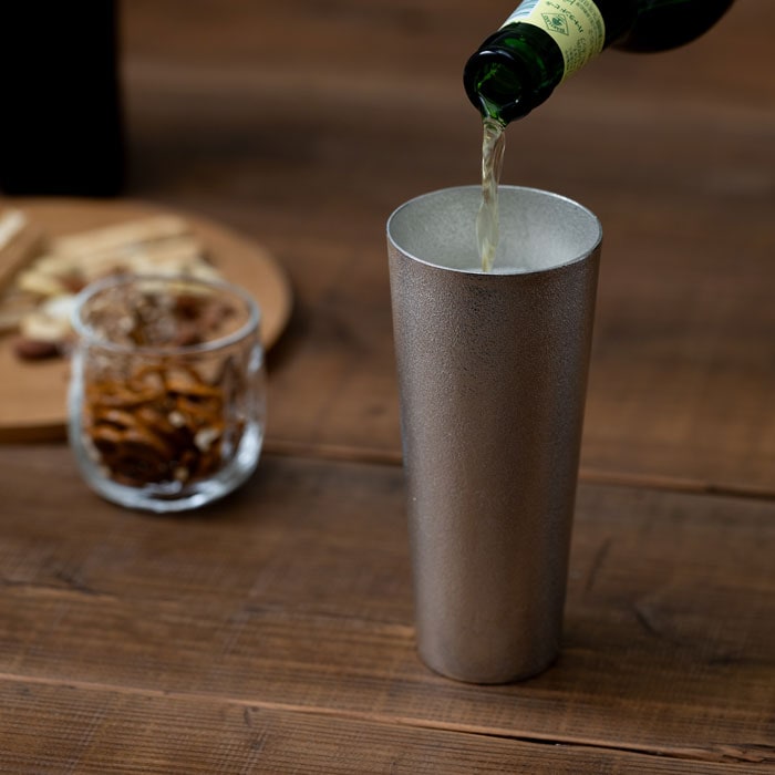缶ビール1本がちょうど入る(満水容量 435cc)大きめサイズの錫100%ビアカップ。鋳物であるこのビアカップは、鋳込む際にできる梨地調の少しザラザラとした鋳肌により、ビールのクリーミーな泡立ちを作り出します。また、熱伝導率がよいので、器を冷蔵庫に1,2分入れるとキンキンに冷えて、ビールだけでなくアイスコーヒーやソフトドリンクなどいろいろな飲み物をお楽しみいただけますよ。通常の錫製品は硬度を持たせるため他の金属を加えますが、何も加えず、錫本来の持ち味を最大限に生かしました。