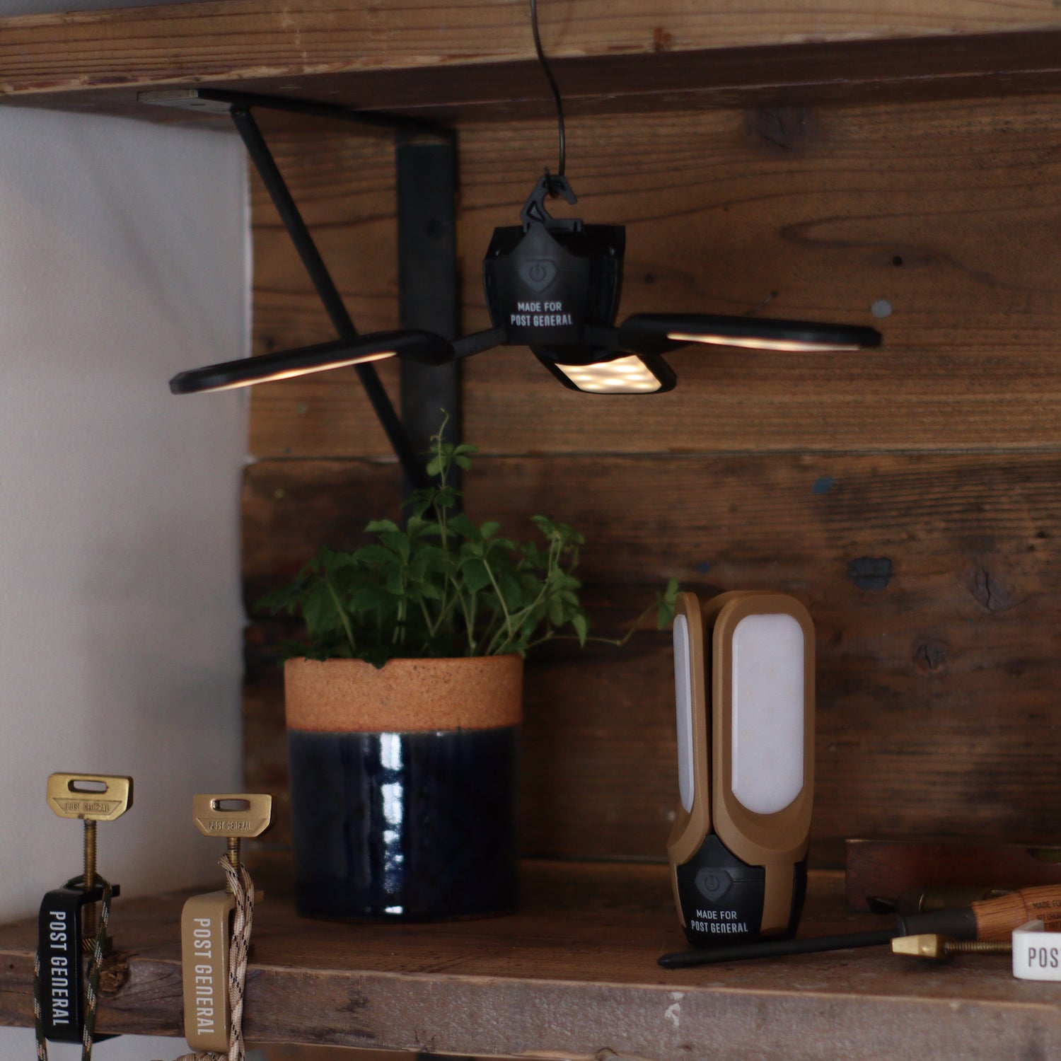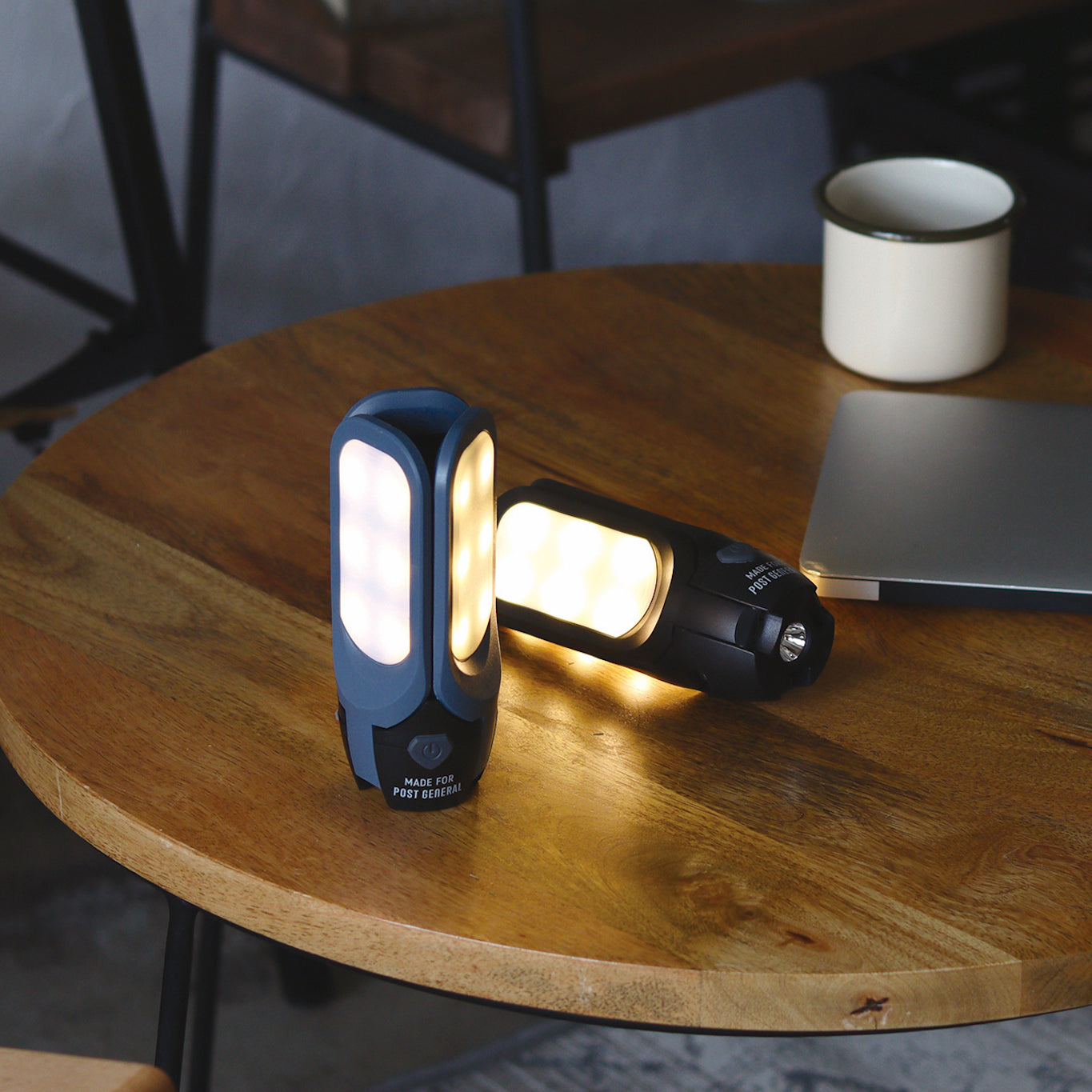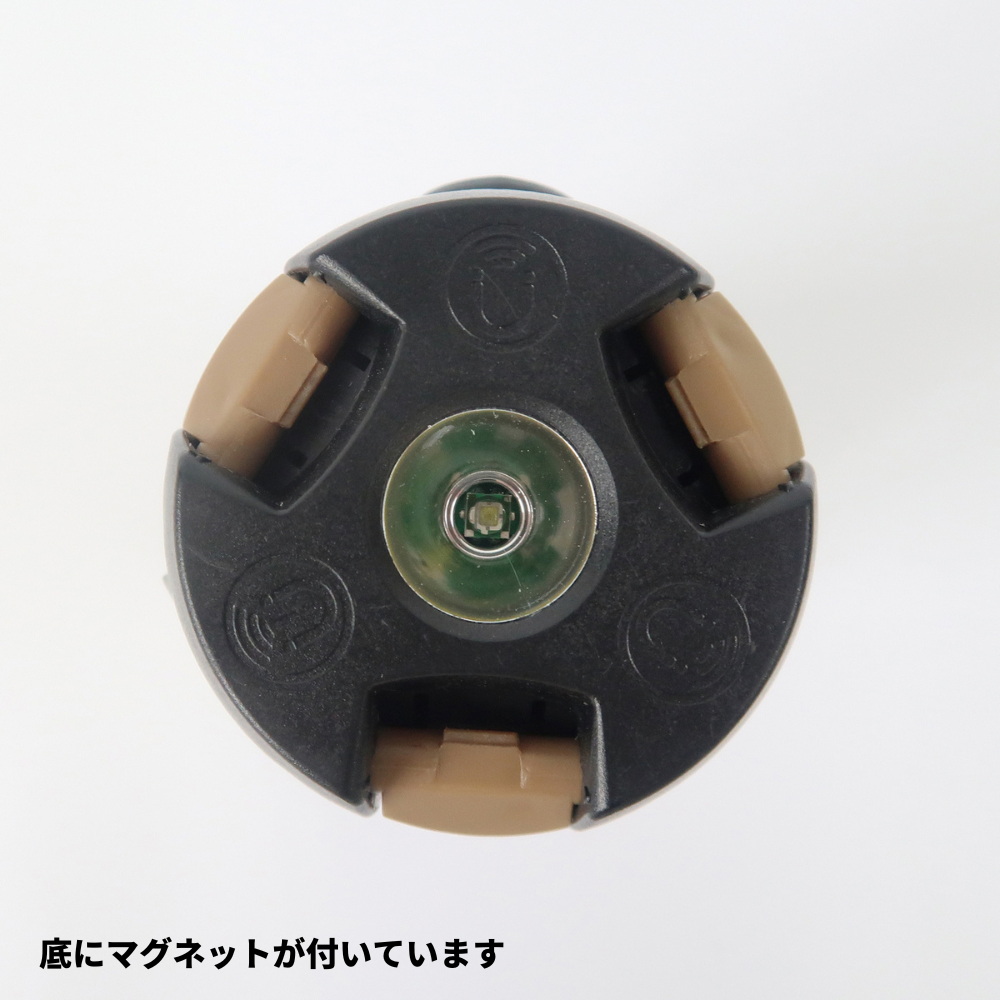 底面のセンターライトは手に持ち、懐中電灯としてお使い頂けます。マグネット内蔵のため、壁や車の側面に取り付けて使用することができます。USBケーブル付属。