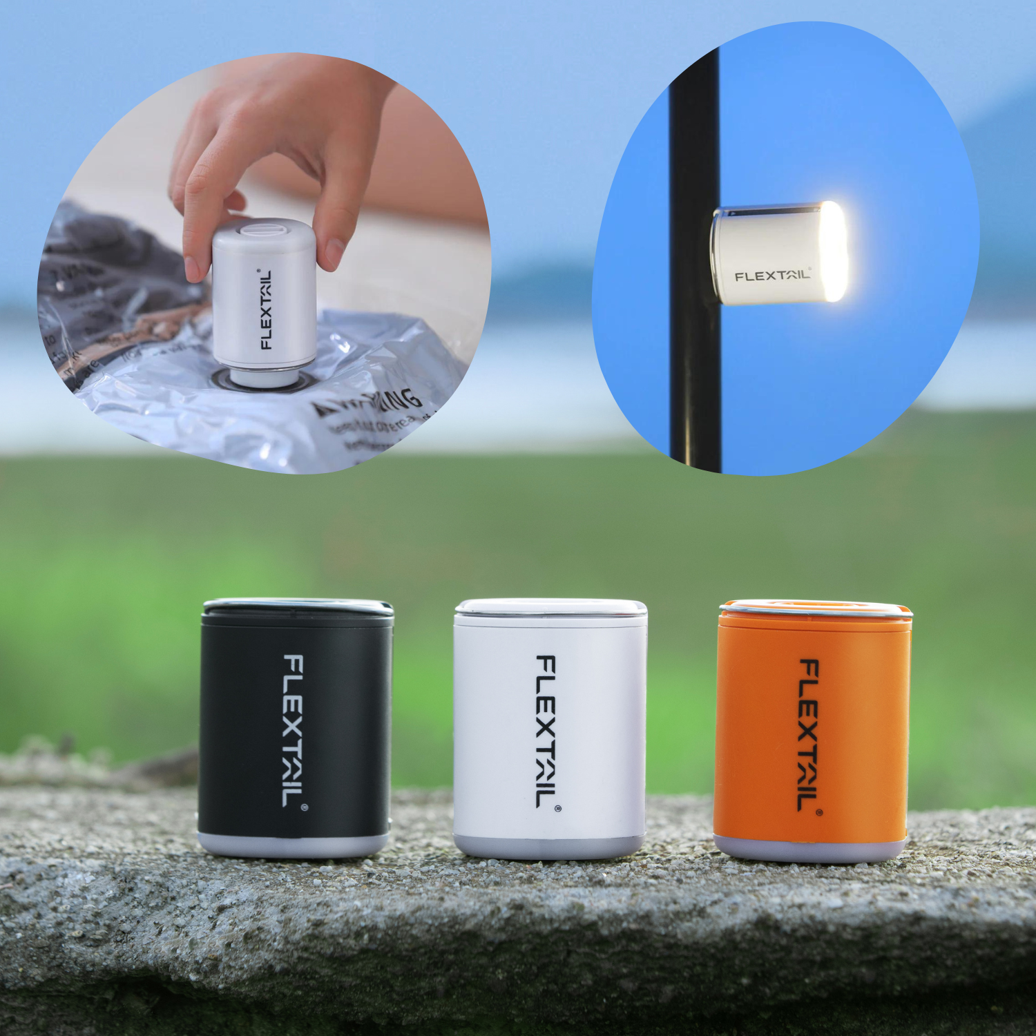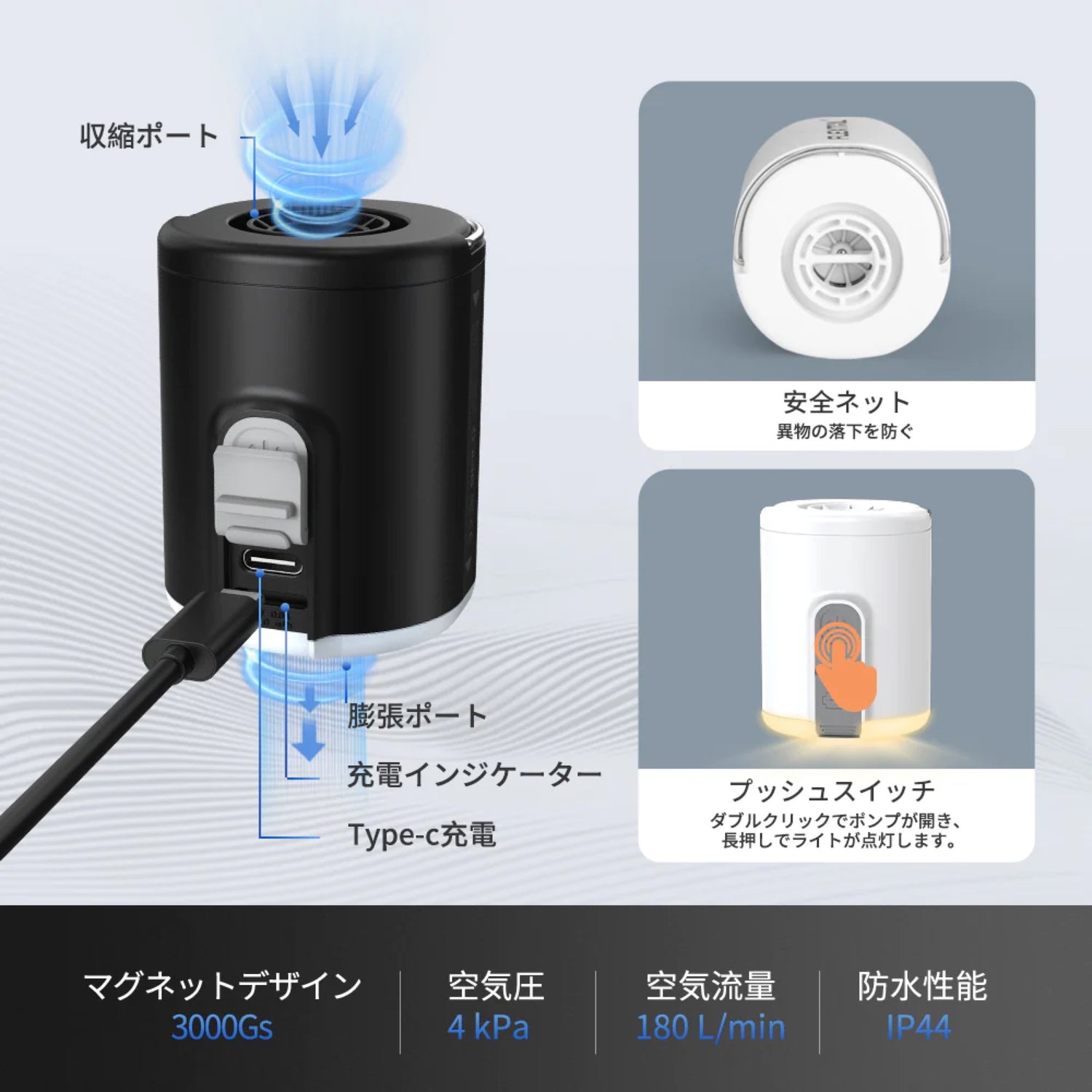 レジャーシーズンで何かと必要になる空気入れですが、このアイテムは、電動であることはもちろん、超極小・超軽量、電源不要で持ち運びが容易でとても便利。さらにこちらが優れているのは空気抜き機能付き。この空気抜きがまた重要で、大きい浮き輪などは空気を抜いて折り畳むのも大変。個人的に一番使えると思うのがキャンプで使うエアーマットの空気抜き。撤収時に地味に面倒で、何気に力も使う嫌な作業を簡略化できます。5つのアタッチメントノズル付きで、大体のものに対応可能。ライト機能はおまけだけど実際はかなり便利。