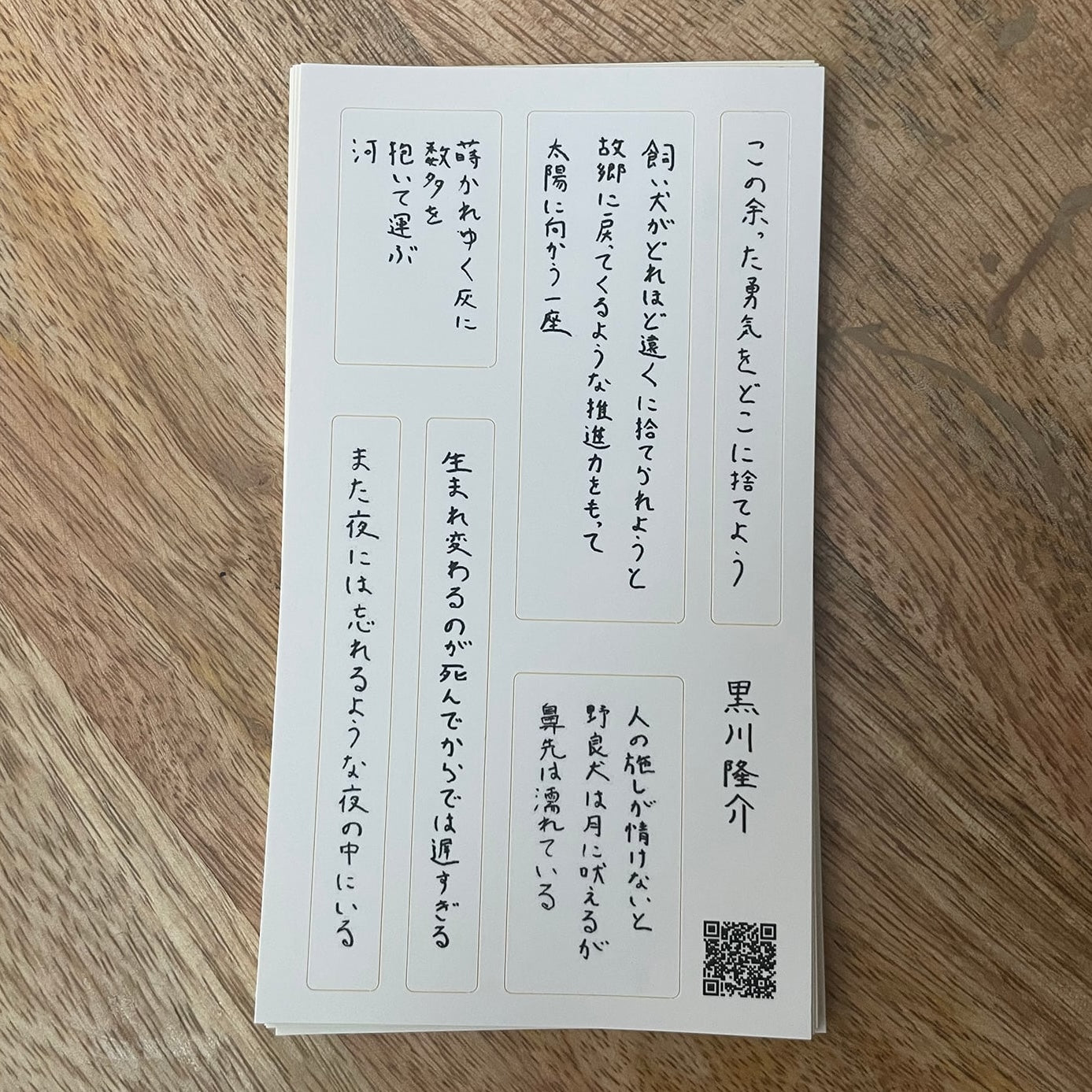 黒川隆介の詩集「この余った勇気をどこに捨てよう」出版記念の詩シール、サイズはiphoneに貼ってちょうどいい具合い。