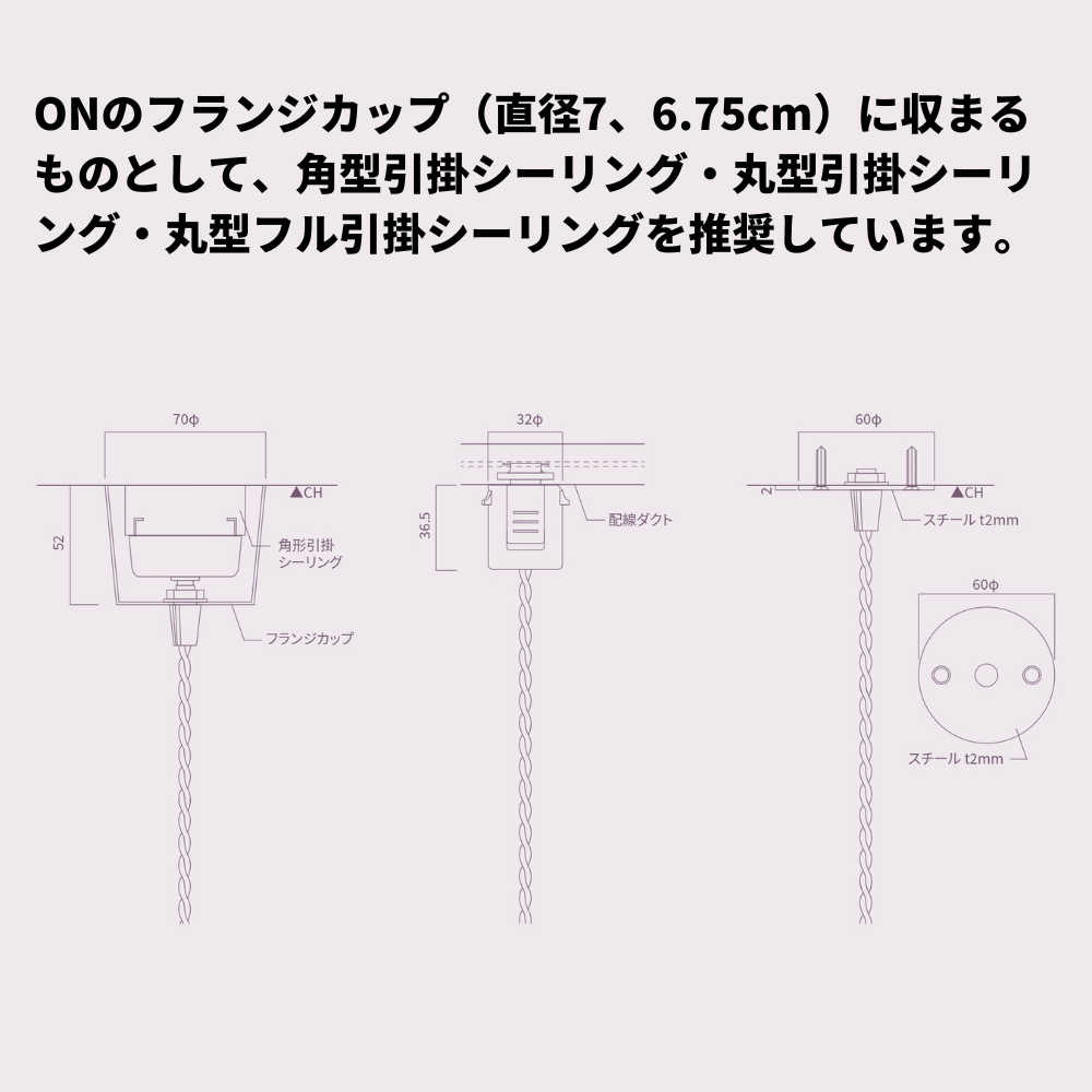 配線器具が設置されていない場合は取付けできません。エ事店に記線器具の取替え、取付けを依頼してください。ON のフランジカップ(直径 70mm内寸67.5mm)に収まるもの として、角型引掛シーリング・丸型引掛シーリング・丸型フル引掛シーリングを推奨しています。※パナソニック製品にて使証