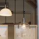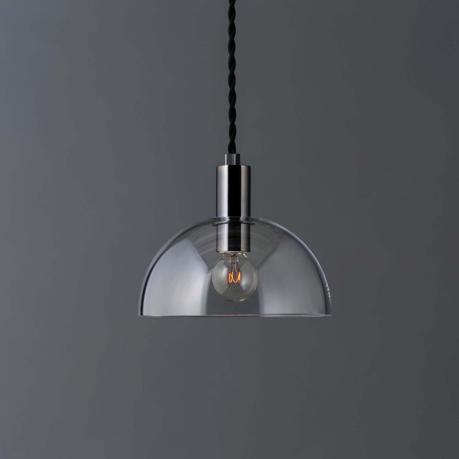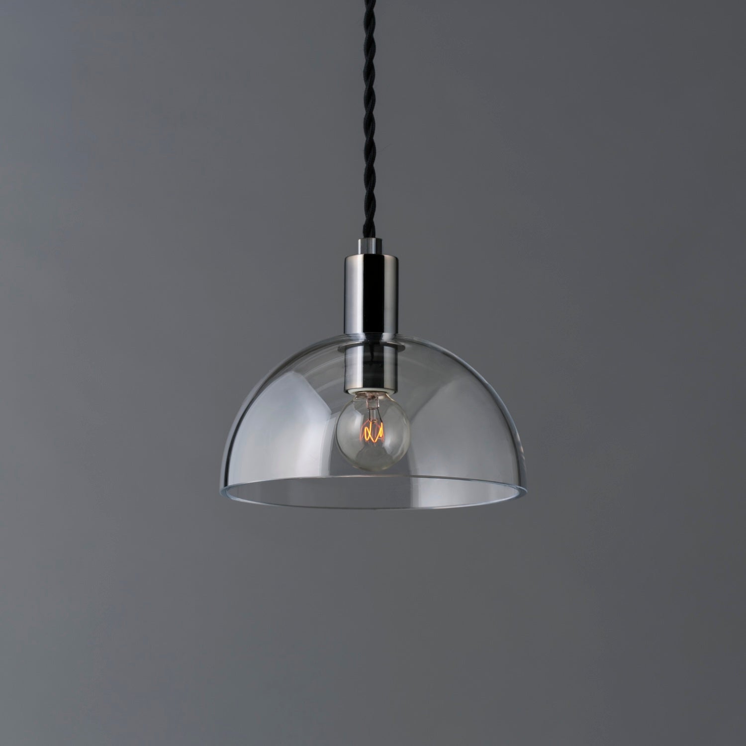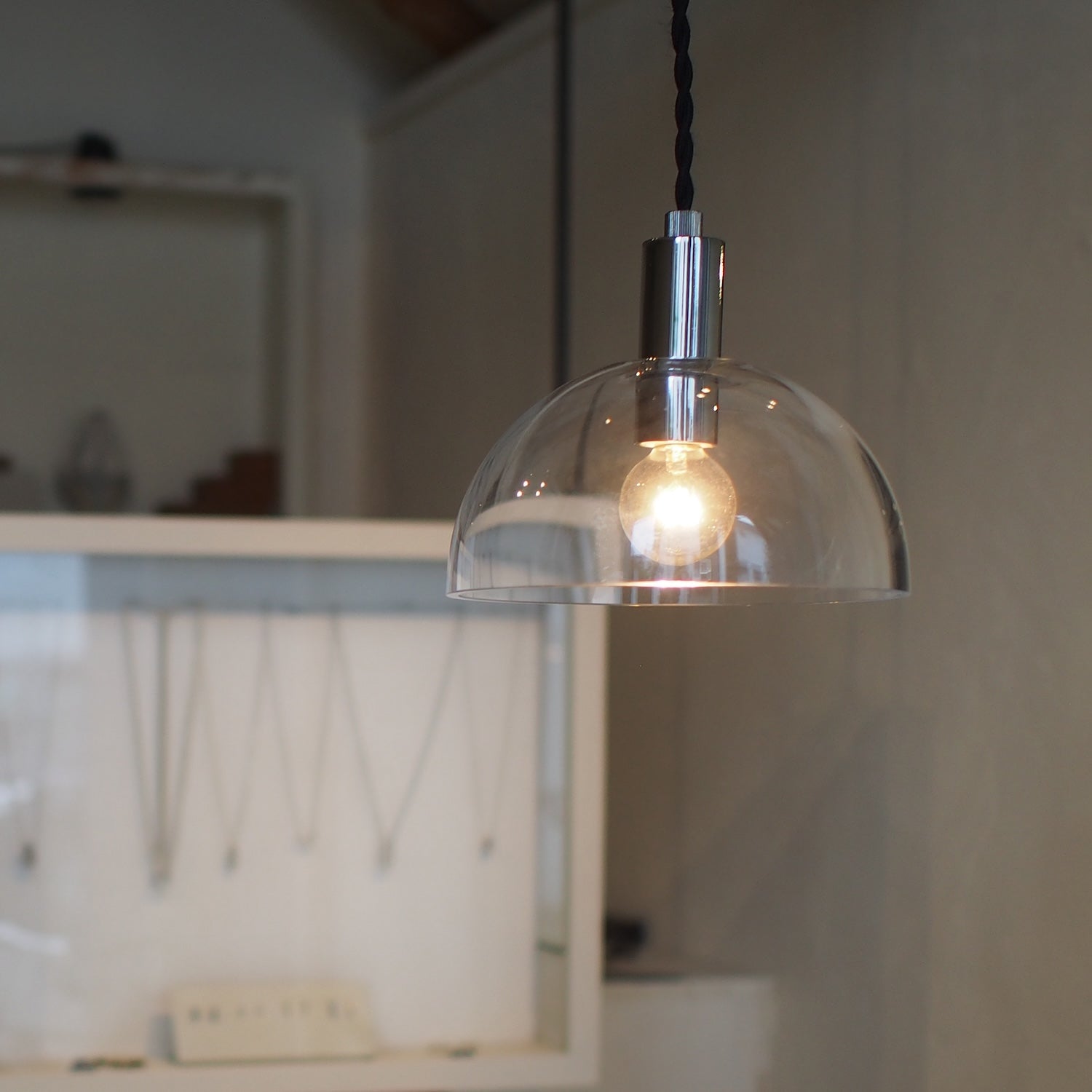 金型の中で膨らませることで成形する「型吹き」で造られるお椀型のガラスシェードの照明です。シャープなラインと幾何学的なフォルムがモダンな印象をつくり、人が吹くことで生まれる微妙な表情が、温かみを感じさせます。露出された電球と透明のガラスの組み合わせは厚みや反射などの個体差を露わにし、それぞれの表情を楽しめます。