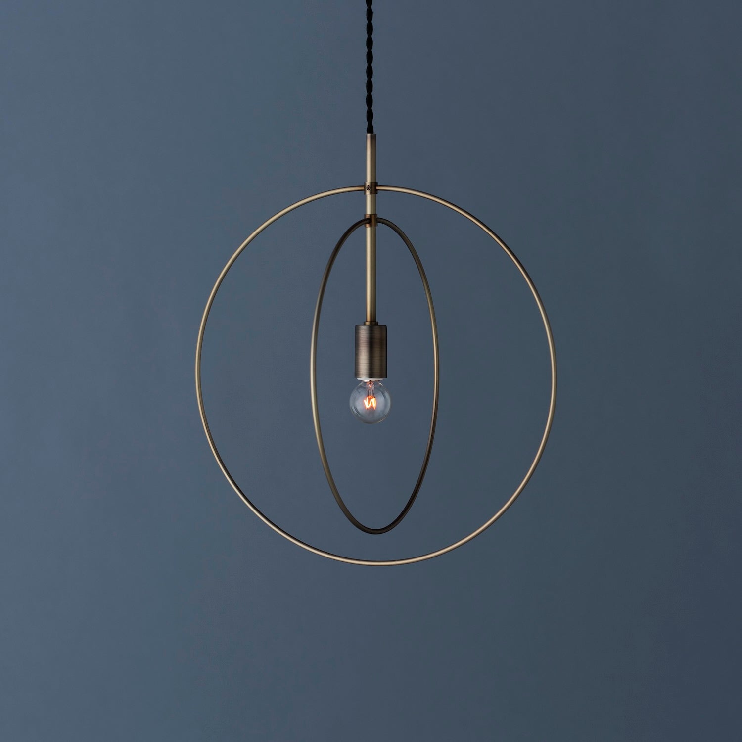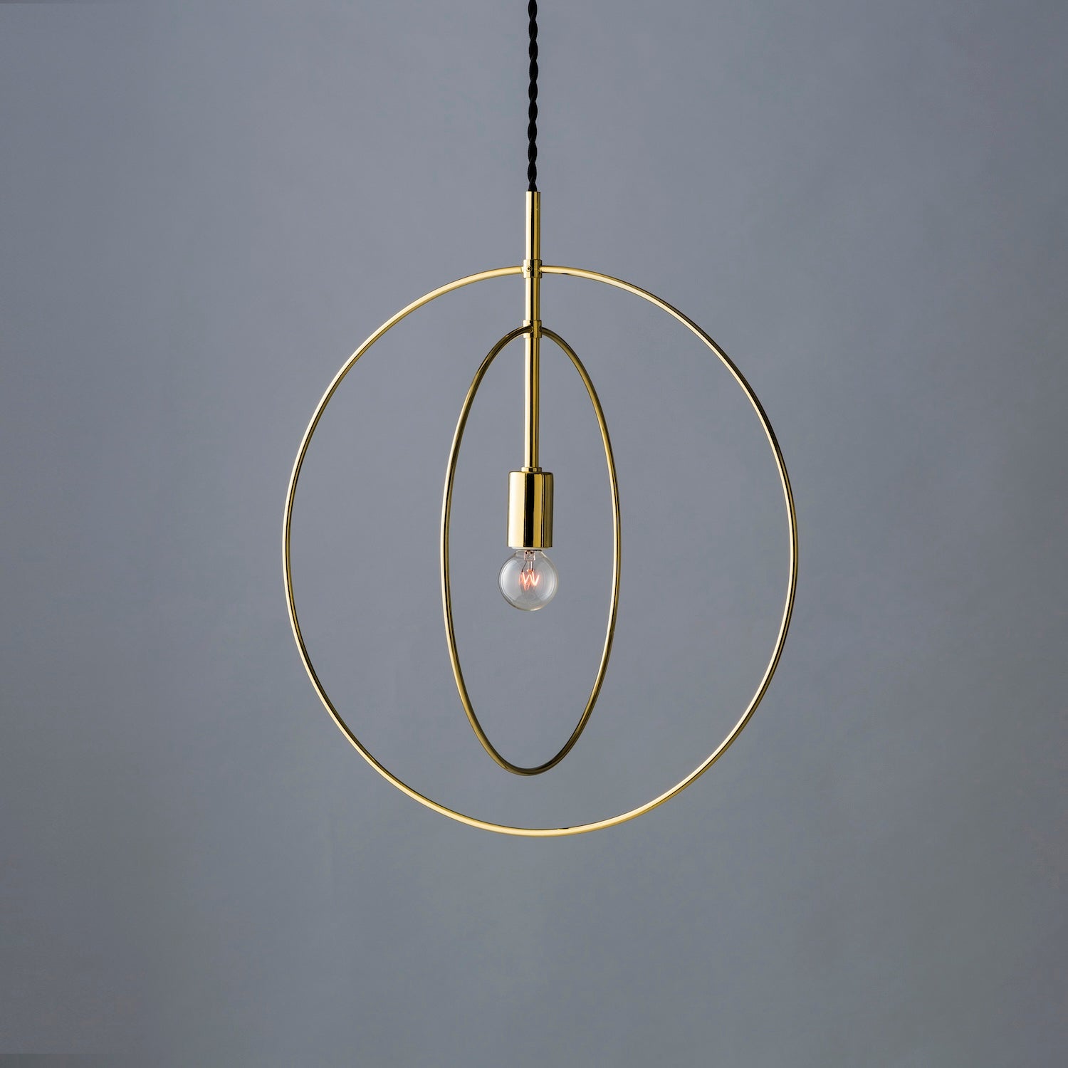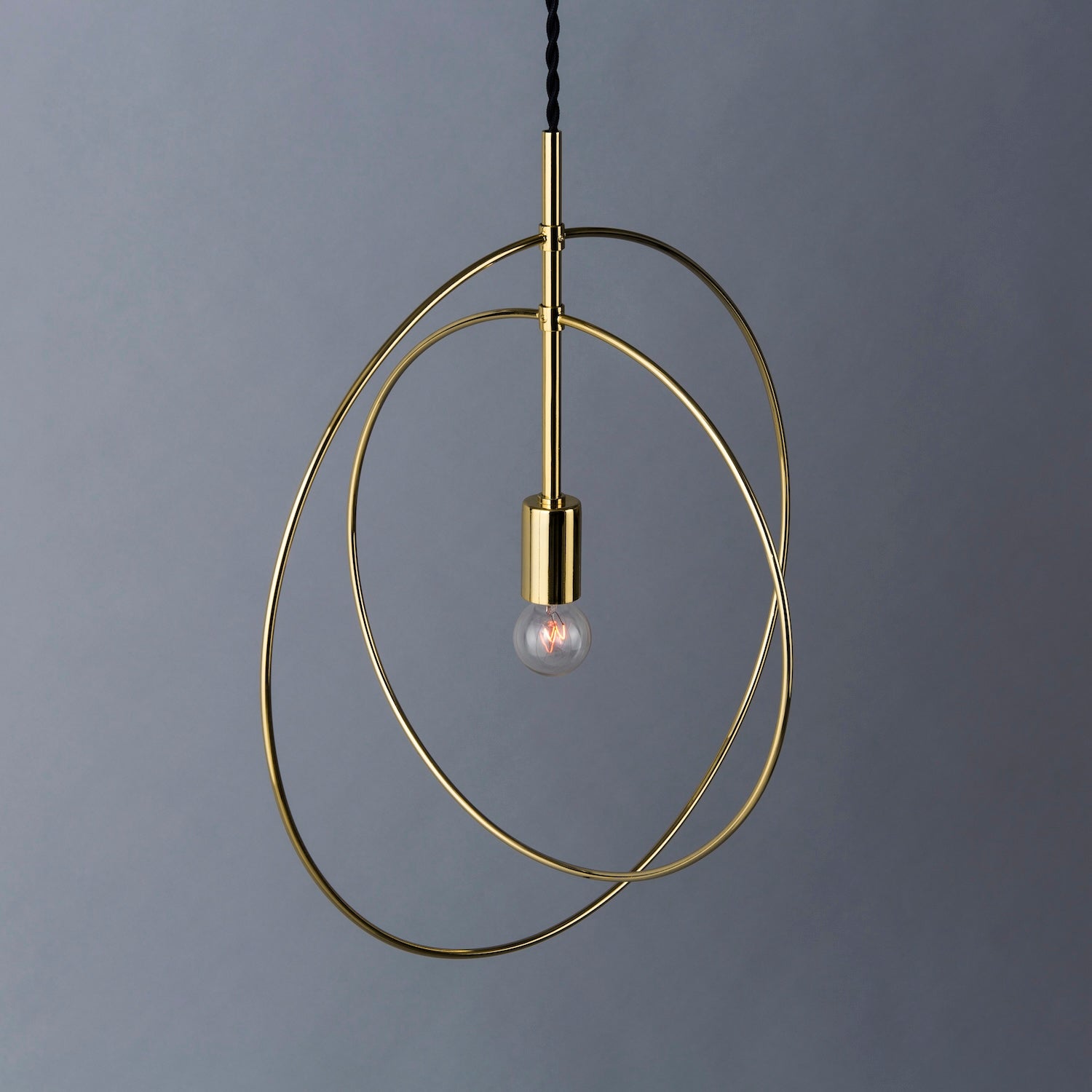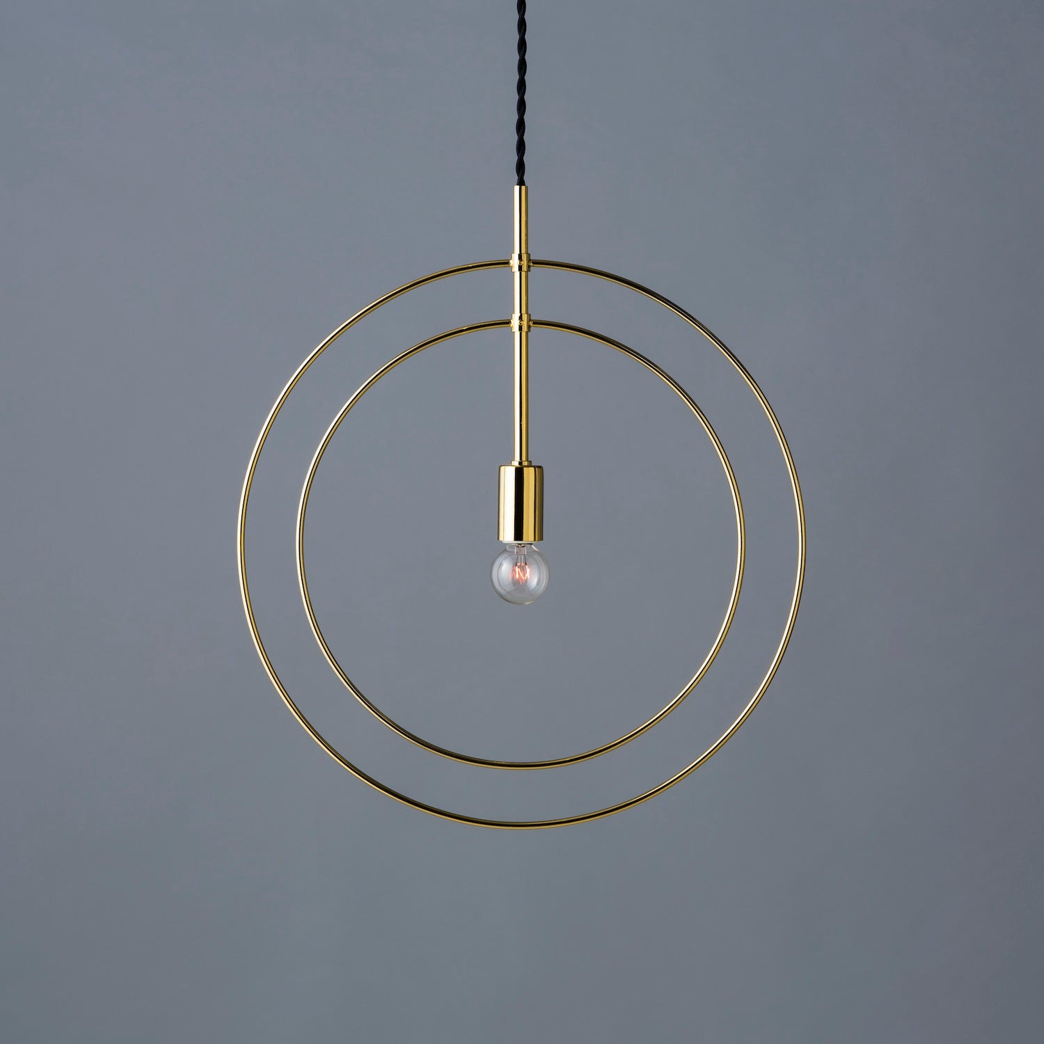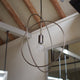 円形に加工された鉄の丸棒で構成し、繊細かつ象徴的な印象をもたせています。 一つ一つ職人の手により形成されており、シンプルな形ゆえに職人の技術の高さを感じる照明です。 円という象徴的な要素を二重に構成し、軽やかで美しい佇まいを醸し出します。 リング部分は小さいネジで固定されているため、角度を90度変えることも可能です。