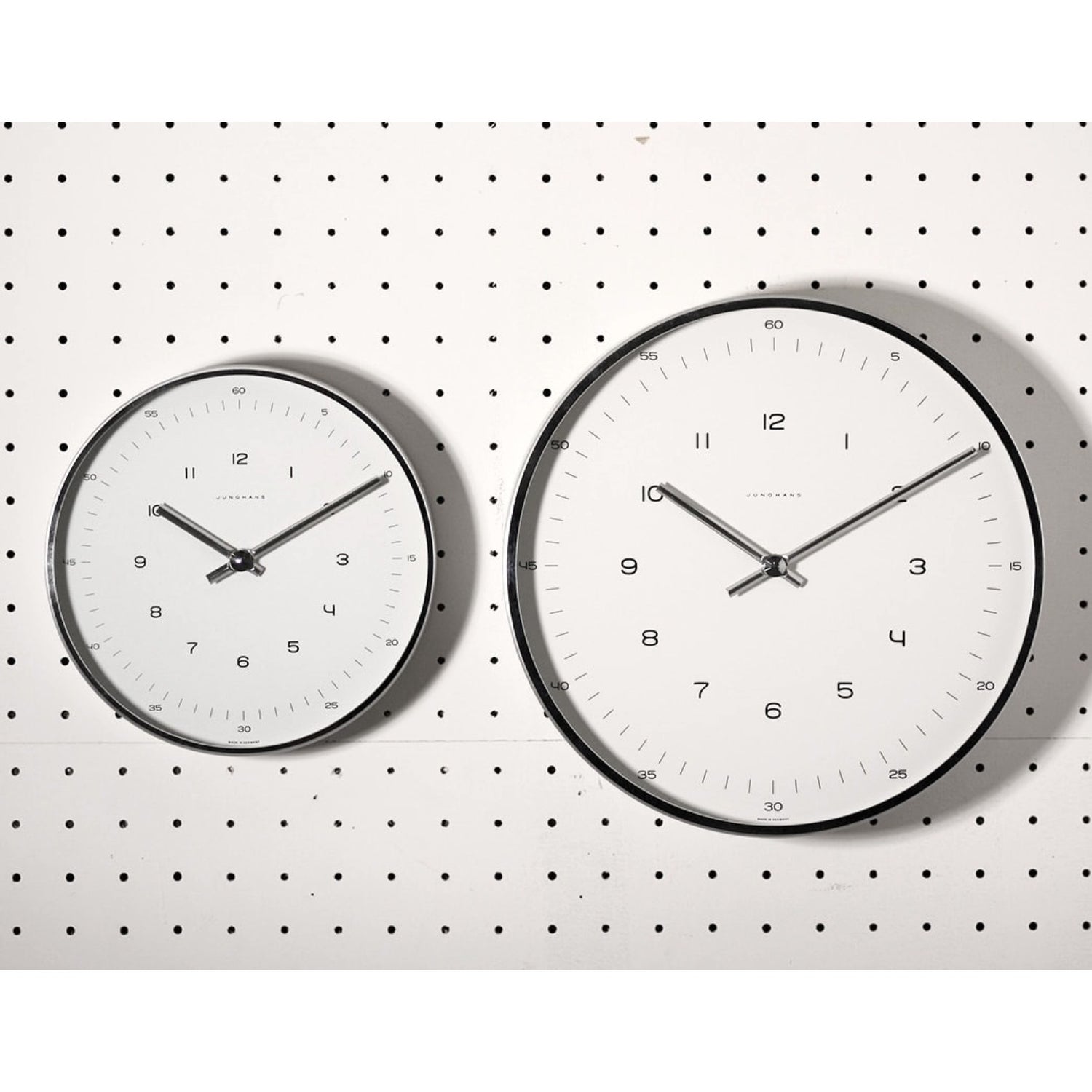数字指標タイプの掛時計です。分と時の両方の数字が表示されている文字盤は、台秤の目盛りのような質実剛健さが印象的です。細部まで考え尽くされたデザインは、「機能的で造形的にも美しく」というバウハウス出身のマックス・ビルの理念が具現化しています。ドイツで初めてクォーツ時計を発明し、精度にも定評があるユンハンス社の製品です。MoMAパーマネントコレクション選定品。
