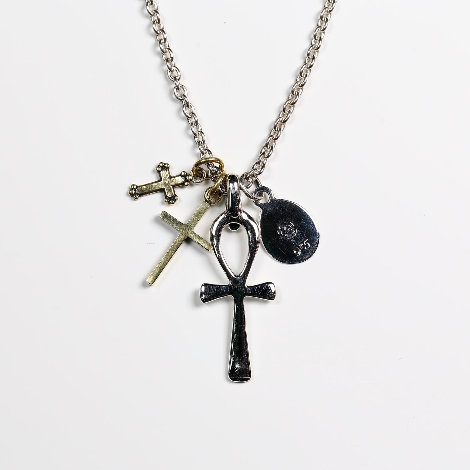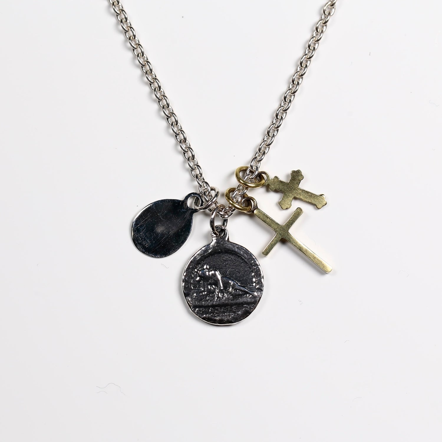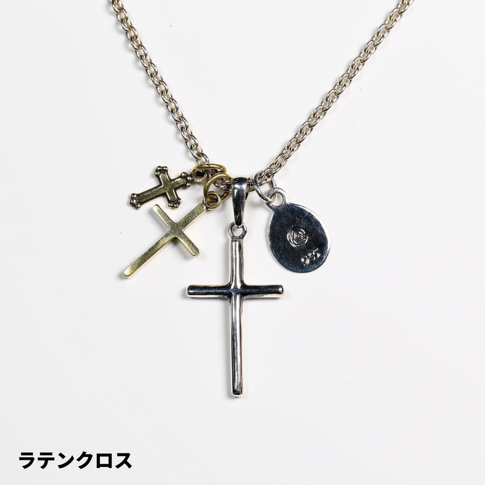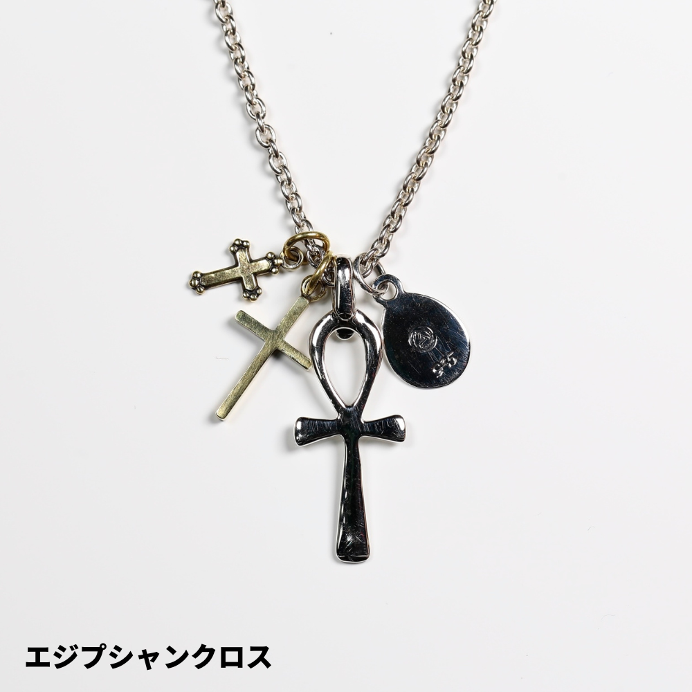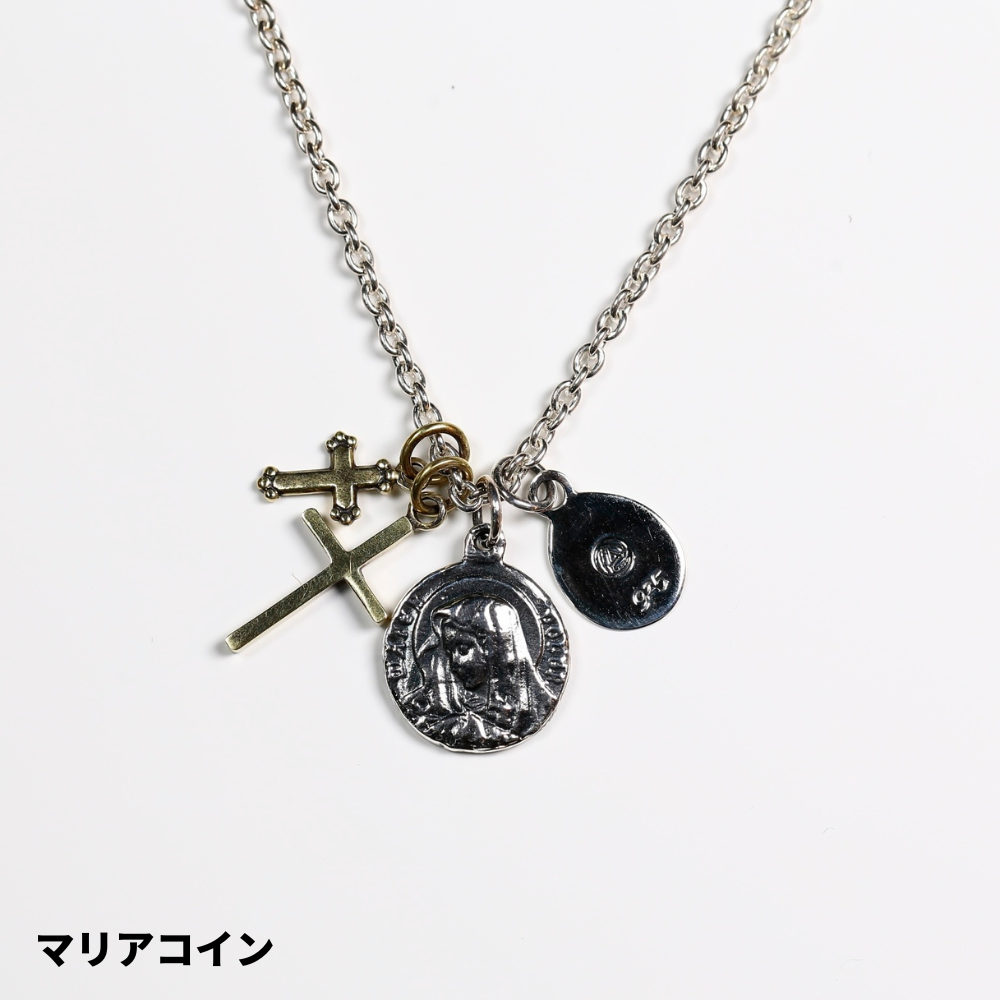 HATCH限定商品。シルバー製のラテンクロス、エジプシャンクロス、マリアコインをメイントップに配し、さらに大きさの異なる真鍮製クロスで構成したネックレス。マリアコインの裏には十字架を背負わされゴルゴダの丘でひれ伏すキリストが描かれています。引き輪の留め位置を変えれていただければ55cmと60cmでサイズ調節が可能です。レザーの巾着袋付属。