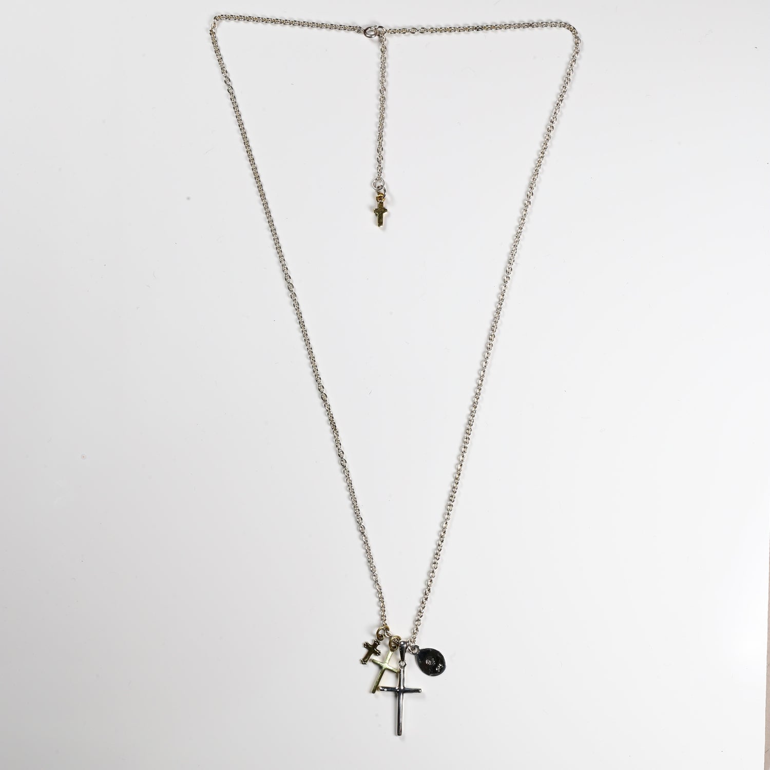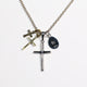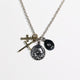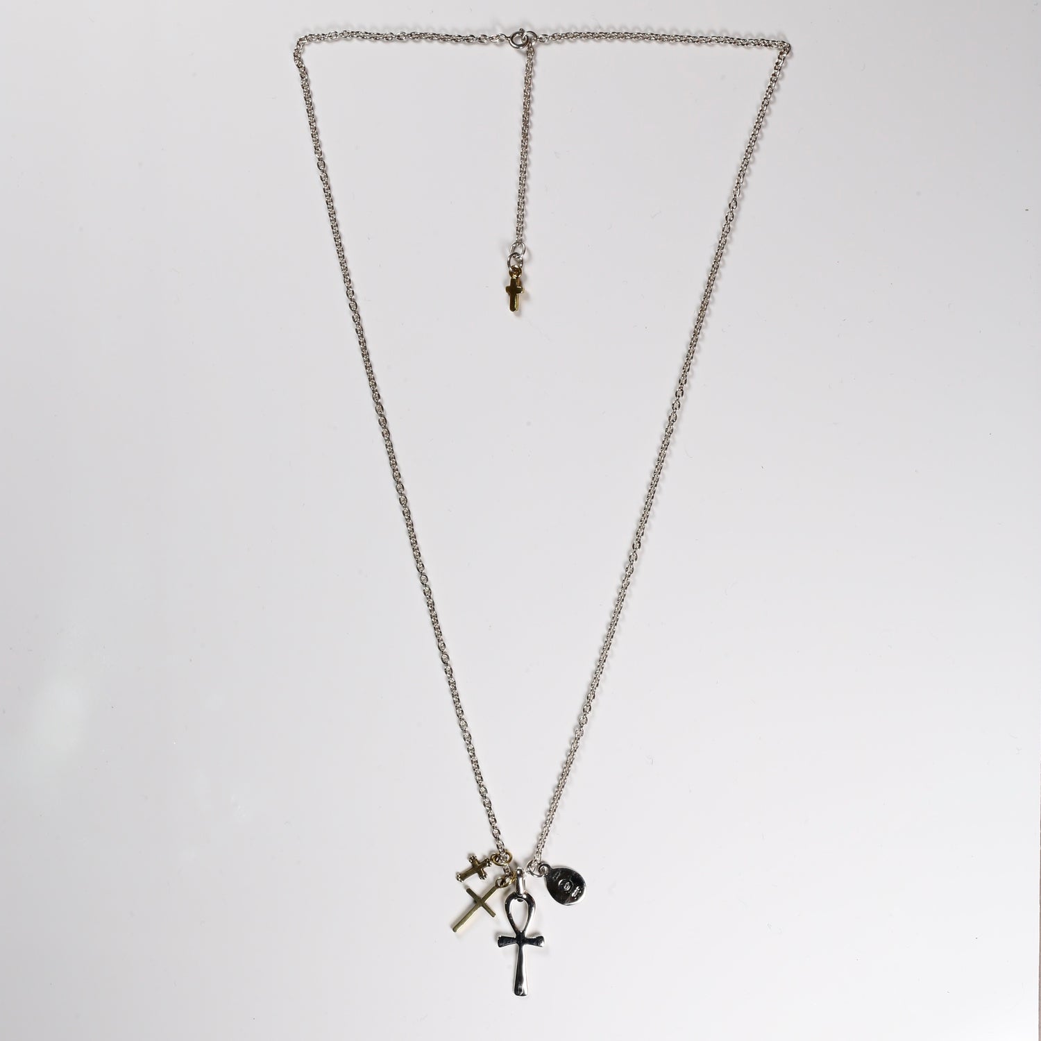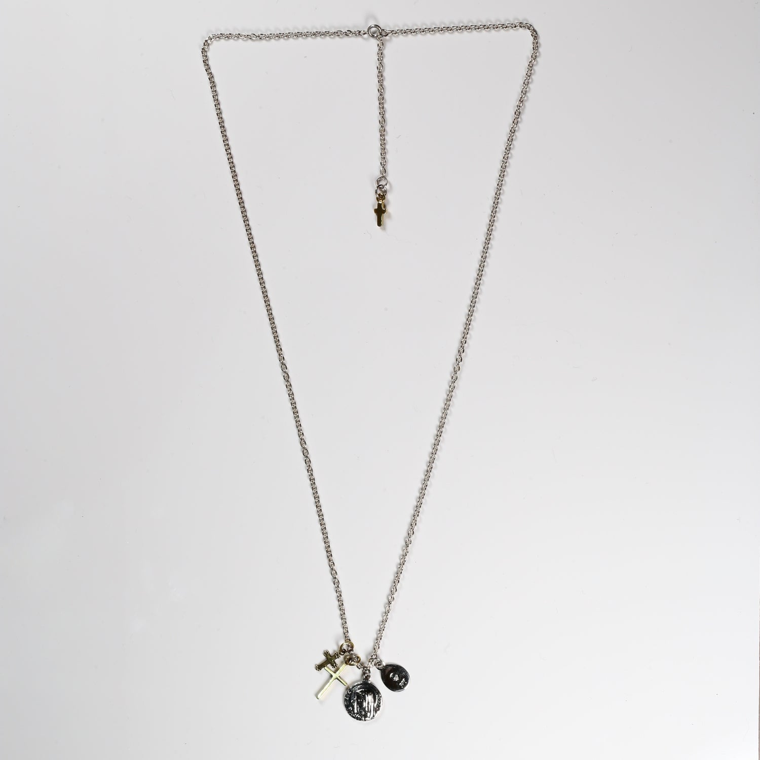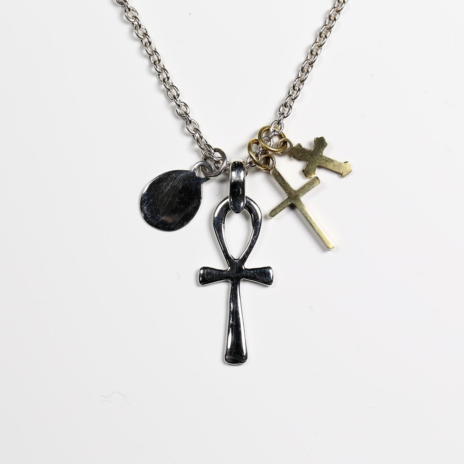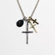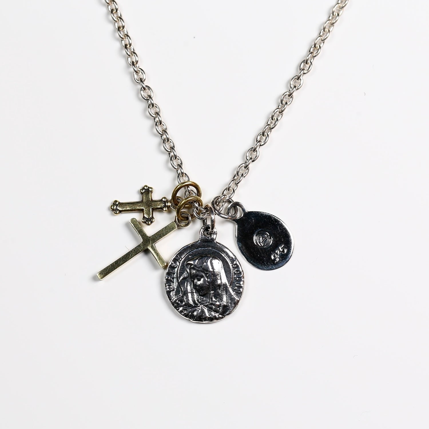 HATCH限定商品。シルバー製のラテンクロス、エジプシャンクロス、マリアコインをメイントップに配し、さらに大きさの異なる真鍮製クロスで構成したネックレス。マリアコインの裏には十字架を背負わされゴルゴダの丘でひれ伏すキリストが描かれています。引き輪の留め位置を変えれていただければ55cmと60cmでサイズ調節が可能です。レザーの巾着袋付属。